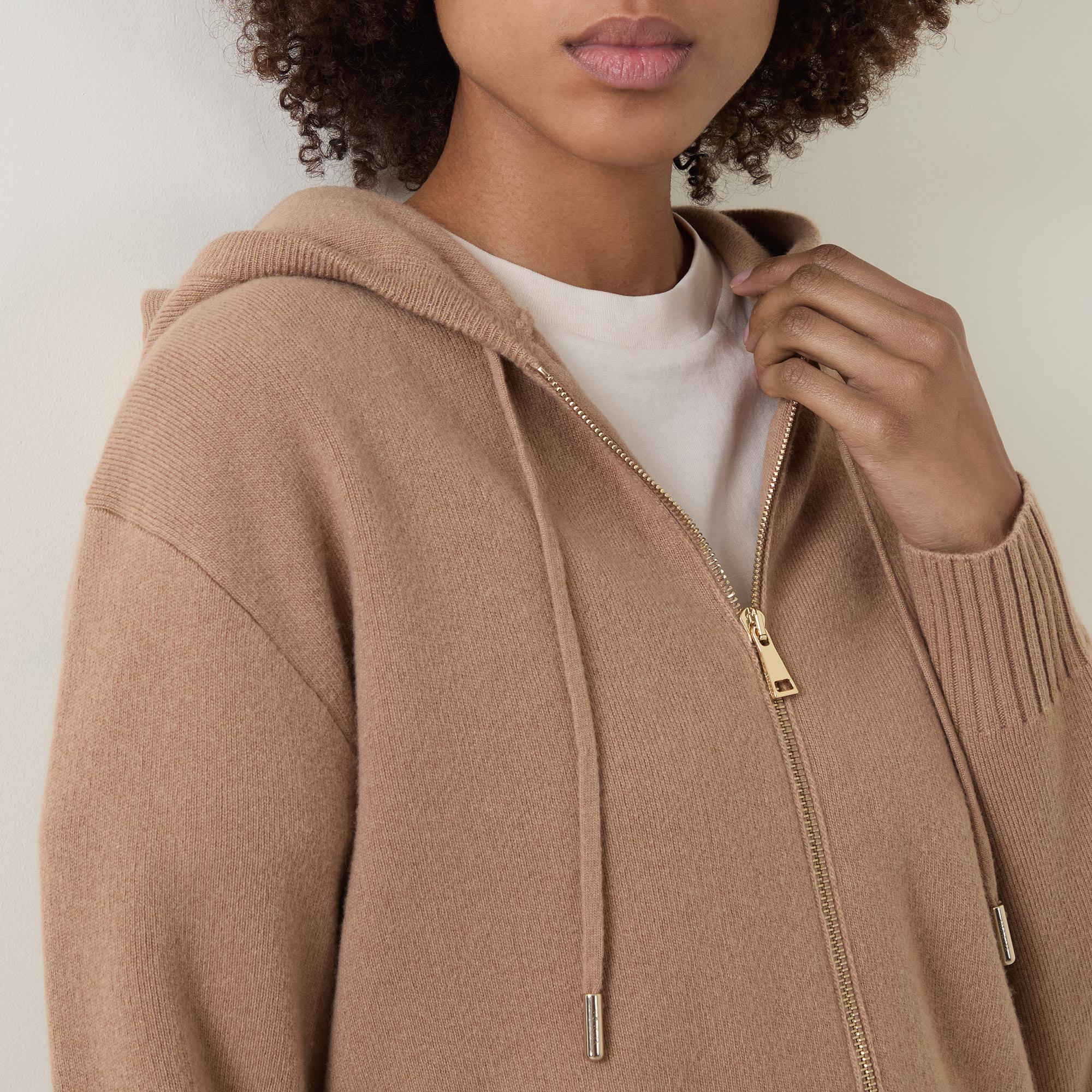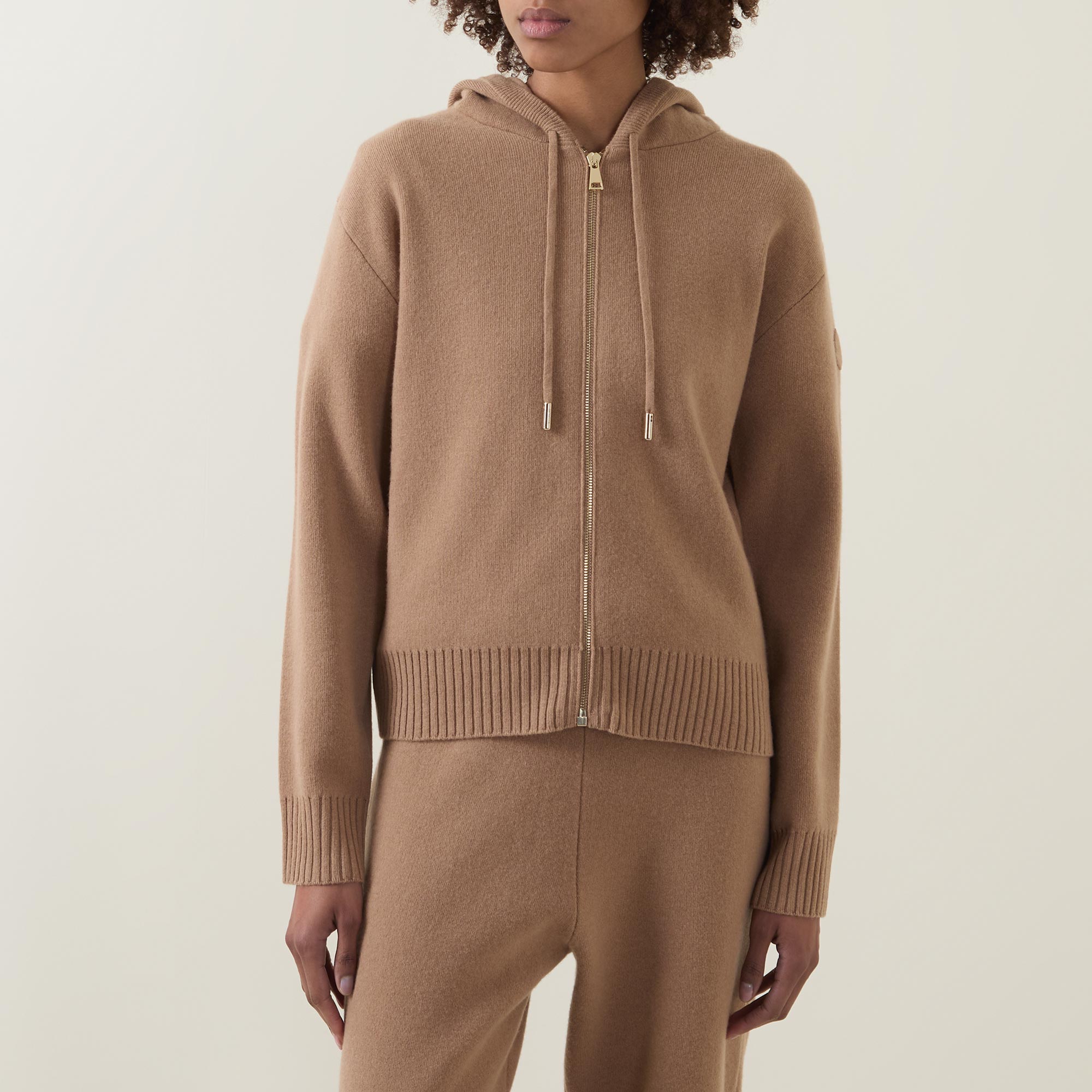 - Hood with adjustable drawstring fastening, dropped shoulders, long sleeves, felt logo detail, front zip fastening, straight hem, slightly cropped length, ribbed trims, gold-tone hardware, knit construction, soft finish