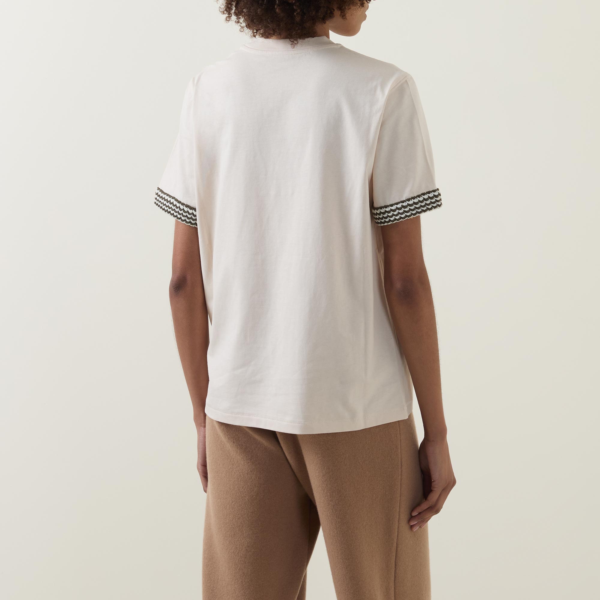 - Round neckline, short sleeves with tipped cuffs, dropped shoulders, contrasting logo patch, tonal stitching, straight hemline, smooth fabric
