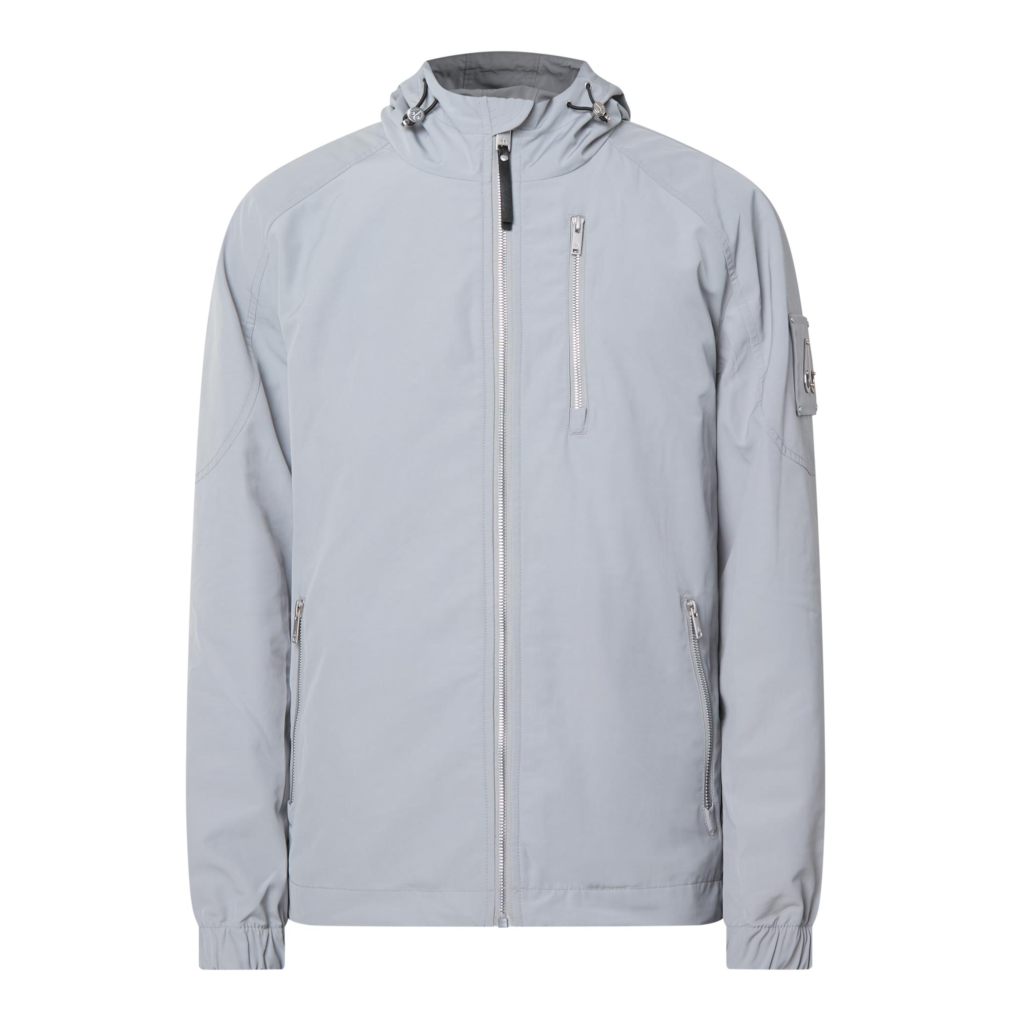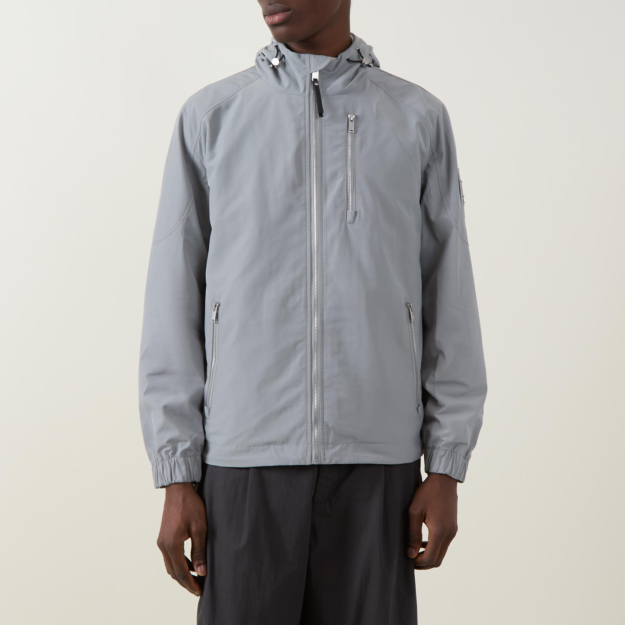 - Front zip fastening, three zip slit pockets, drawstring hood, long sleeves, brand logo patch, elasticated cuffs