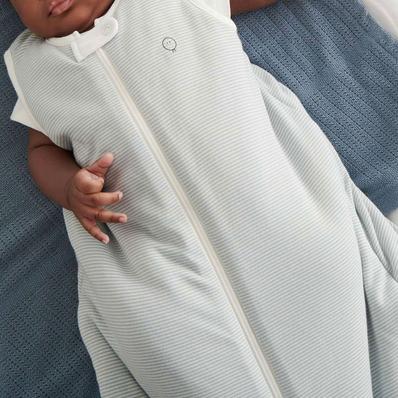 - 1.5 TOG, soft fabric, striped design, concealed front zip fastening, sleeveless, round neckline, contrast binding, popper fastening, striped design, brand logo detail, adjustable to grow with your baby or toddler