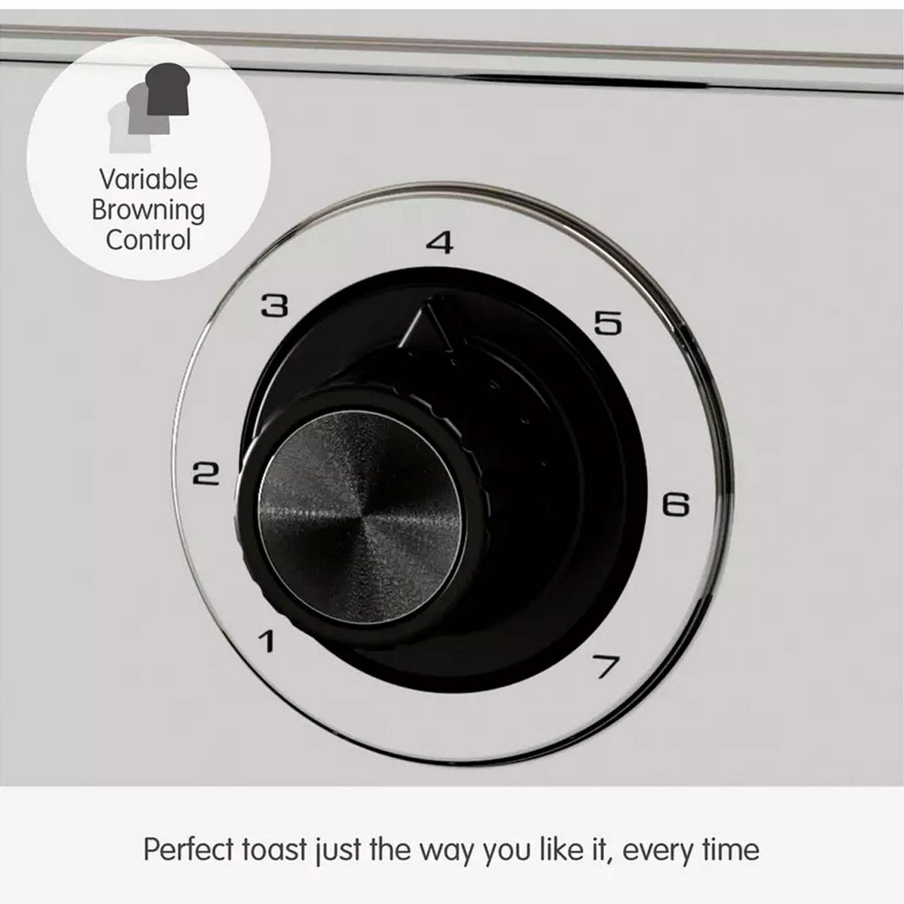 Classic retro styling with all the necessary functional features, let Venture make a statement in your kitchen. With seven different settings, you can be sure to get perfect toast for everyone. The levers can be used to lift bread above the toaster, allowing it to be easily removed. The crumb tray collects any crumbs and the built-in cord tidy enables you to keep your worktop tidy.