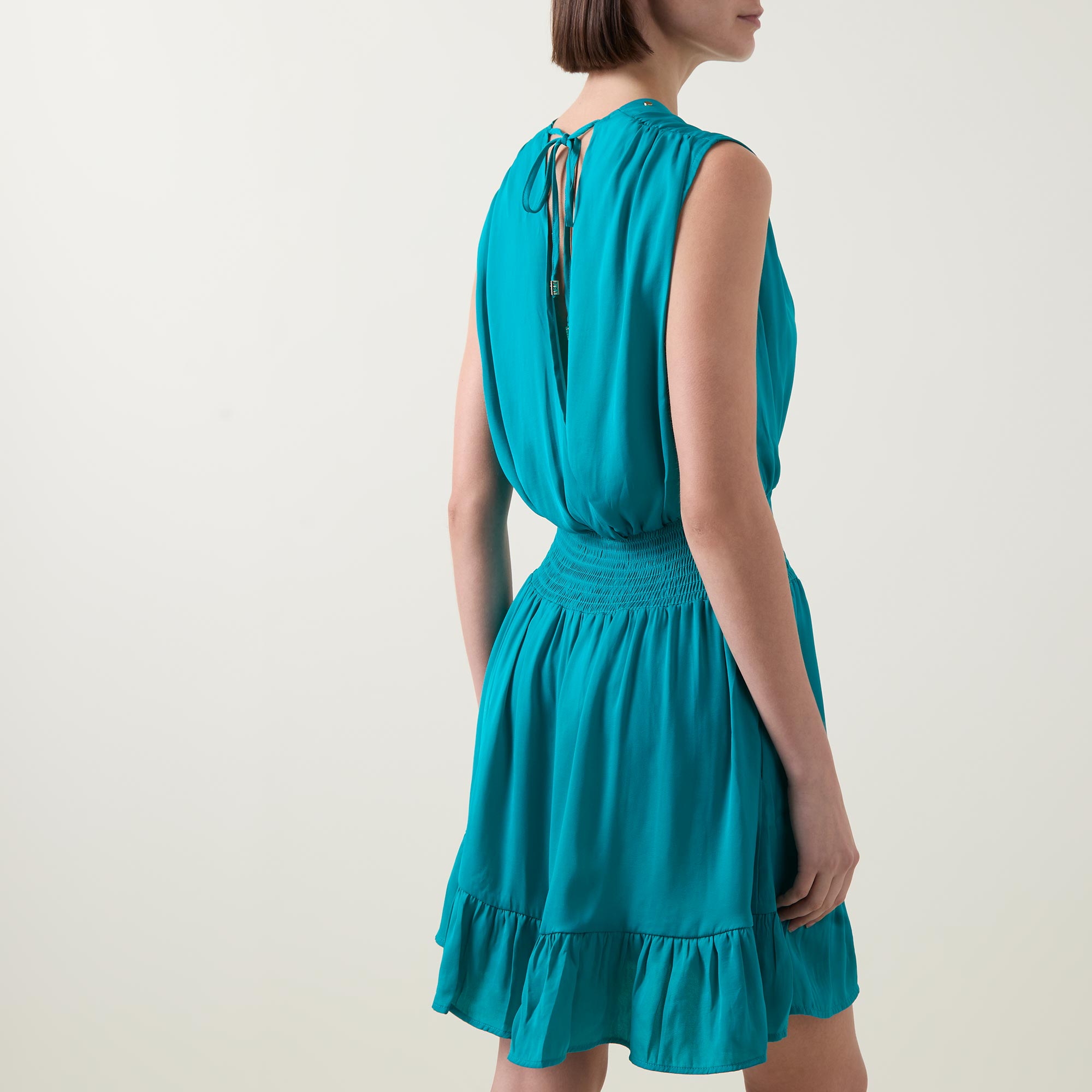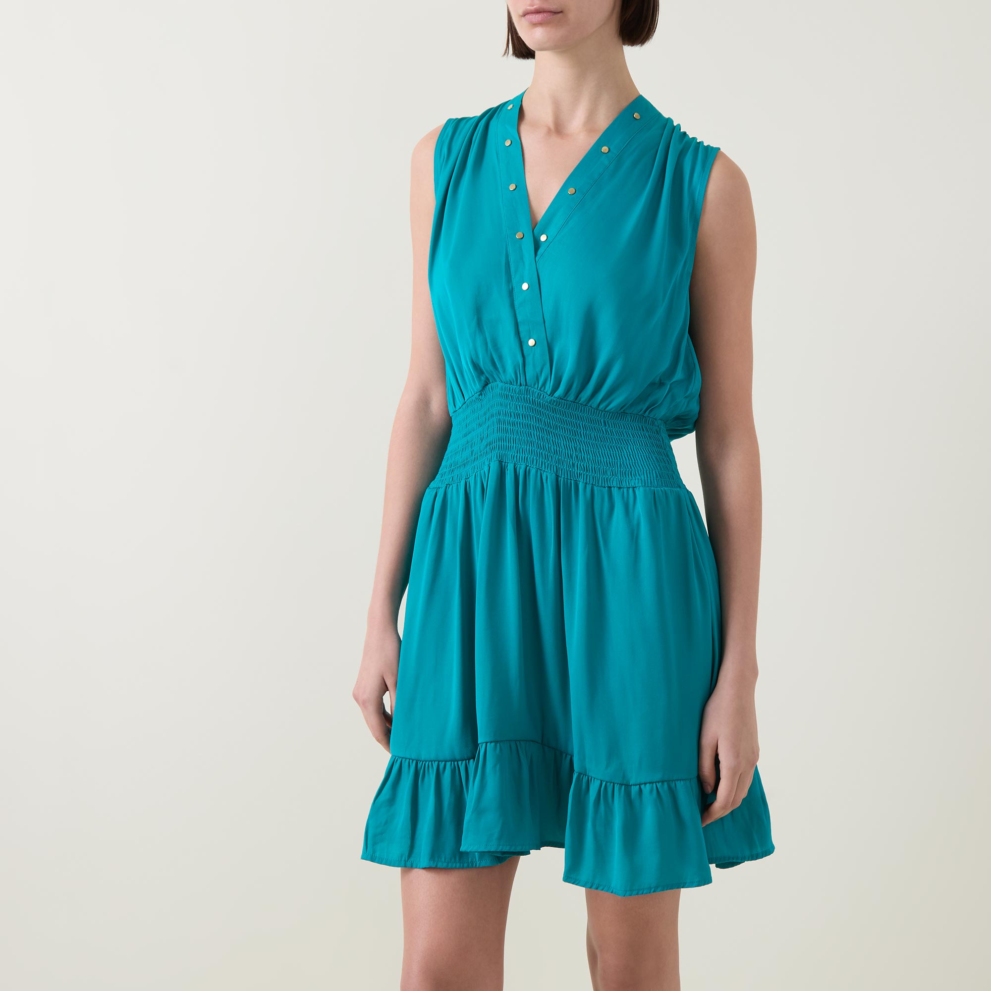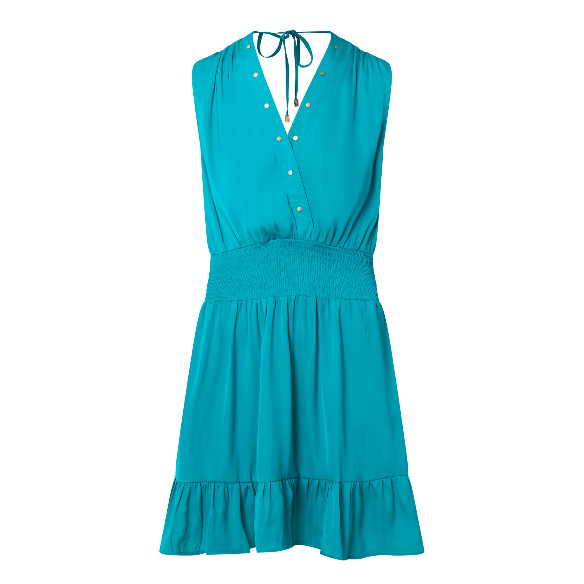 - V-neckline, wrap-style design, sleeveless, rear tie fastening, cinched waistline with shirring, drop flare hem, studded detailing, mini length
