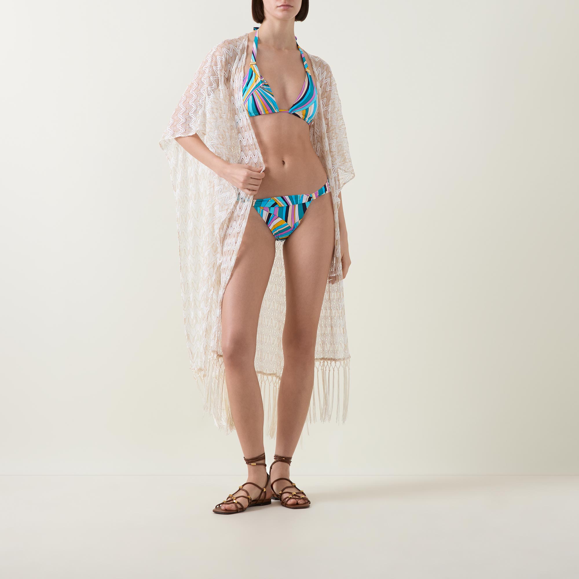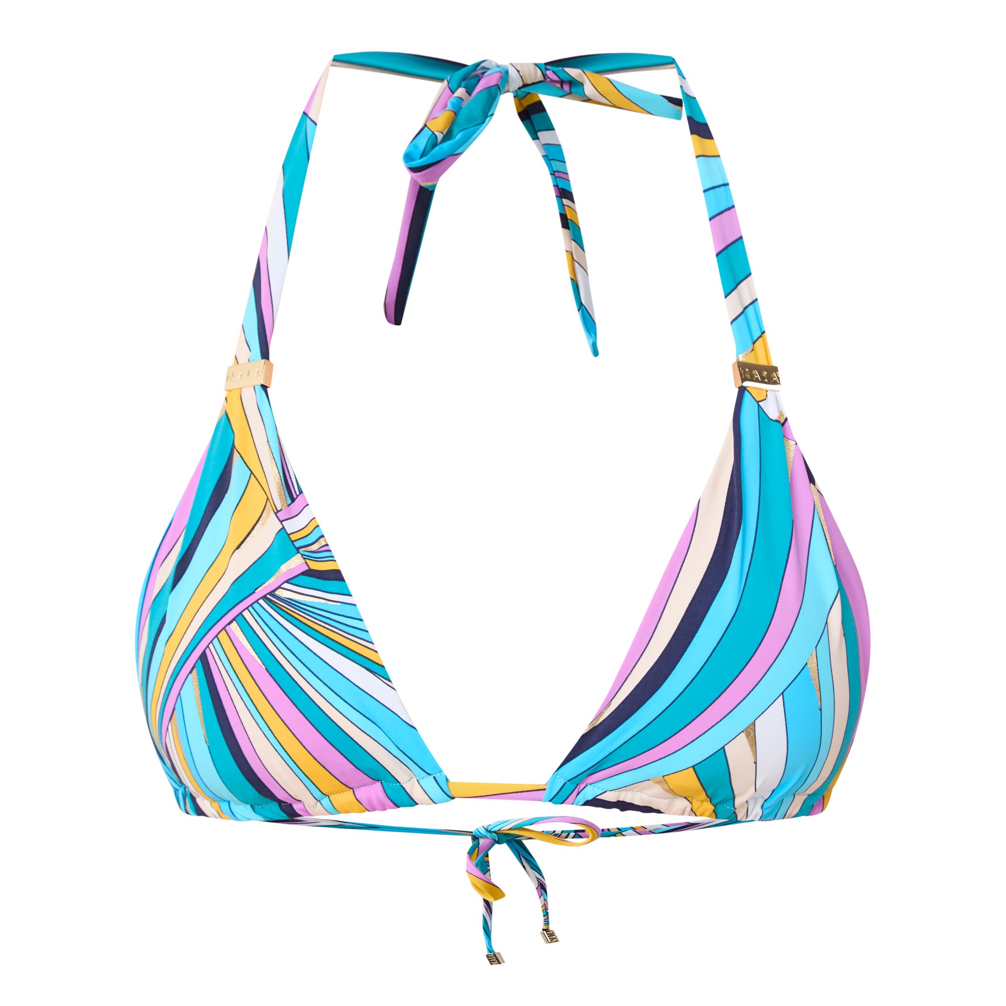 - Halter neckline, rear closure, tie fastenings, triangle silhouette, gold-tone hardware, printed design, smooth finish