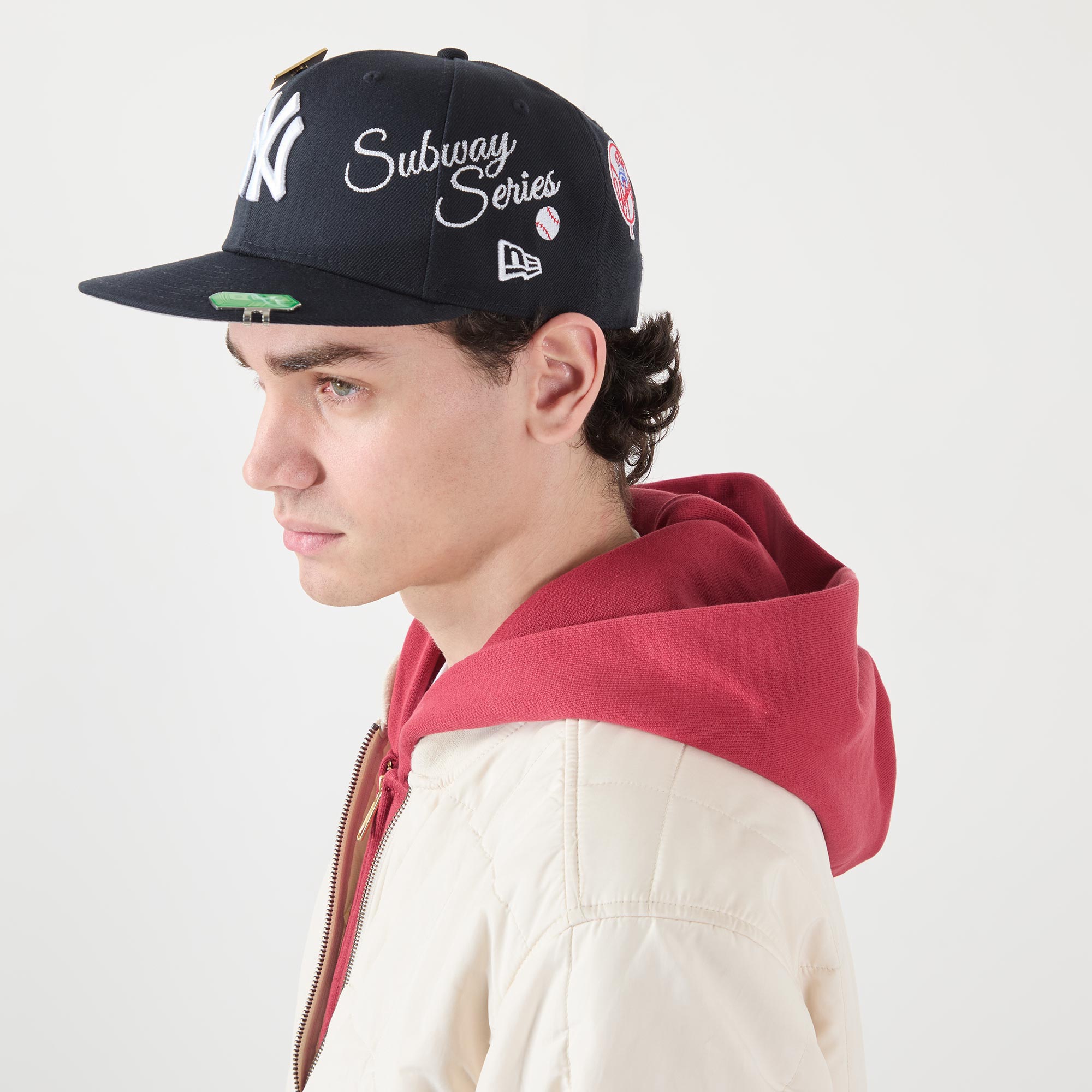 - New York Yankees logo on front, Subway Series sidepatch on right, Subway Series script with Baseball embroidered from front left panel to middle left panel, Cooperstown Yankees patches on left and right rear panels, Yankees arch wordmark on rear, MLB logo on rear, Subway Series script wordmark on right side of undervisor, 59FIFTY pin badge of right of crown, New Era Cash visor clip on left side of visor, New Era Flag embroidered on left, structured crown, fitted, flat visor