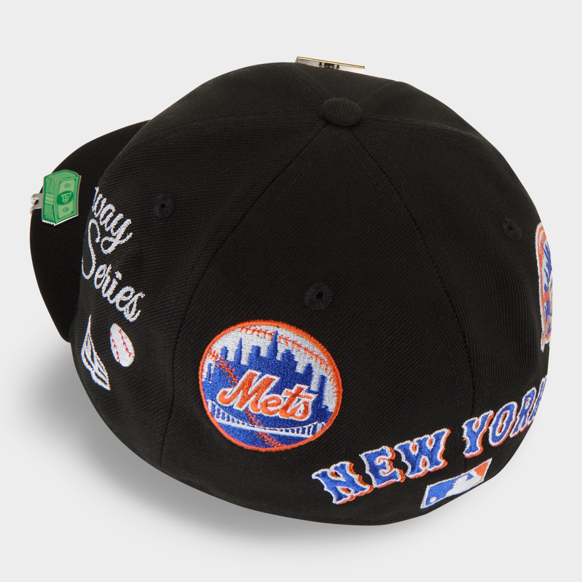 - New York Yankees logo on front, Subway Series sidepatch on right, Subway Series script with Baseball embroidered from front left panel to middle left panel, Cooperstown Yankees patches on left and right rear panels, Yankees arch wordmark on rear, MLB logo on rear, Subway Series script wordmark on right side of undervisor, 59FIFTY pin badge of right of crown, New Era Cash visor clip on left side of visor, New Era Flag embroidered on left, structured crown, fitted, flat visor