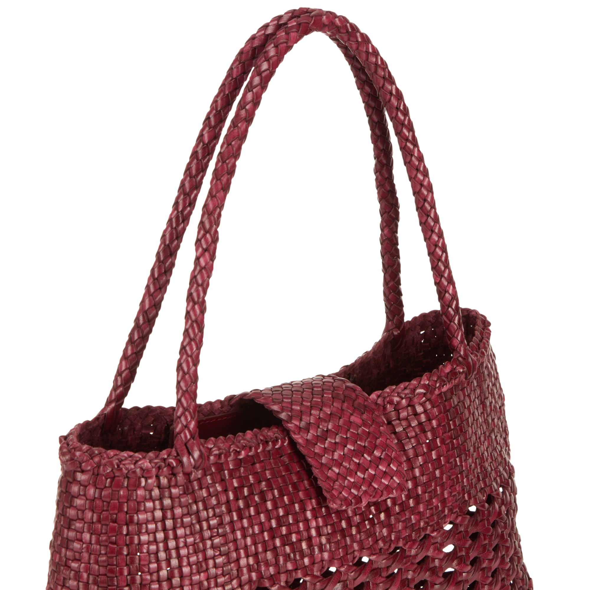 • Braided top handles, magnetic snap tab fastening, woven design, gold-tone hardware, antiqued St. Christopher medal charm, dust bag included