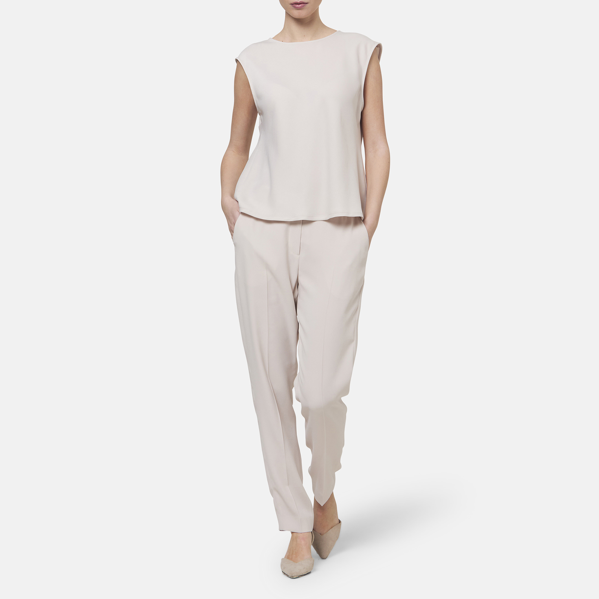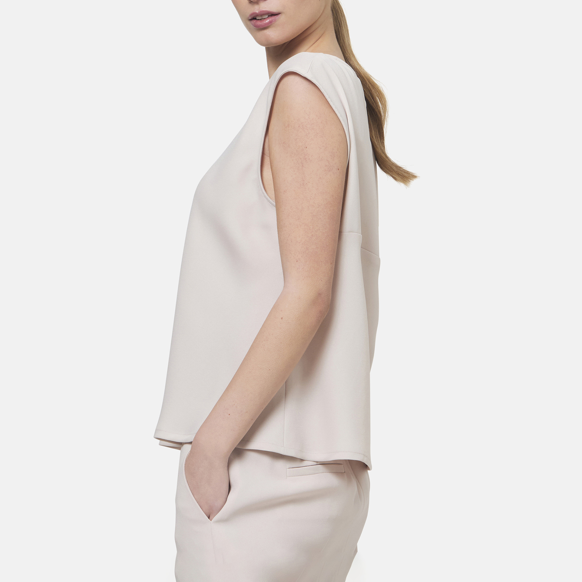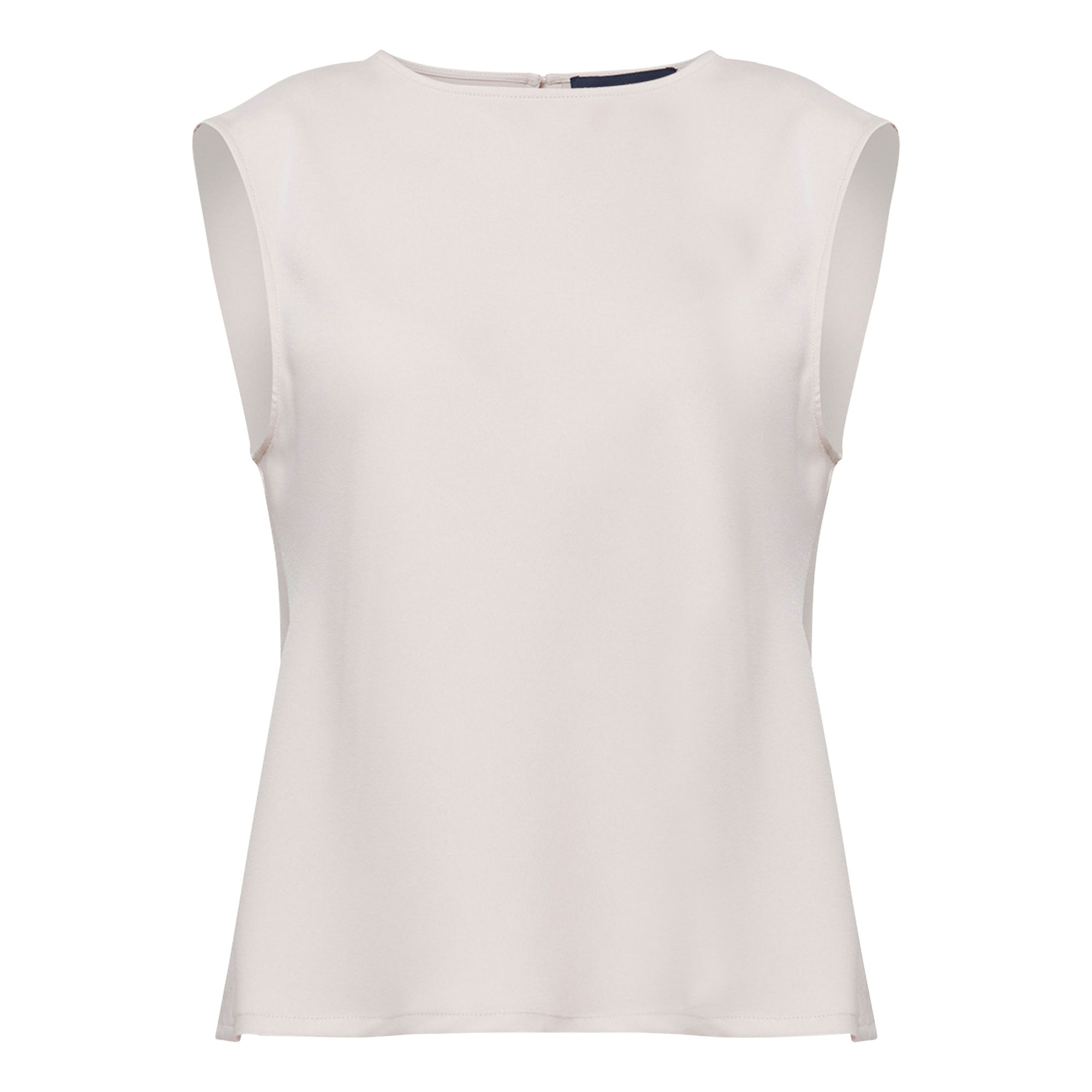 • Boat neckline, rear keyhole and button fastening, cap sleeves, straight hem, tonal stitching, smooth finish