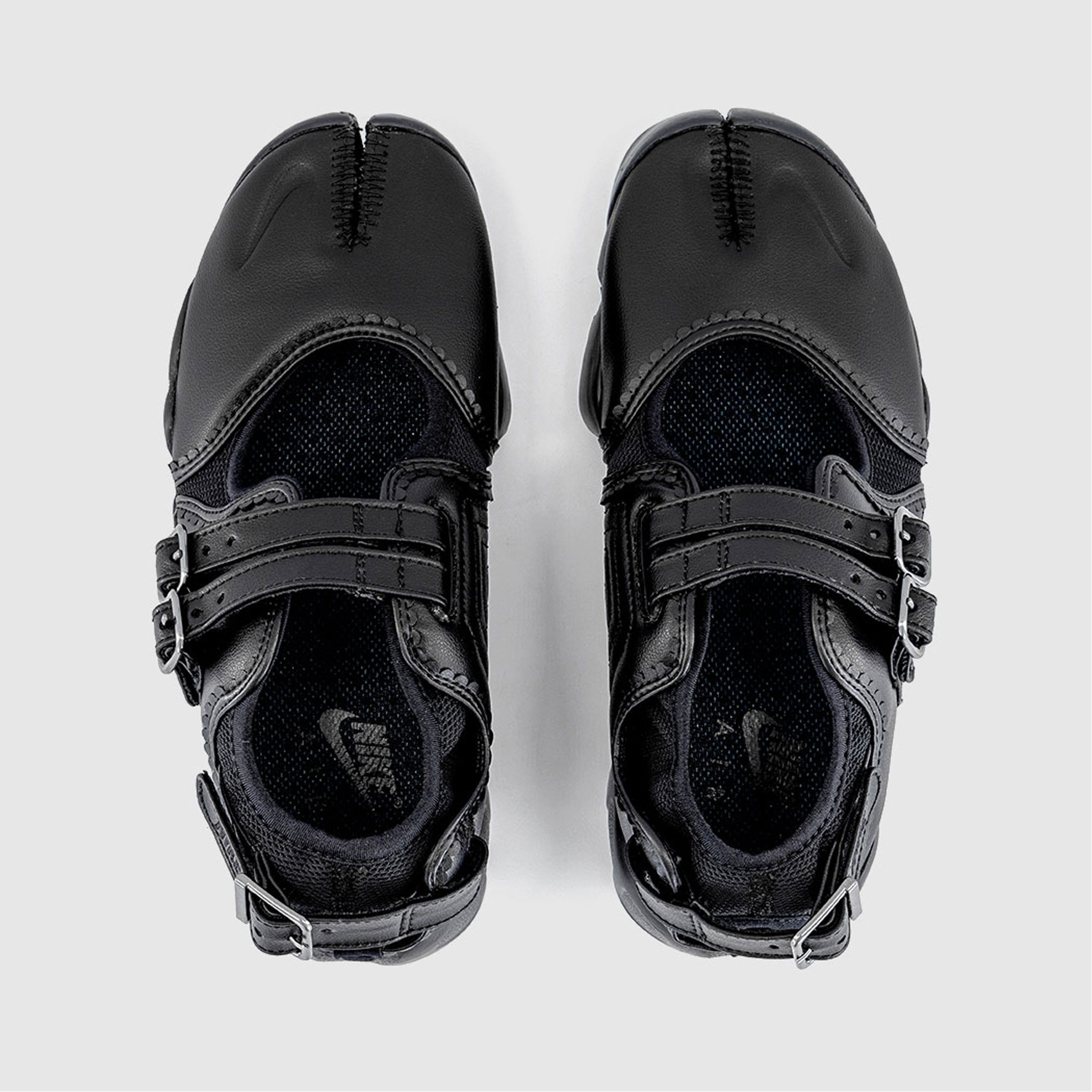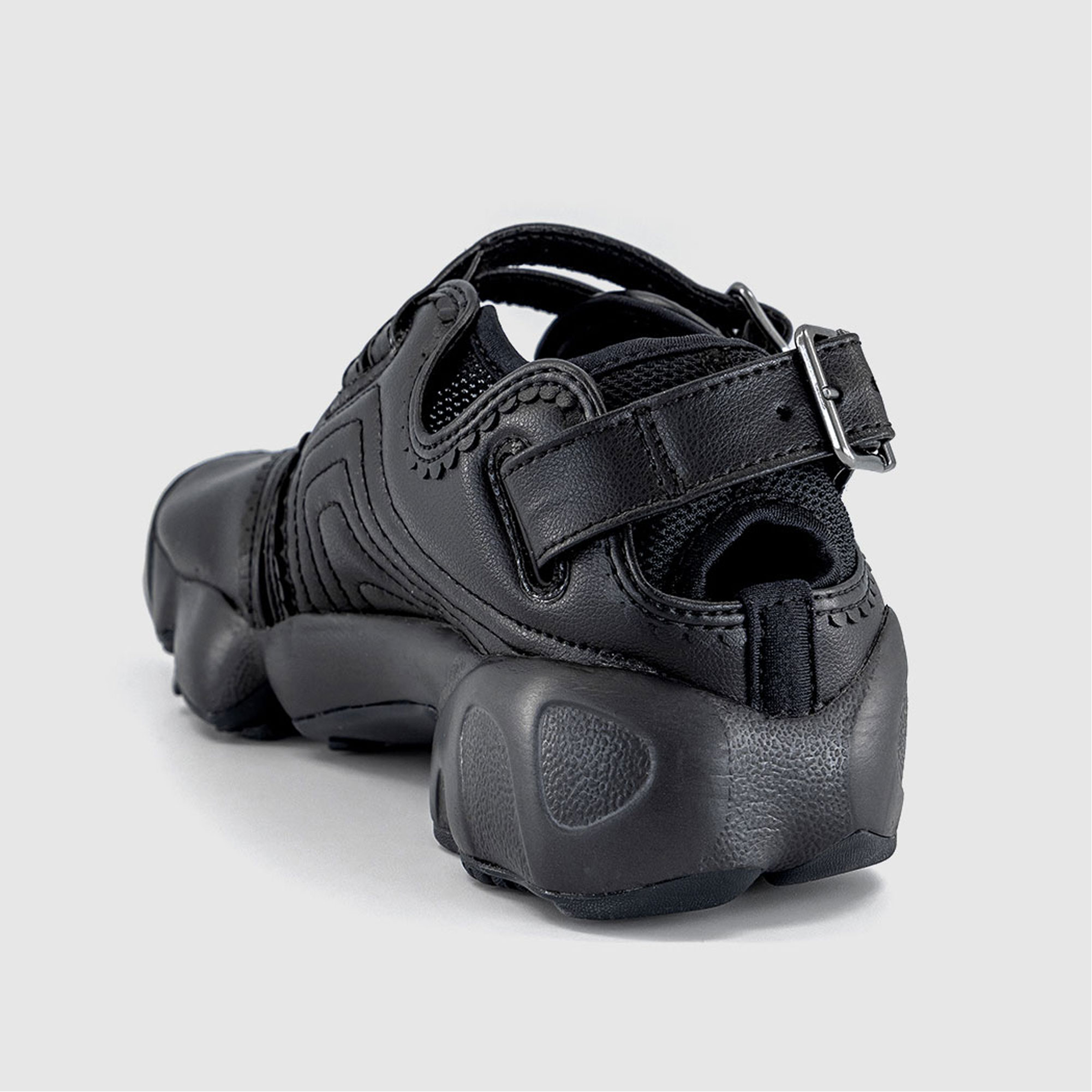 - Buckle fastening, slit-toe style, foot-hugging textile upper, secure adjustable strap, buckle detail