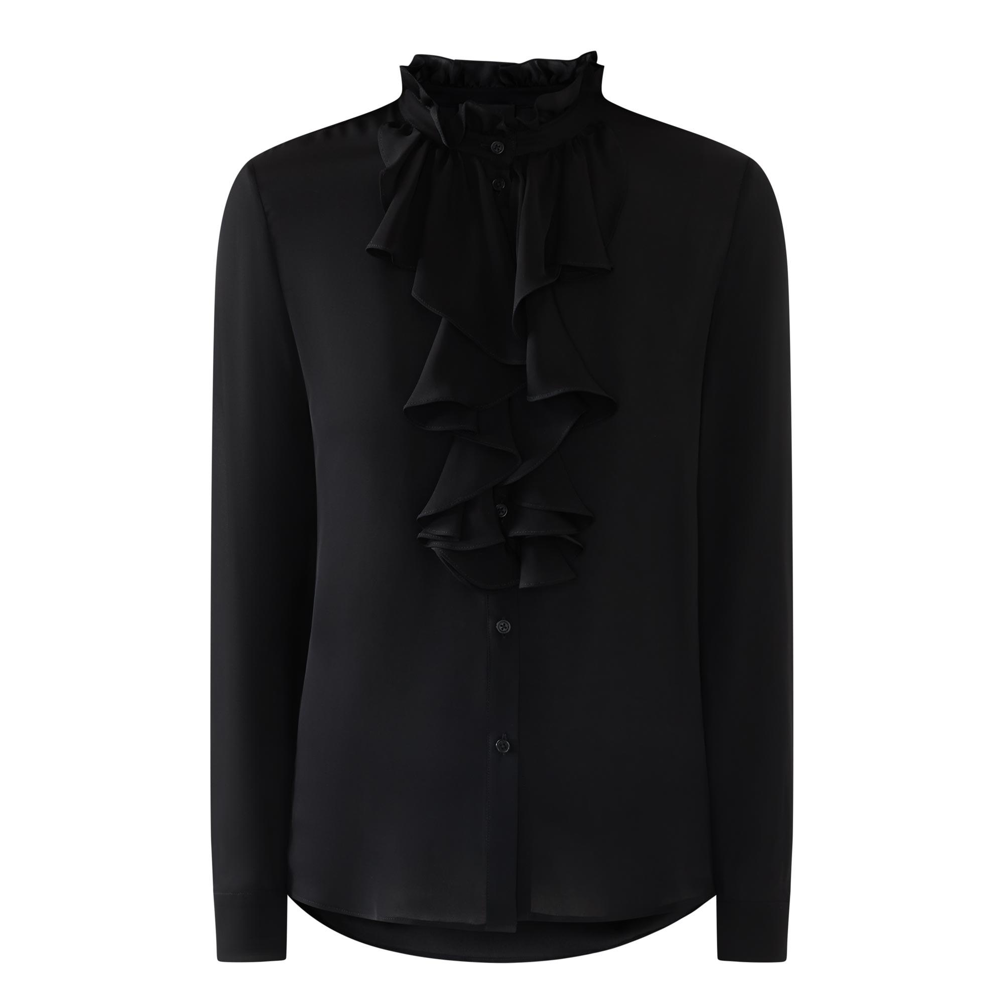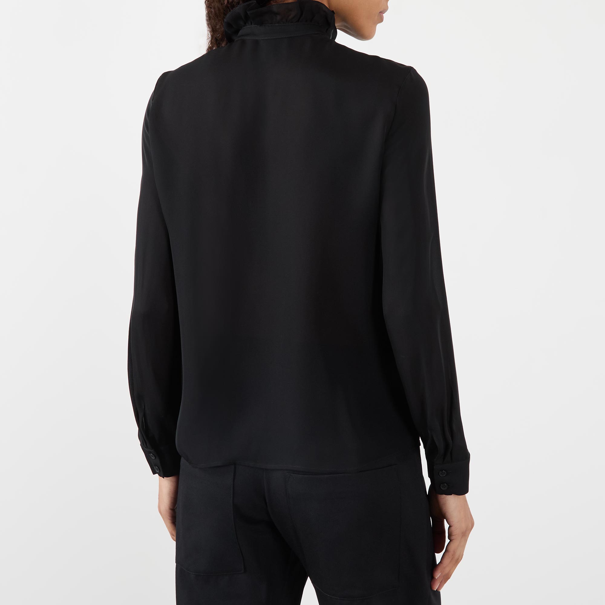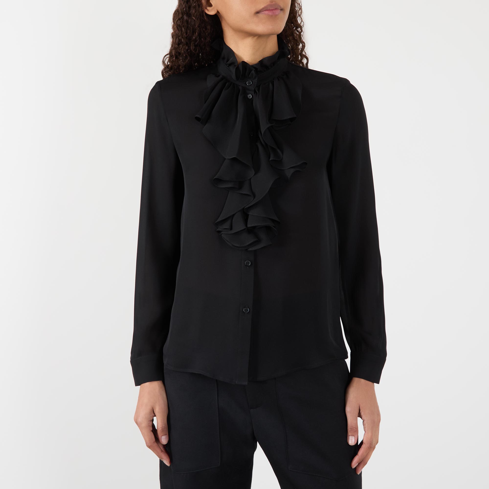 - Stand collar with ruffle detailing, long sleeves, buttoned cuffs, front placket, curved hem, tonal stitching