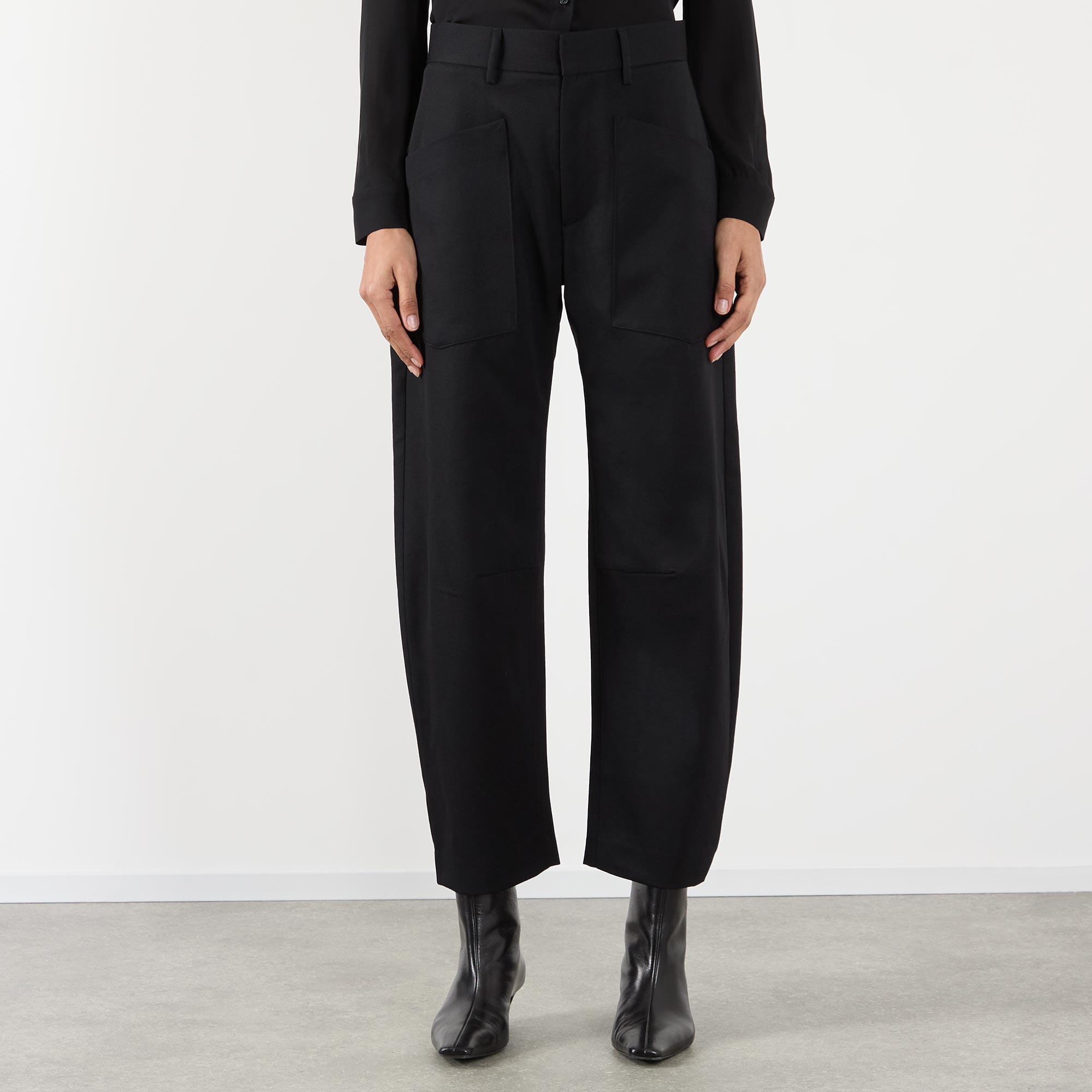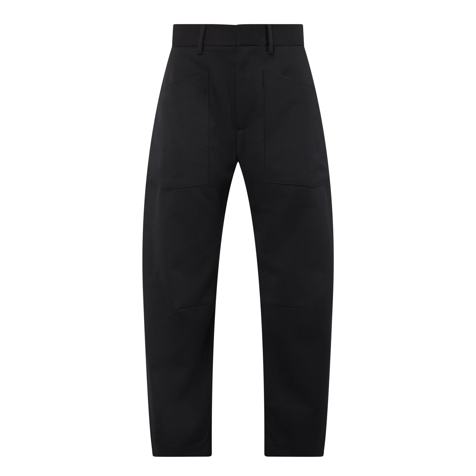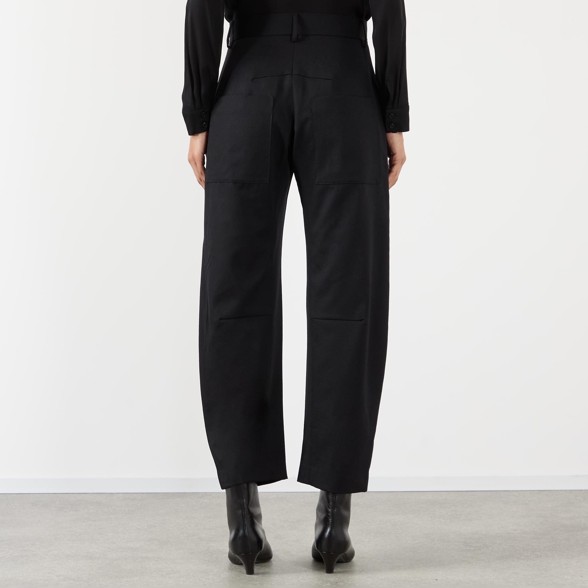 - Mid-rise, barrel leg, belt loops, zip fly with button fastening, flat front, top-stitched front and back patch pockets, dart-detailed legs, soft wool finish
