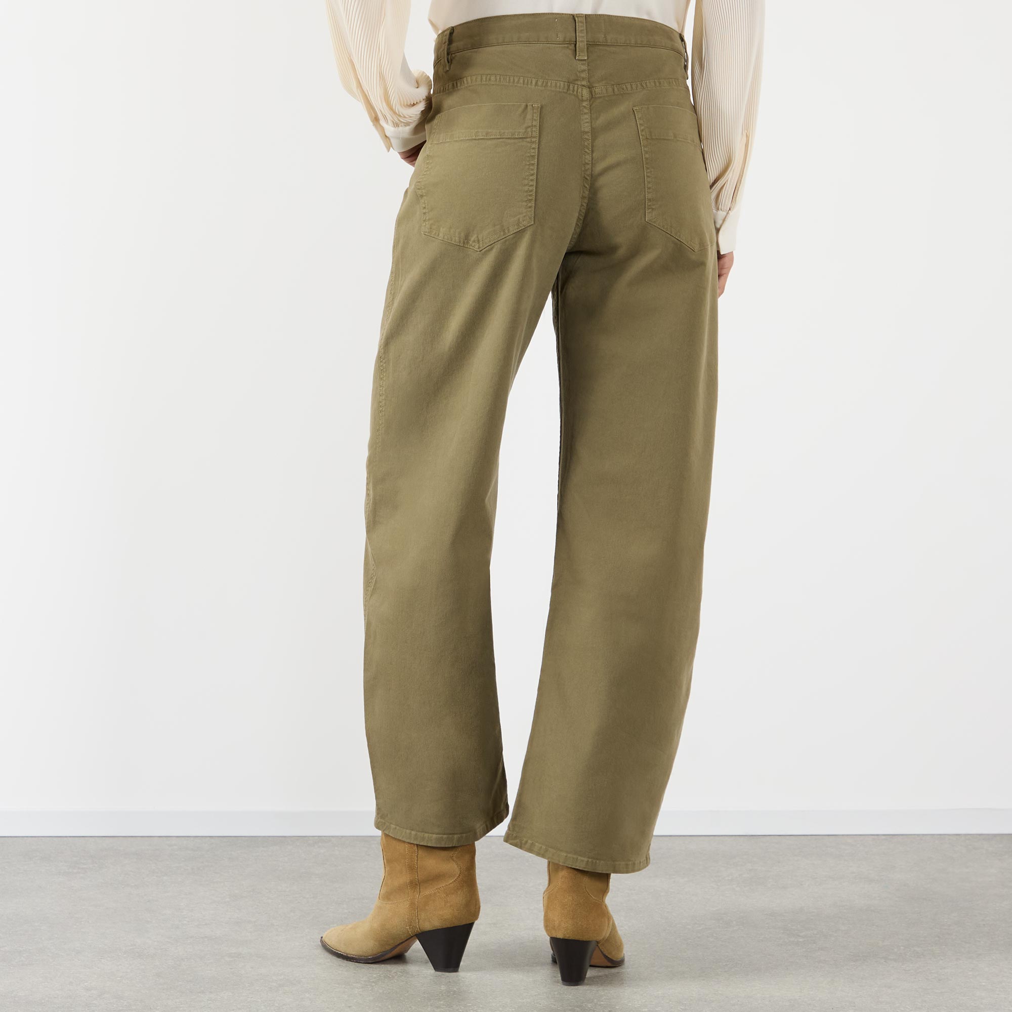 - Mid-rise, barrel leg, belt loops, concealed hook and bar with fly zip closure, side entry pockets, rear pockets, coin pocket, clean hems, Italian brushed stretch twill fabric