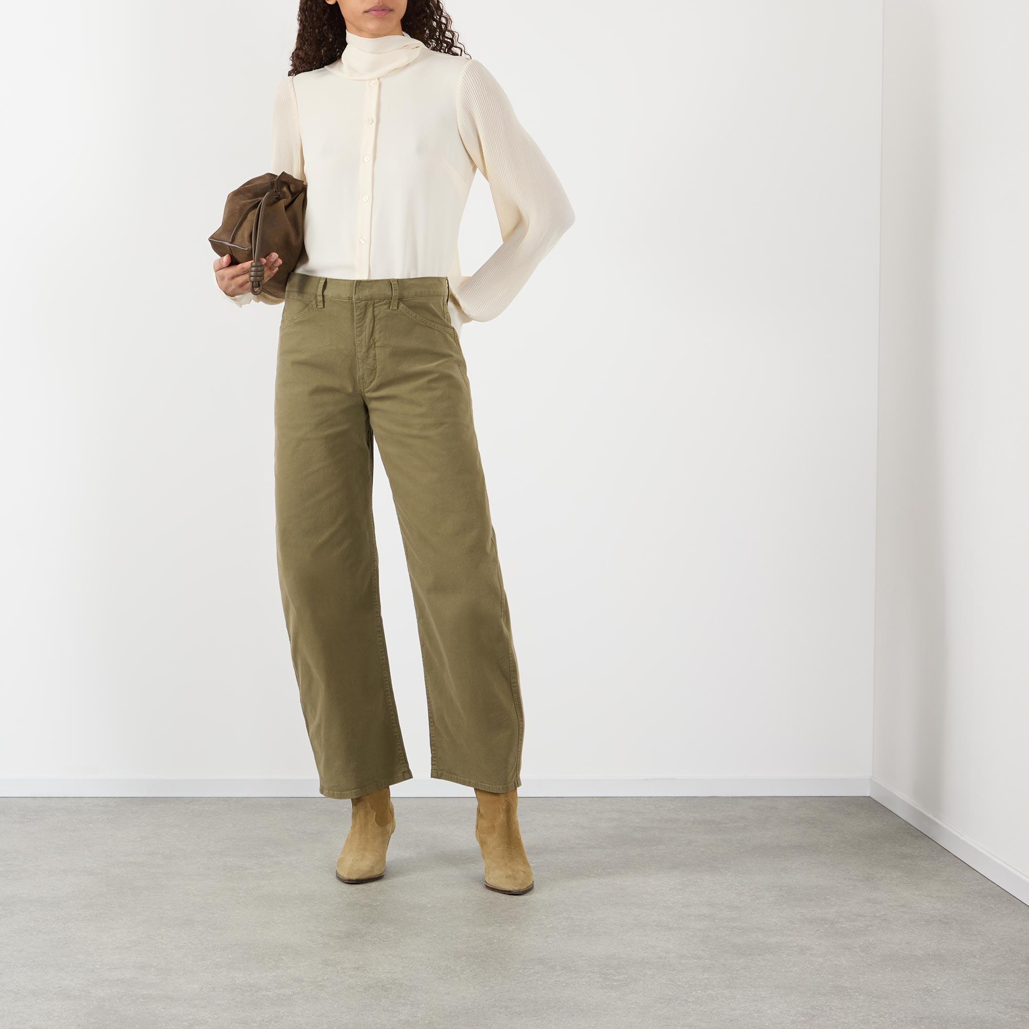 The classic Tribeca trousers from Nili Lotan appear in a new fabric for SS26. Cut from an Italian brushed stretch twill, they sit mid-rise on the waist before falling to a relaxed barrel leg, finished with concealed fastening and pockets to the front and rear.