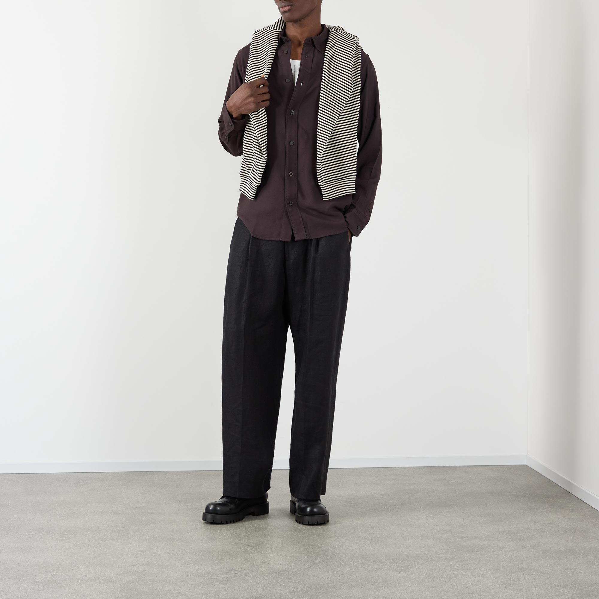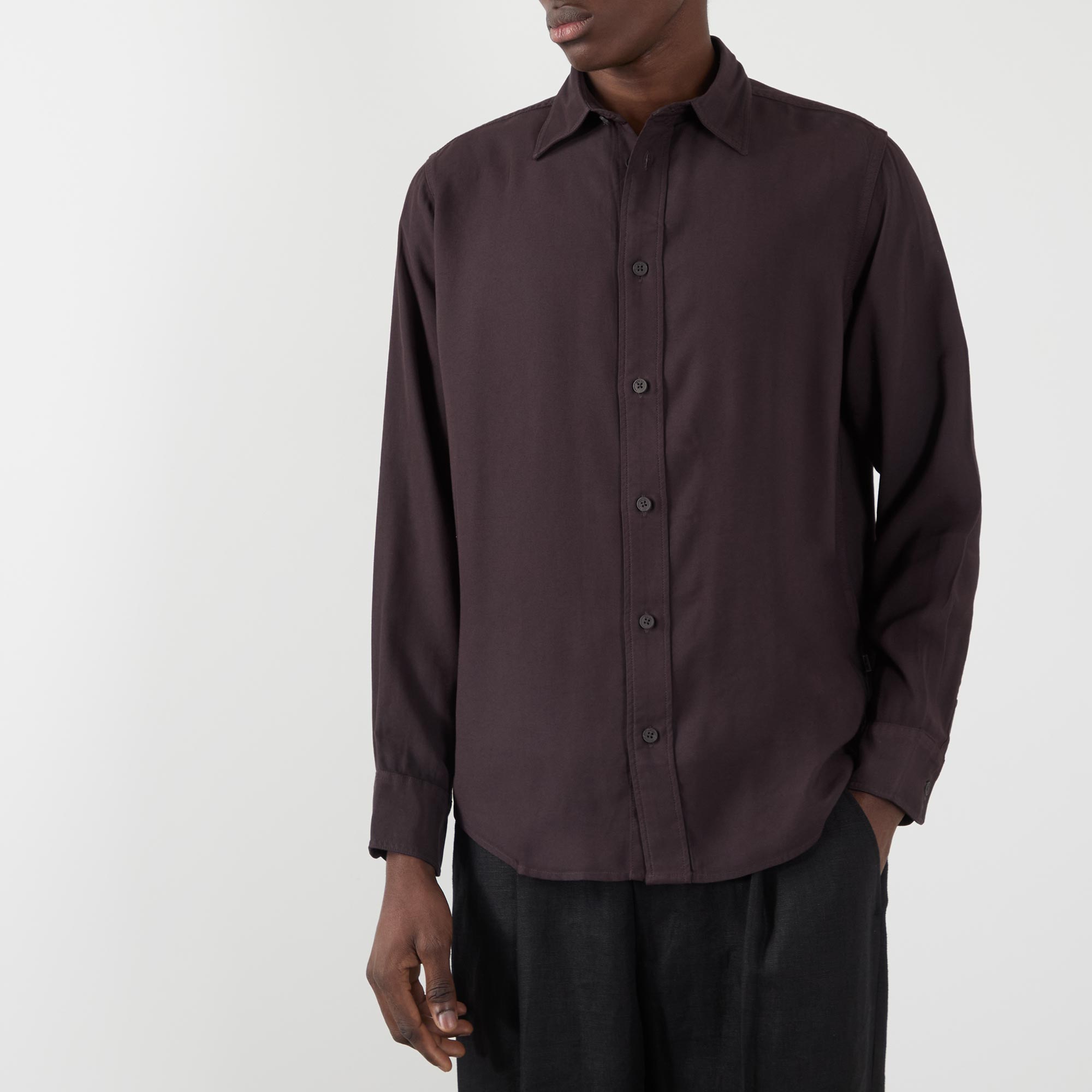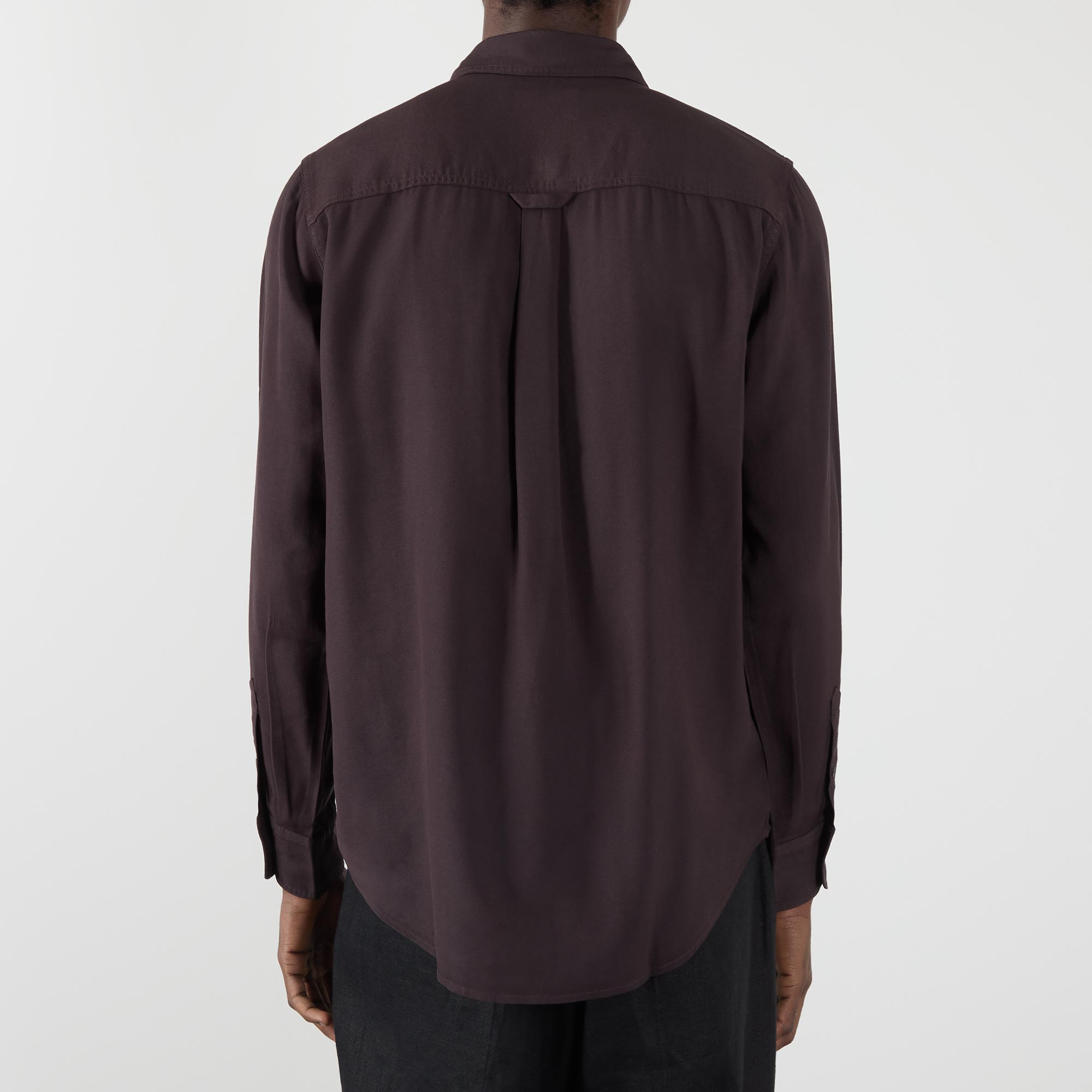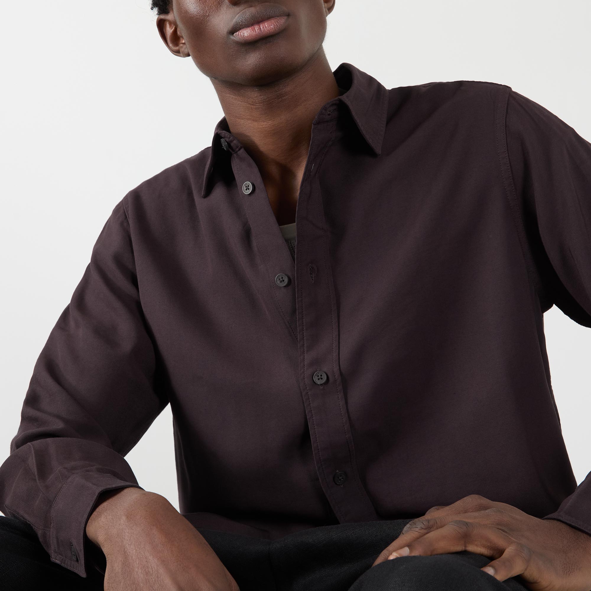 - Point collar, long sleeves, front button placket, tonal stitching, single-button cuffs, curved hemline, smooth fabric