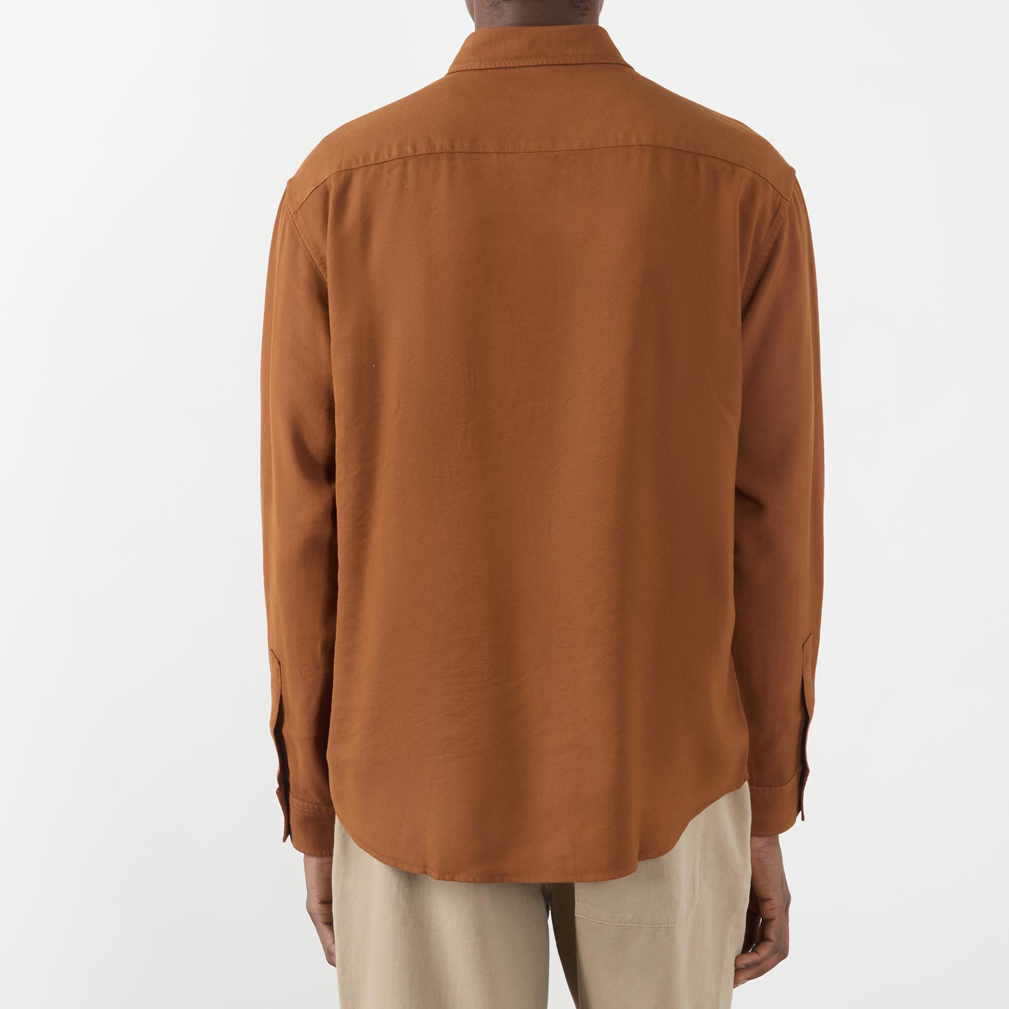 - Long sleeves, pointed collar, chest pocket, button fastenings, curved hemline