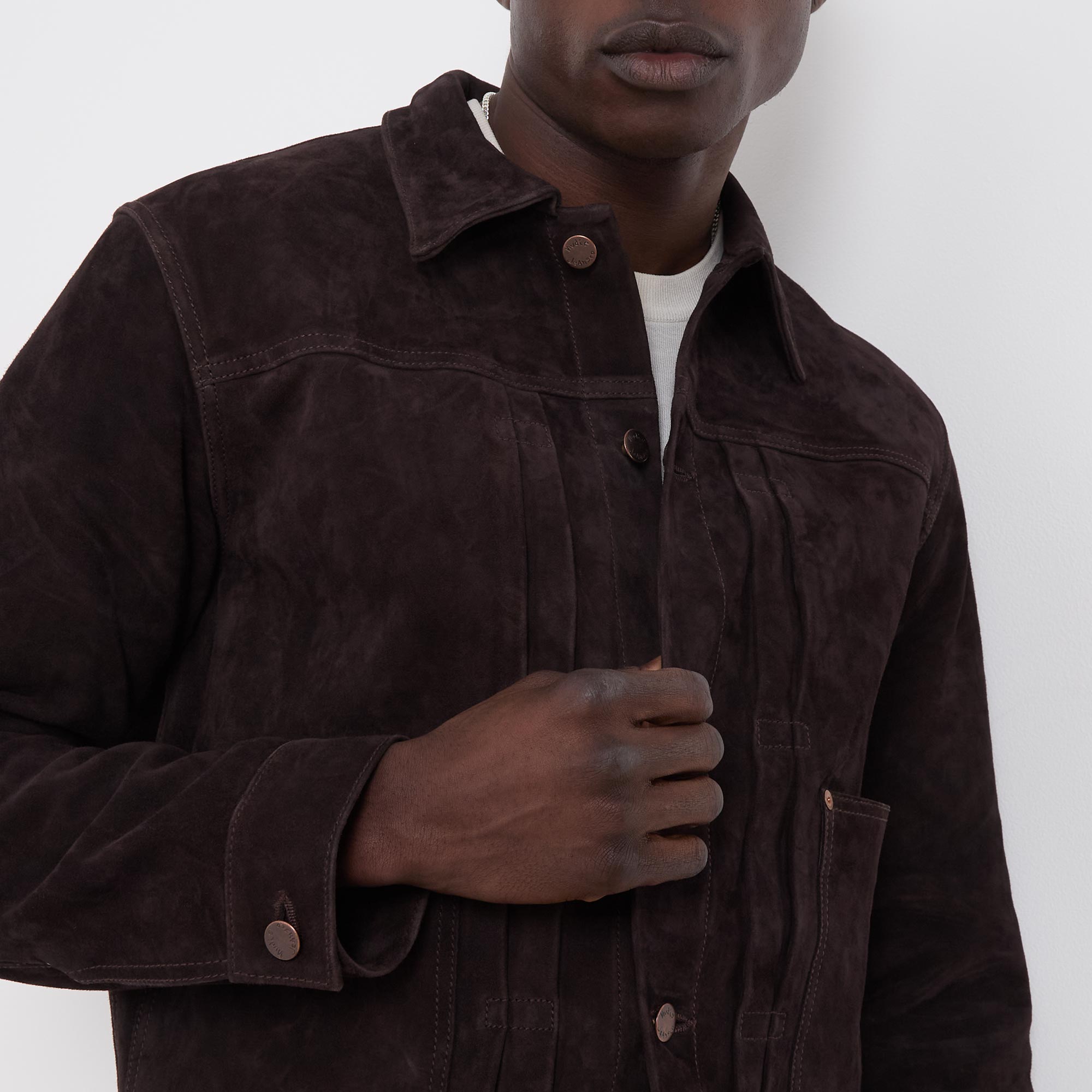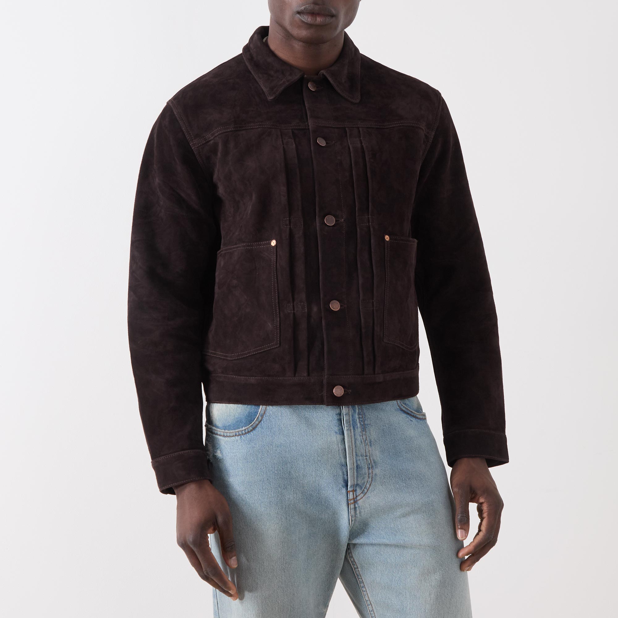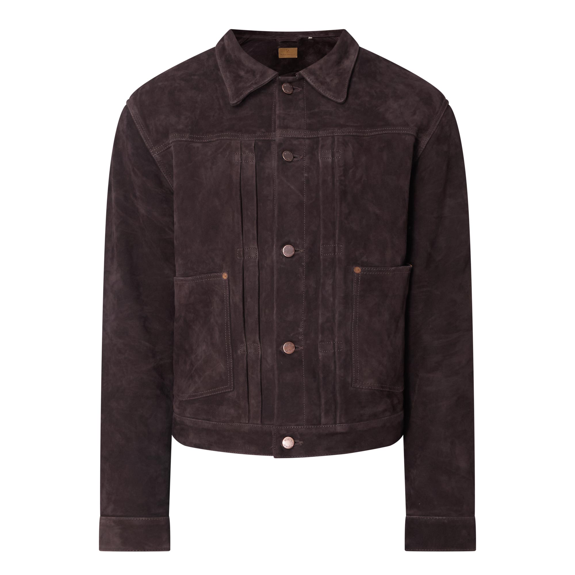 - Point collar, long sleeves, buttoned cuffs, pleated detailing, front placket, two front patch pockets, straight hem, engraved logo hardware, tonal stitching, suede leather finish