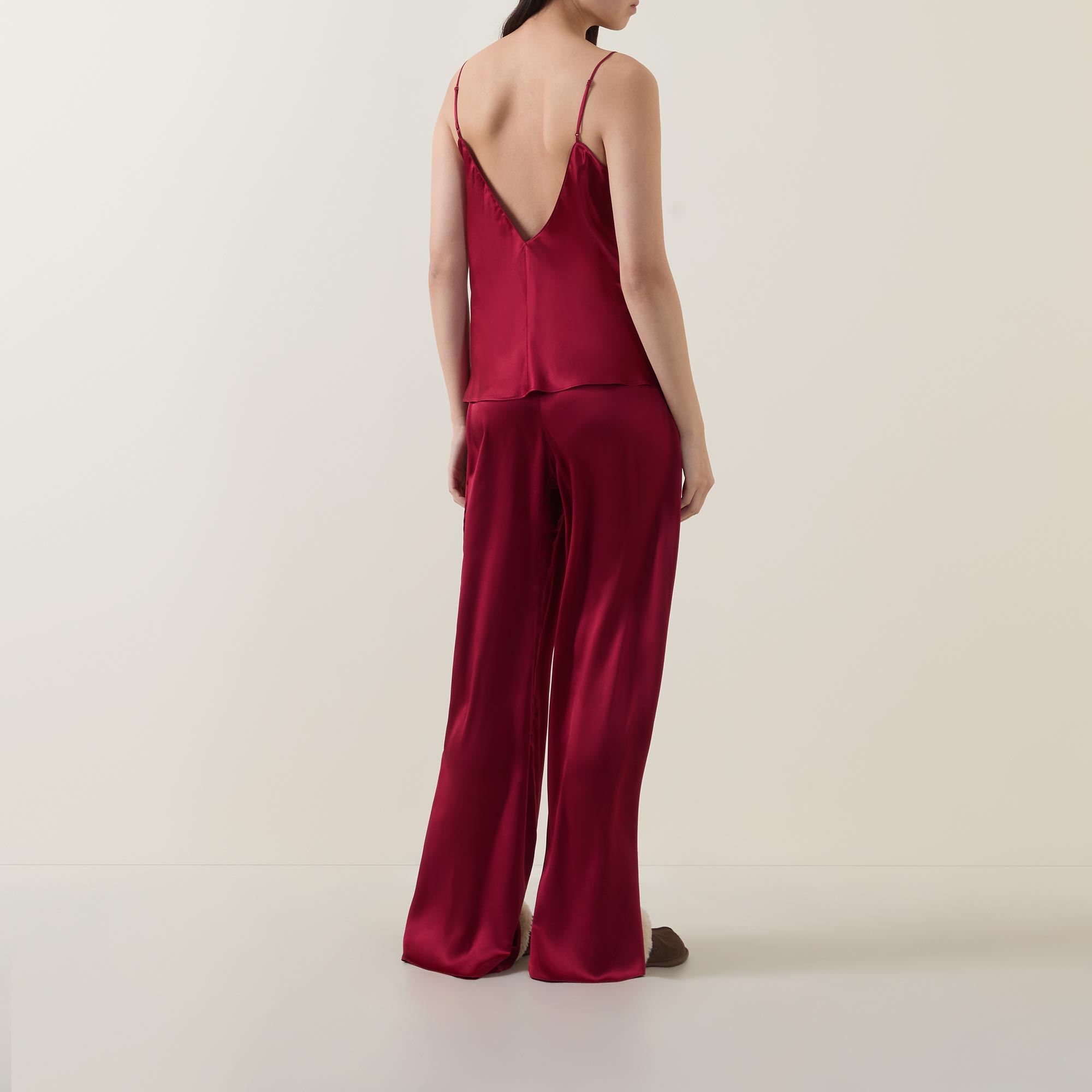 - Top: Thin adjustable spaghetti straps, sleeveless, V-neckline, V-shape back, tonal stitching, smooth silk finish. Bottoms: Elasticated drawstring waistband, tonal stitching, wide-cut leg, smooth silk finish