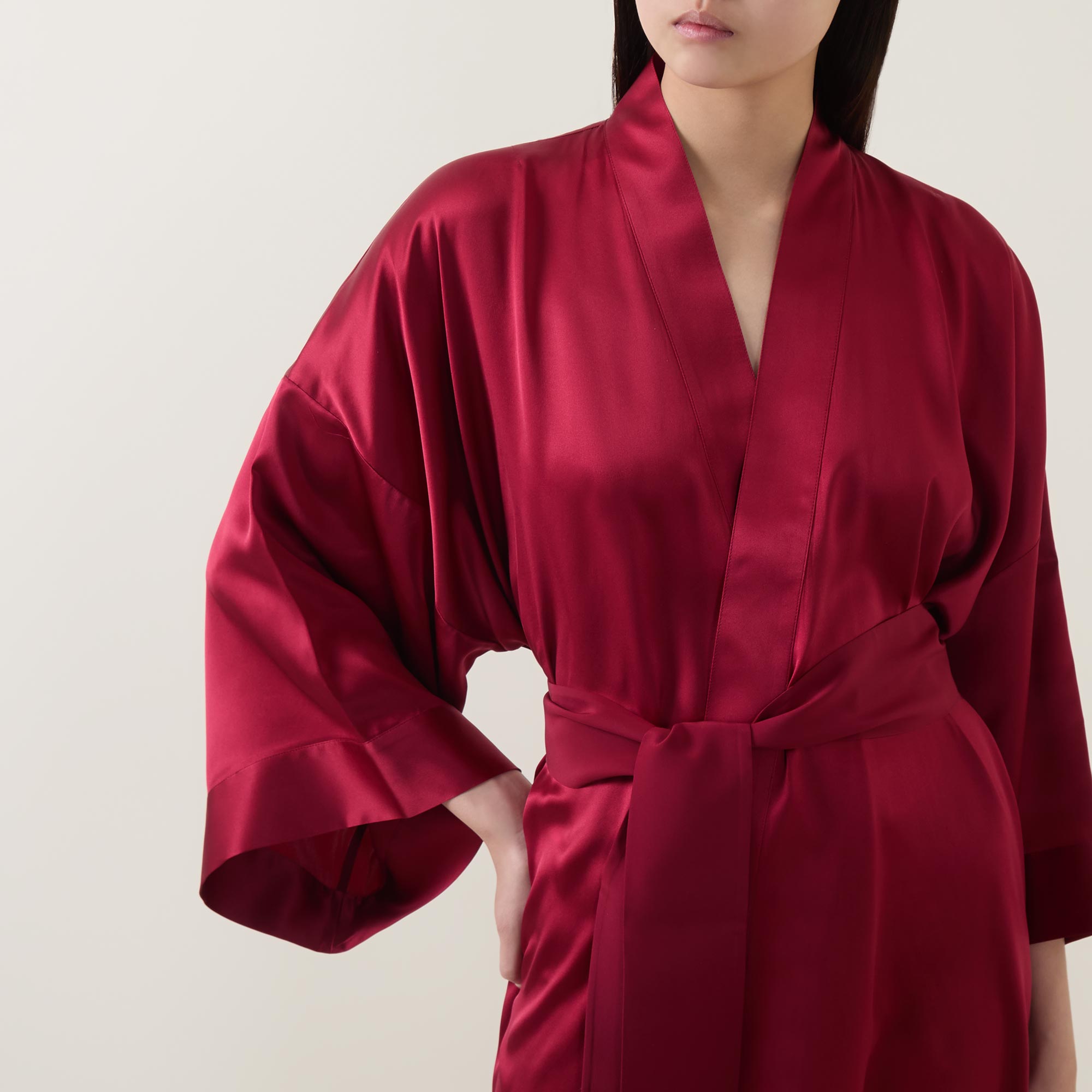 - Shawl-lapel collar, long wide sleeves, dropped shoulders, wrap front, tie-fastening self-fabric belt, tonal stitching, smooth silk finish