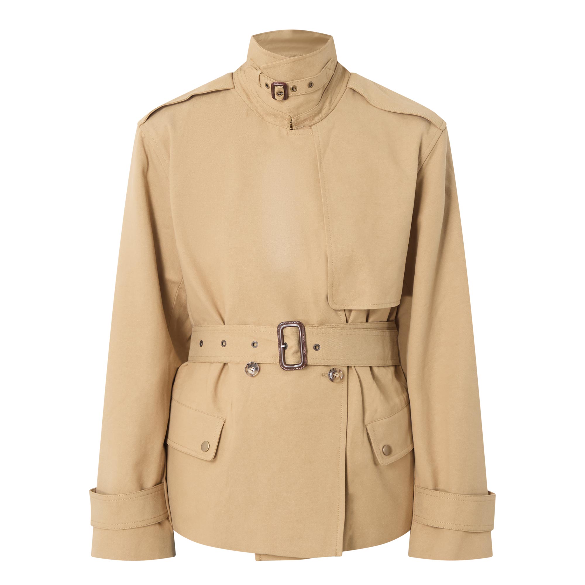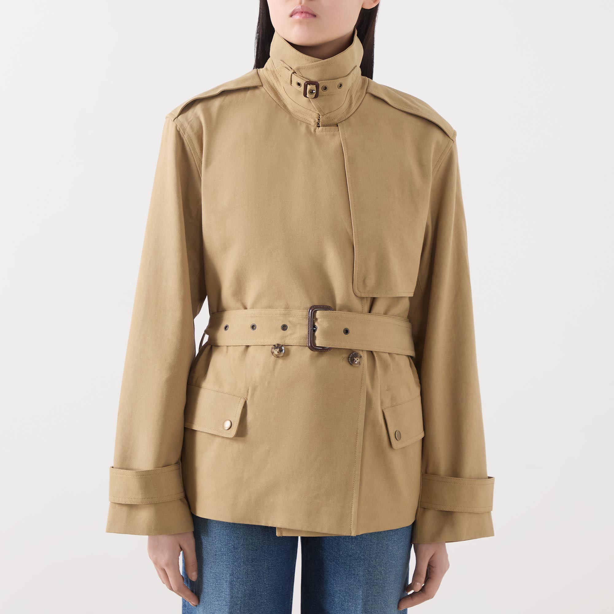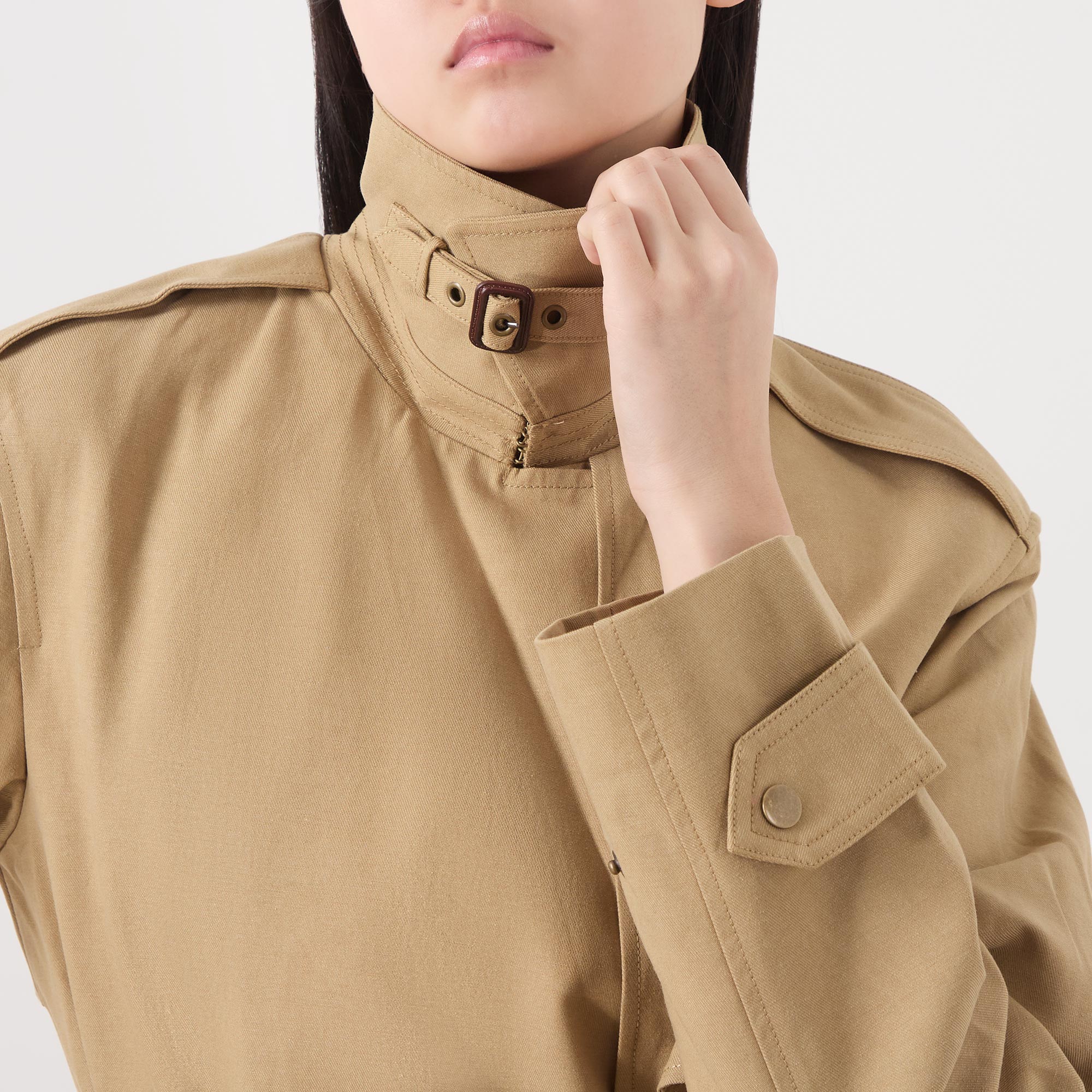 - Double-breasted silhouette, button fastening, belt loops, adjustable and detachable belt, storm guard, tab adjustable cuffs, collar with belt detail