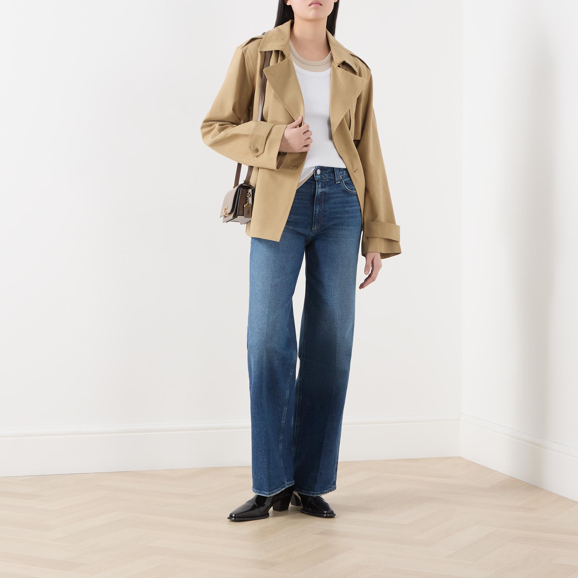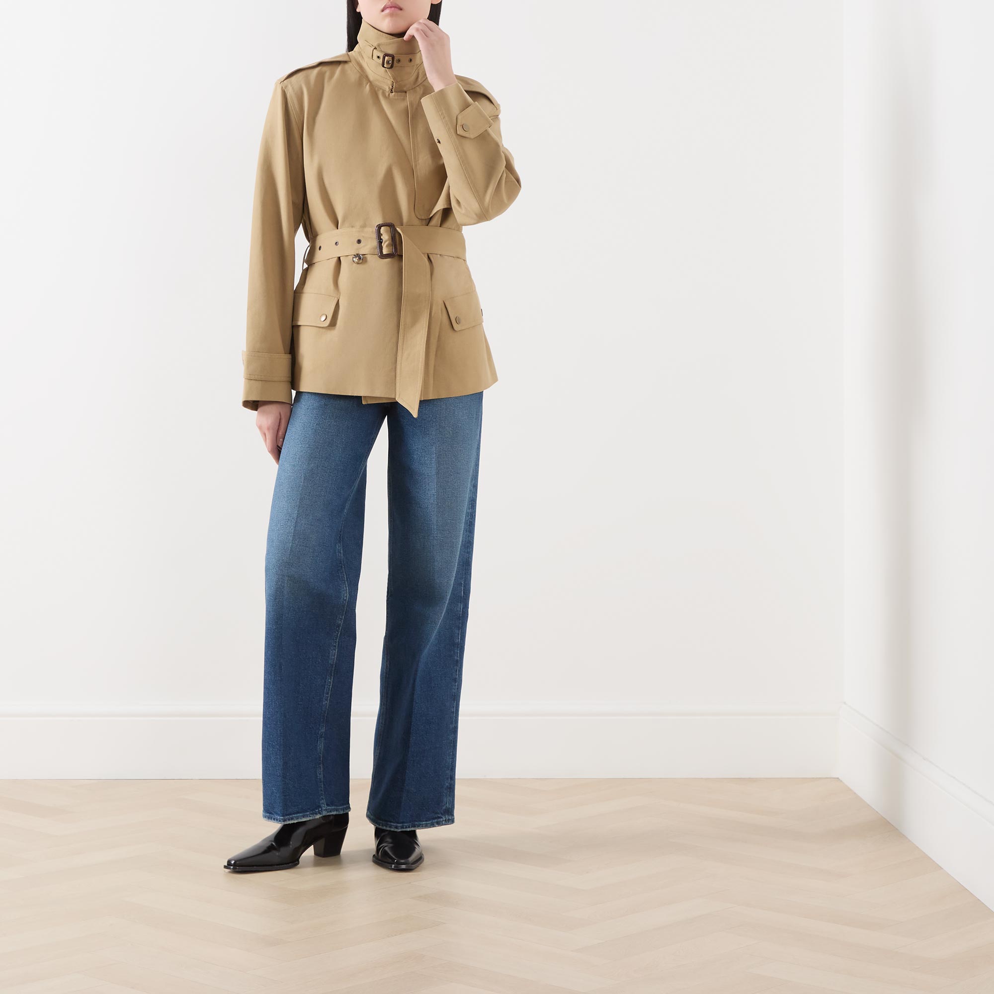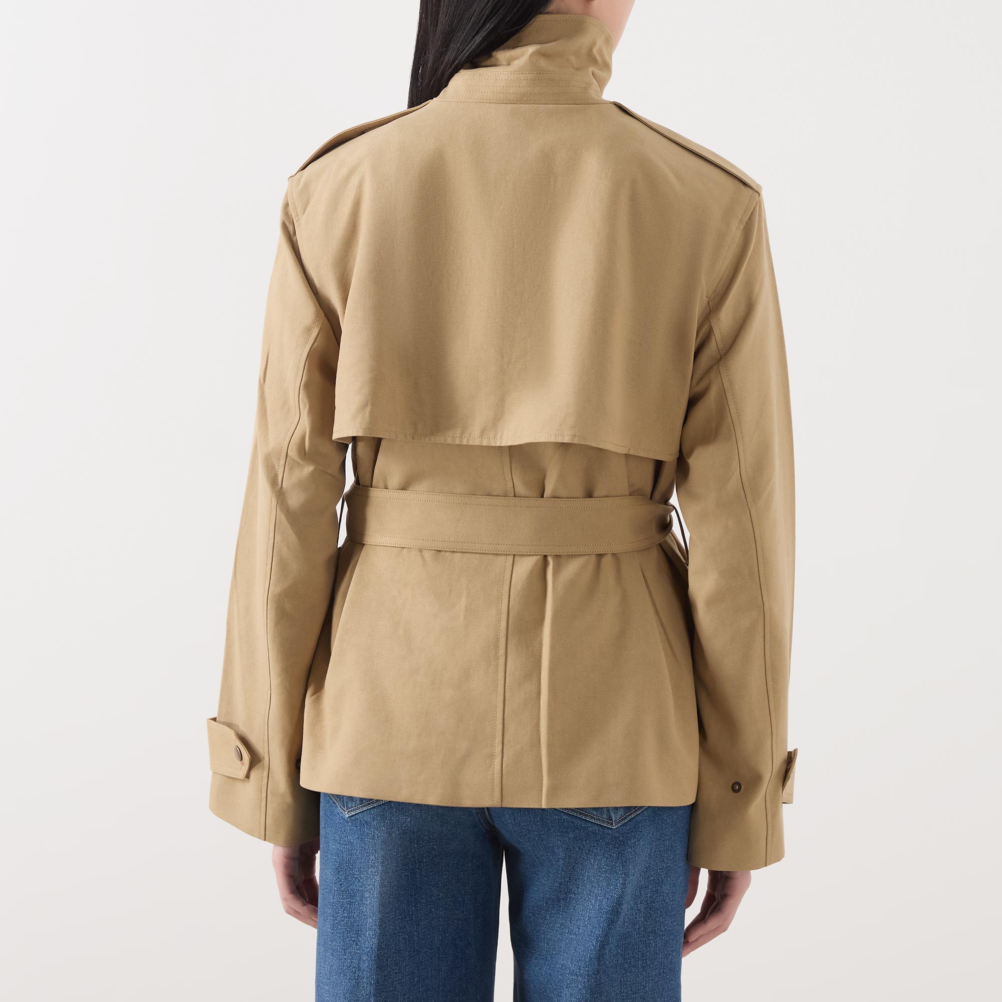 - Double-breasted silhouette, button fastening, belt loops, adjustable and detachable belt, storm guard, tab adjustable cuffs, collar with belt detail