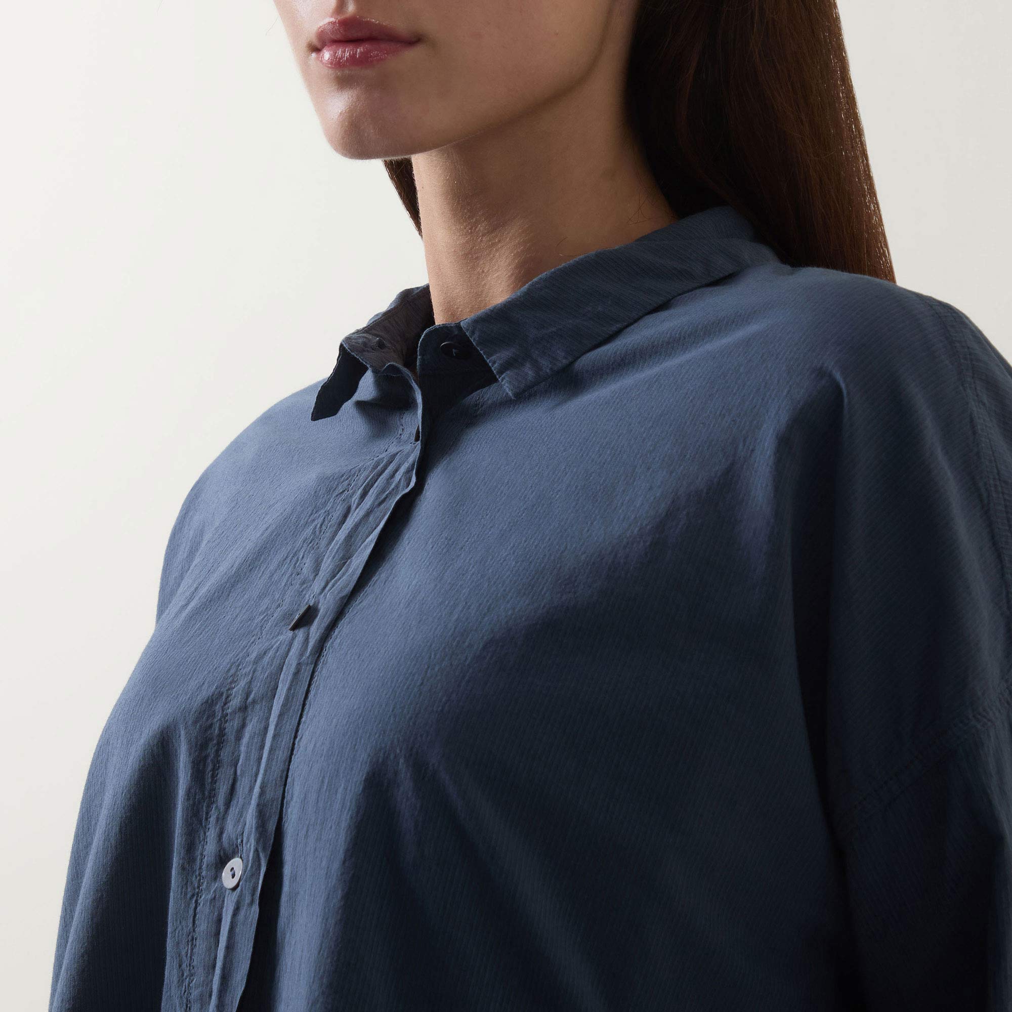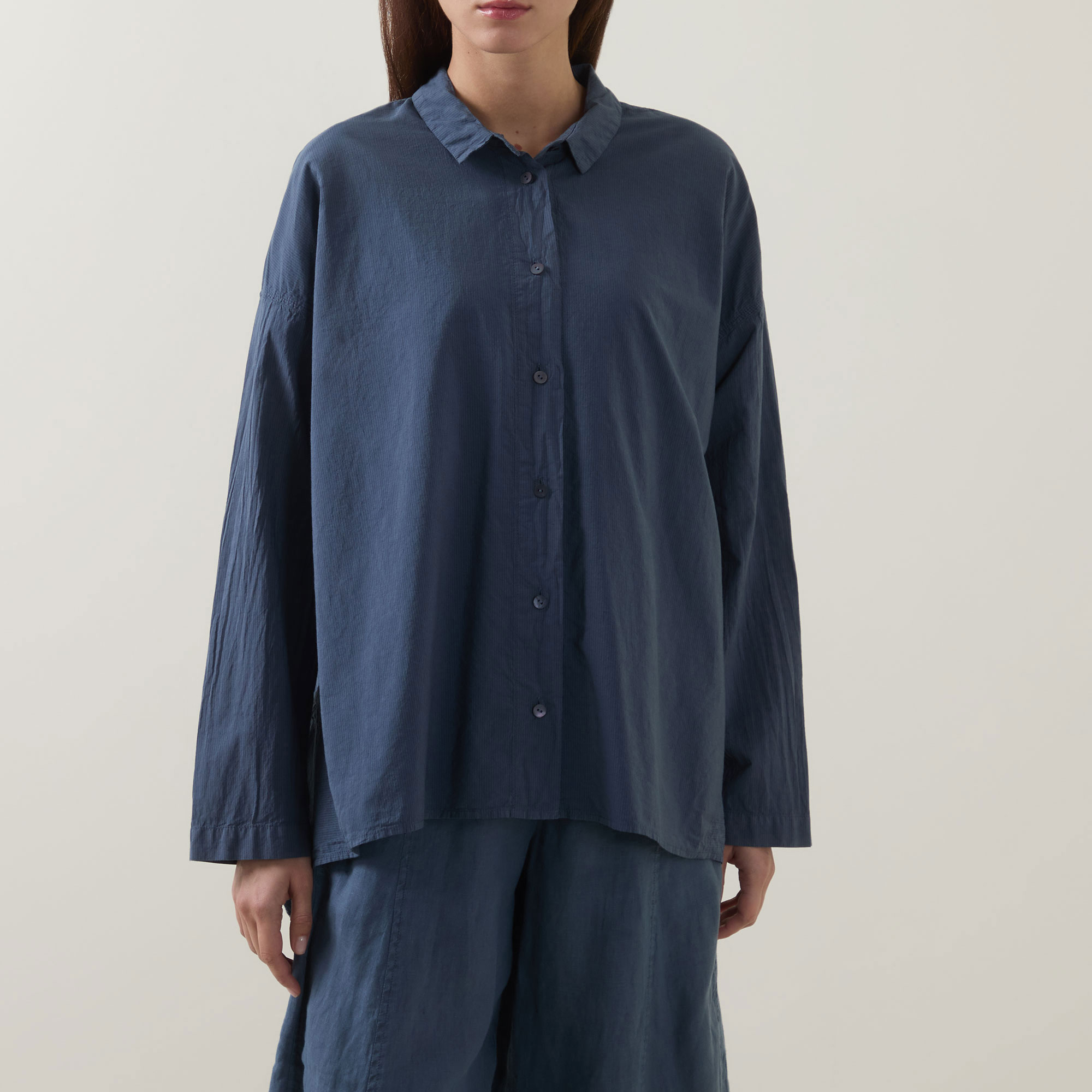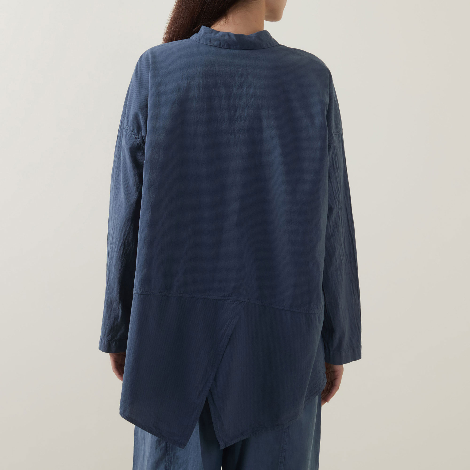 - Collared neckline, button fastening, long sleeves, asymmetric hemline, vent to the back, solid style