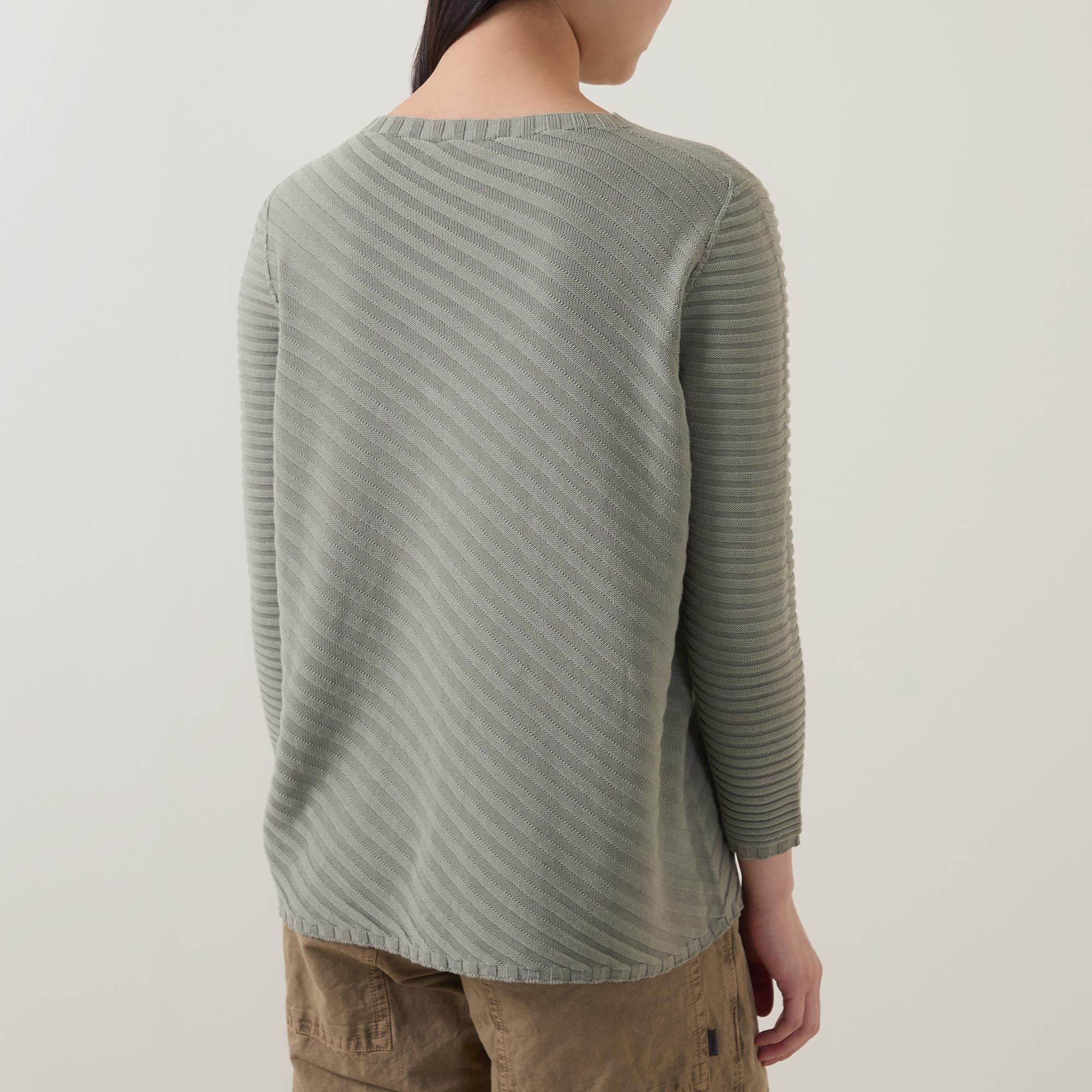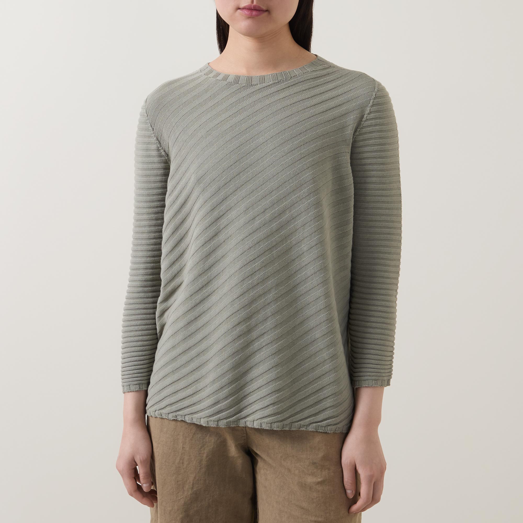 - Crew neckline, bracelet length sleeves, straight hem, diagonal ribbed design, soft finish