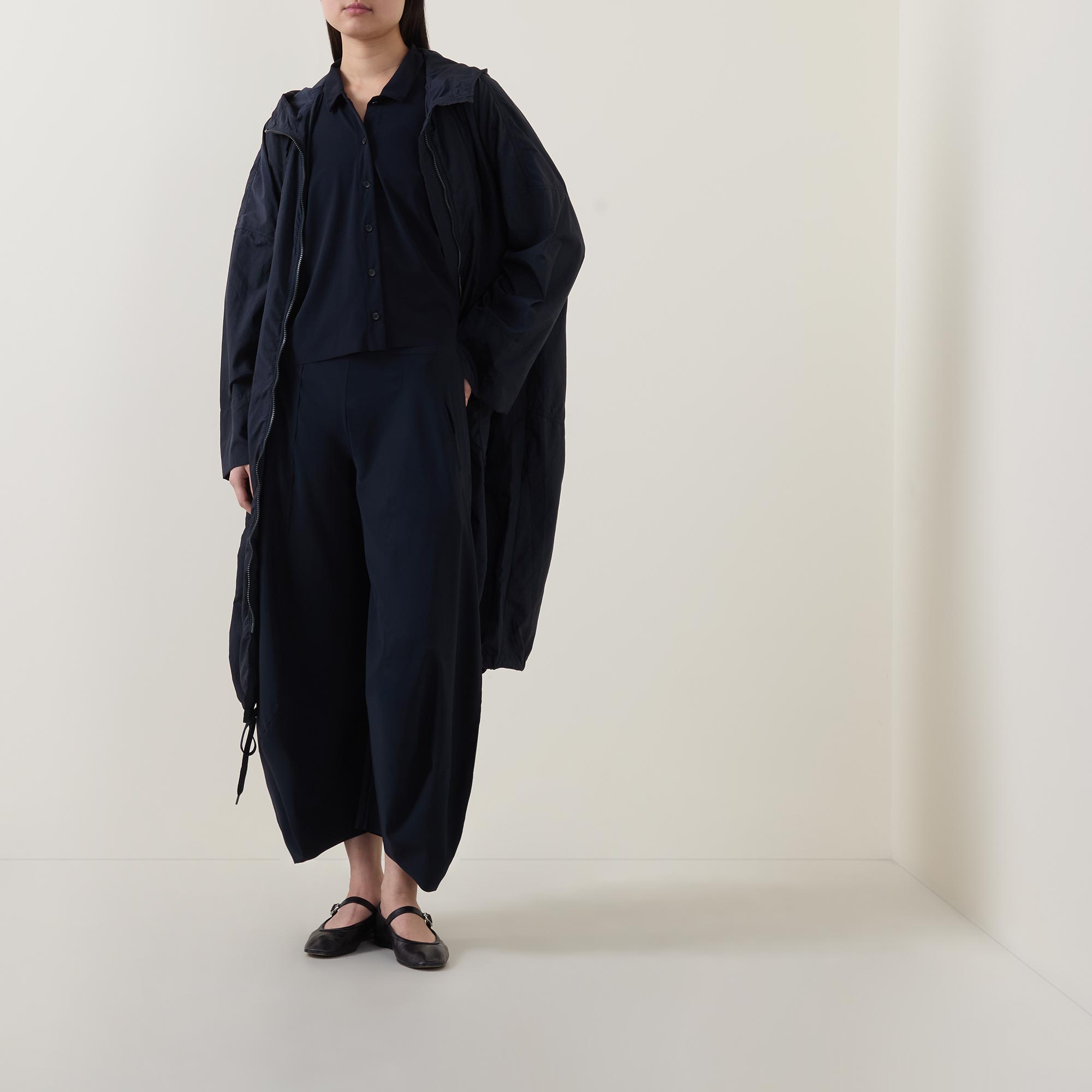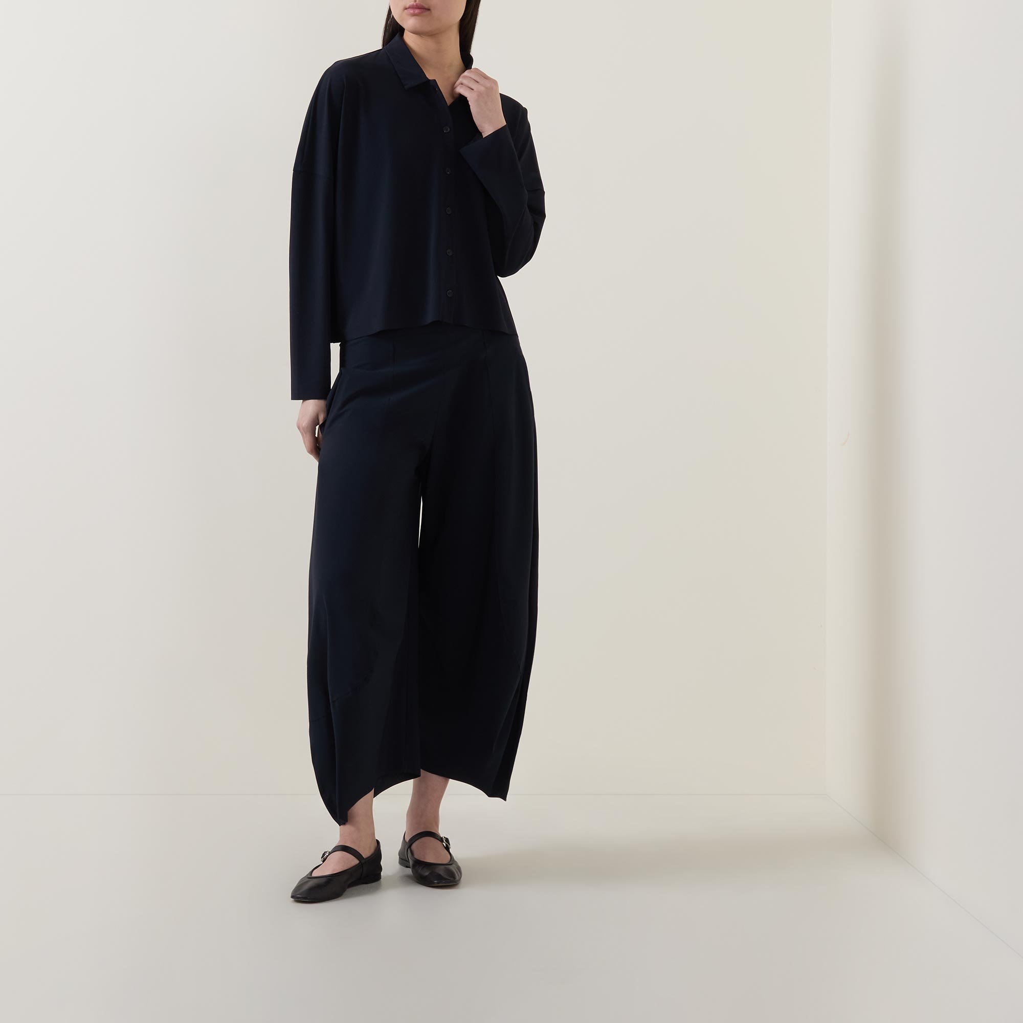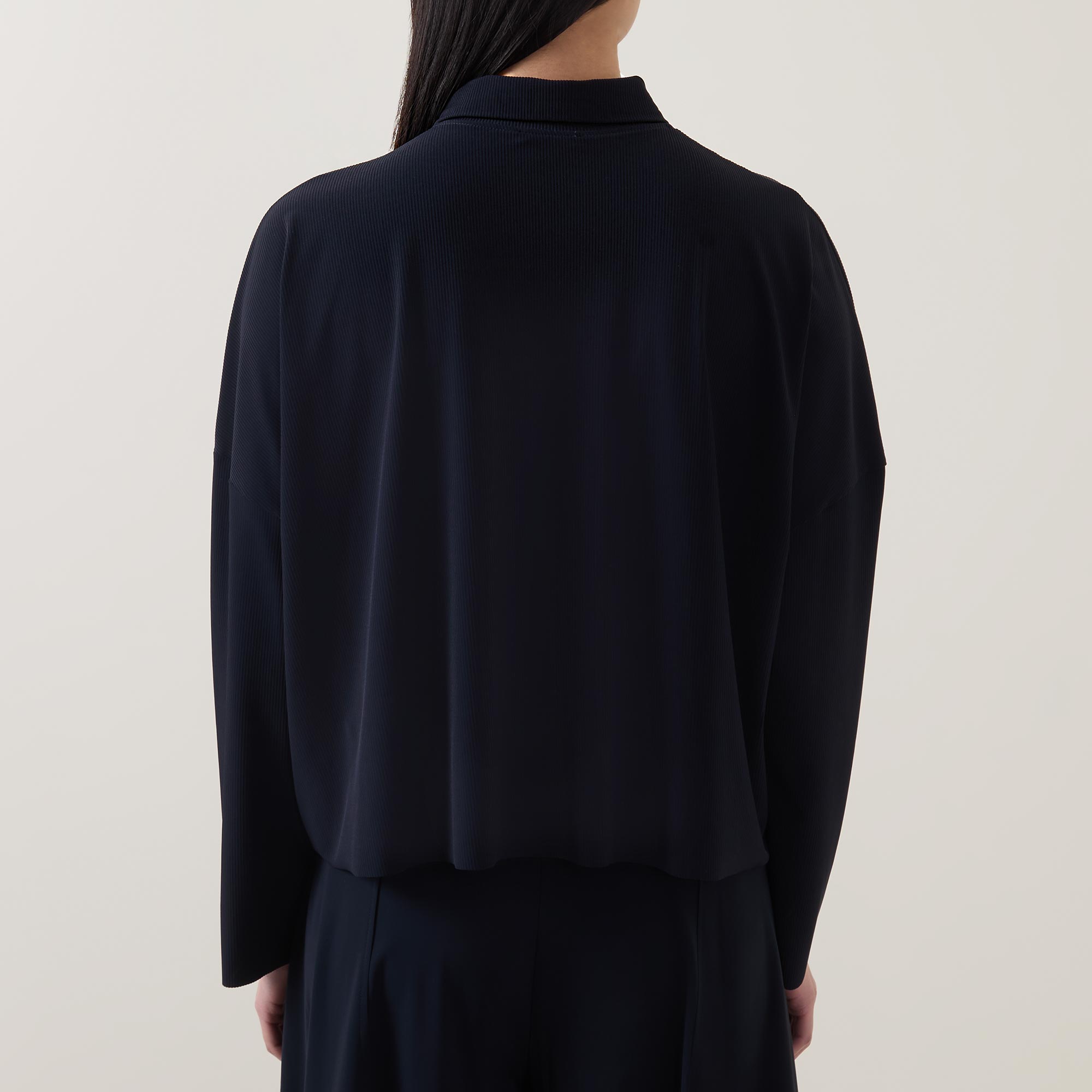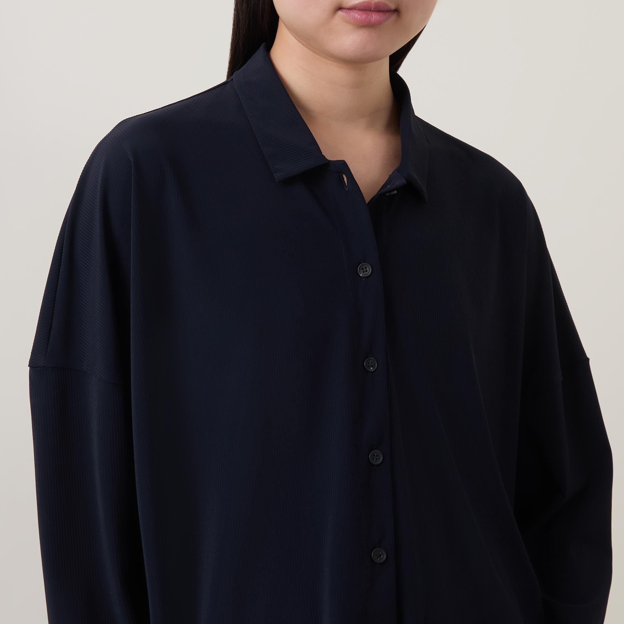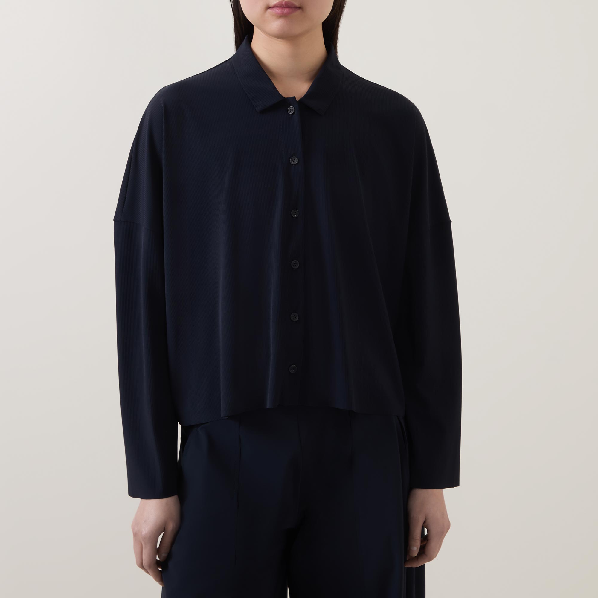 - Point collar, dropped shoulders, long sleeves, front button placket, straight hem, smooth finish