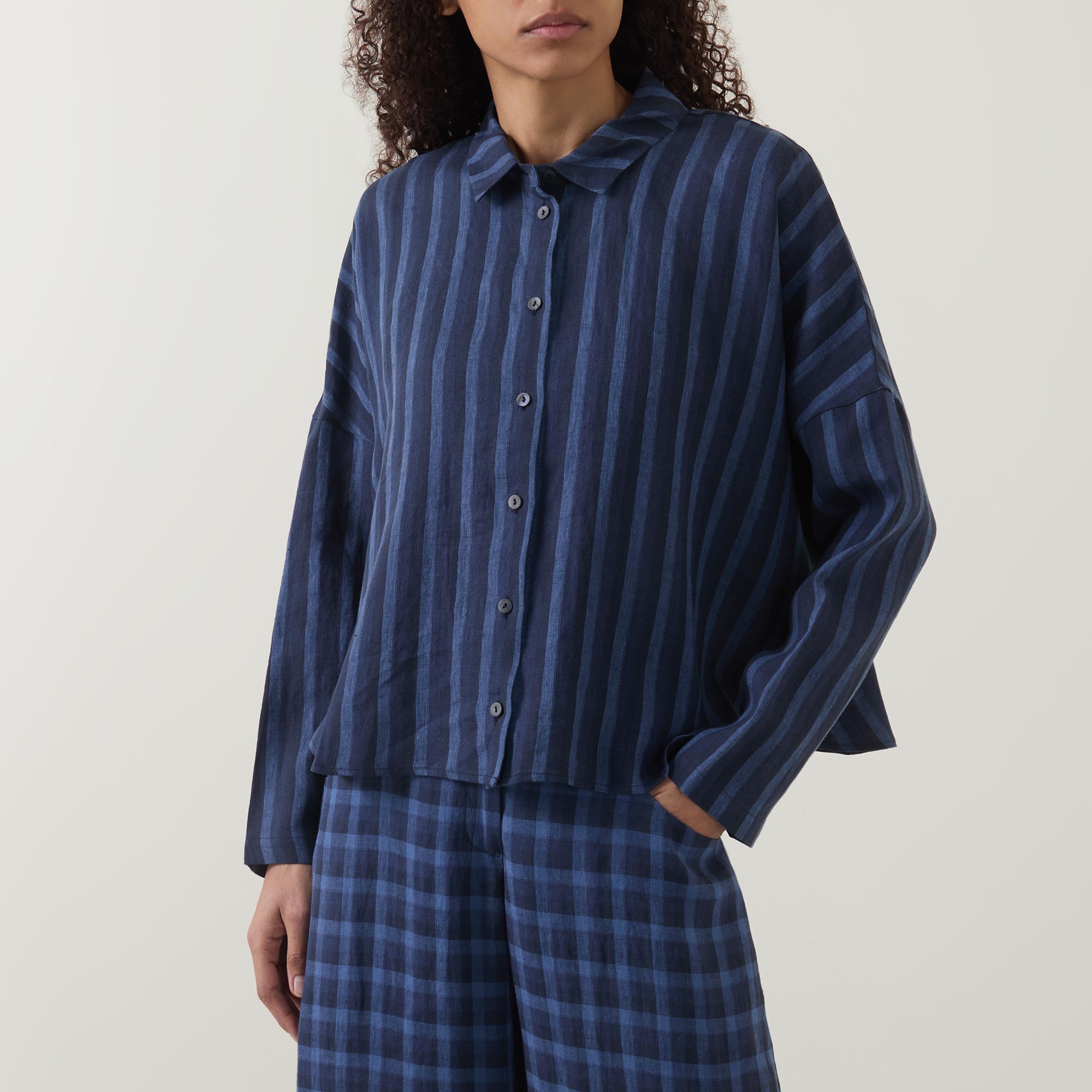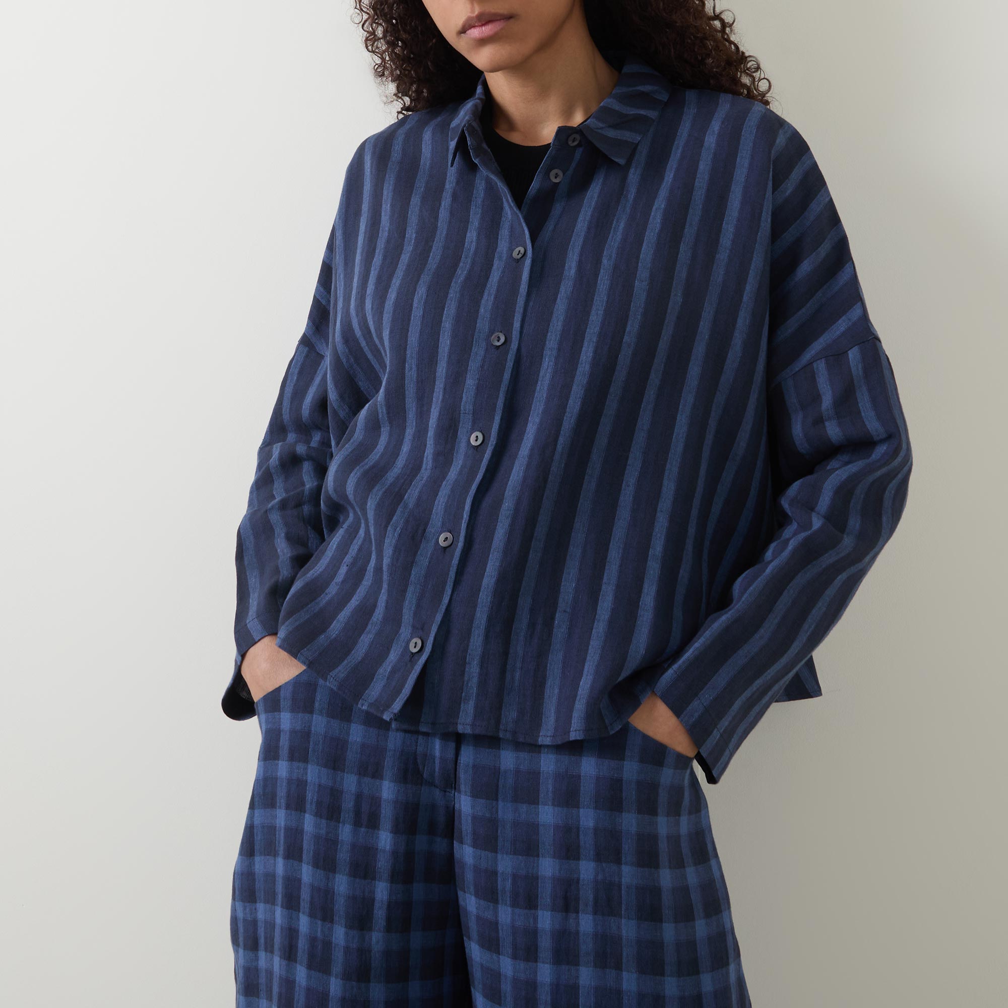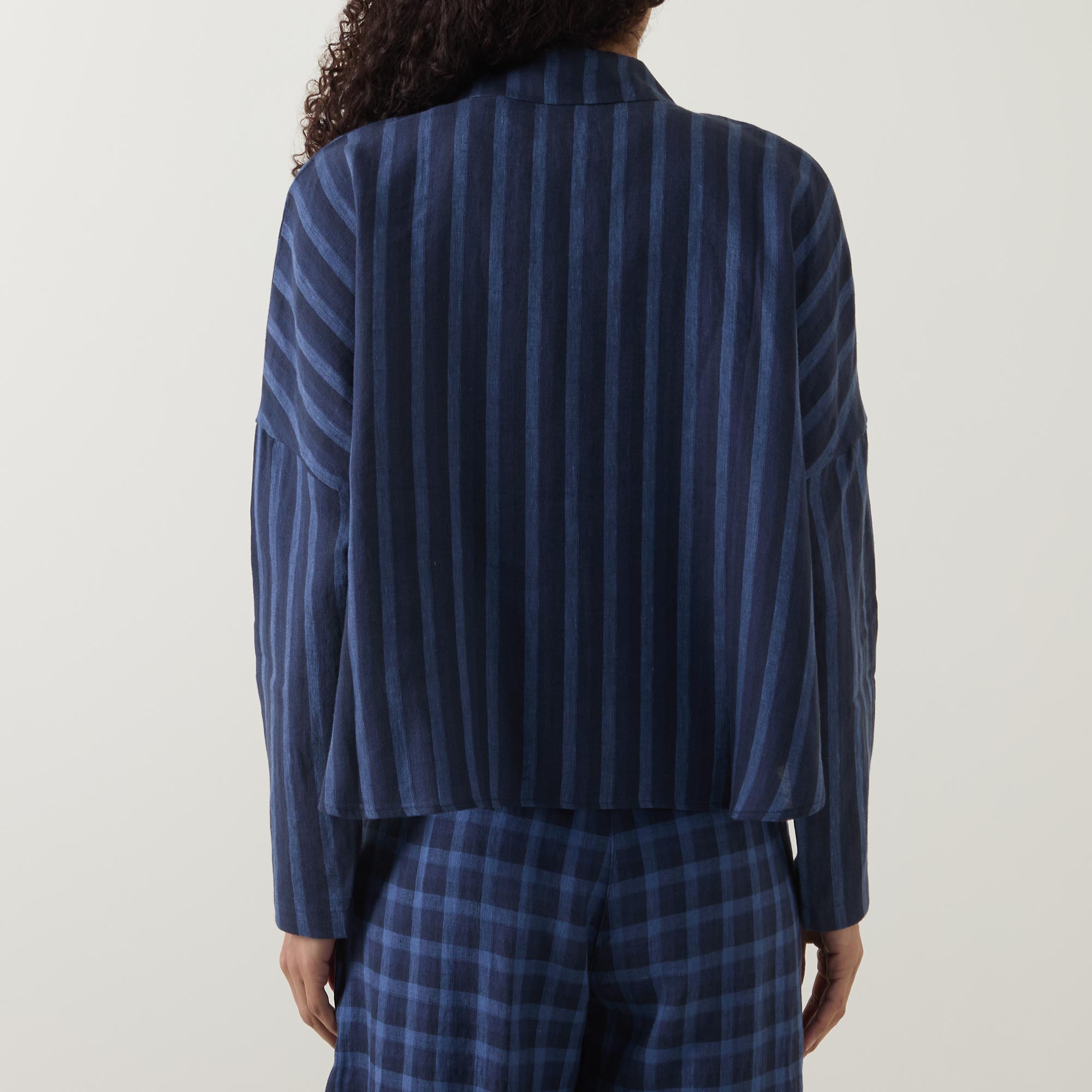 - Flat collar, long sleeves, button fastening, dropped shoulders, straight hemline, stripe pattern