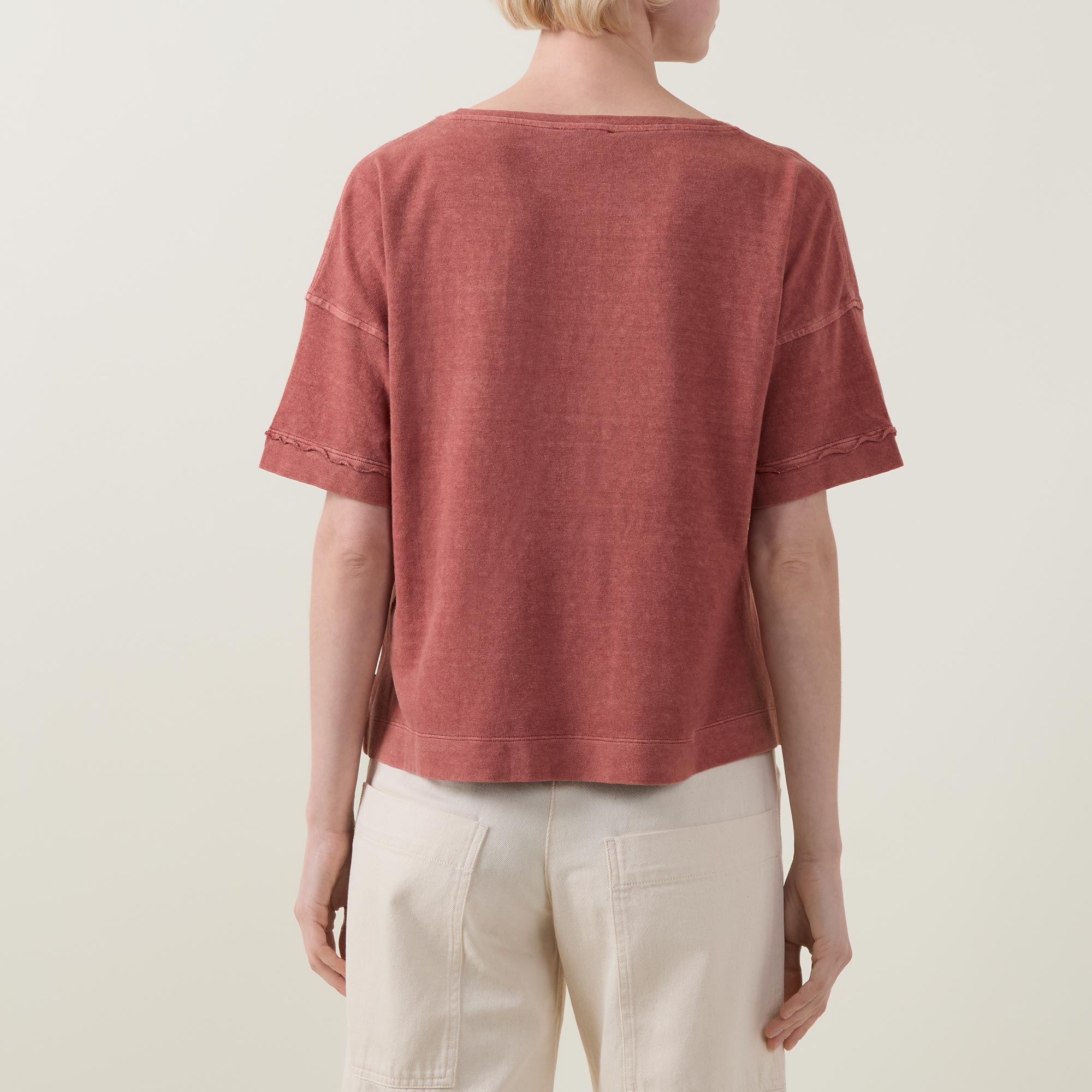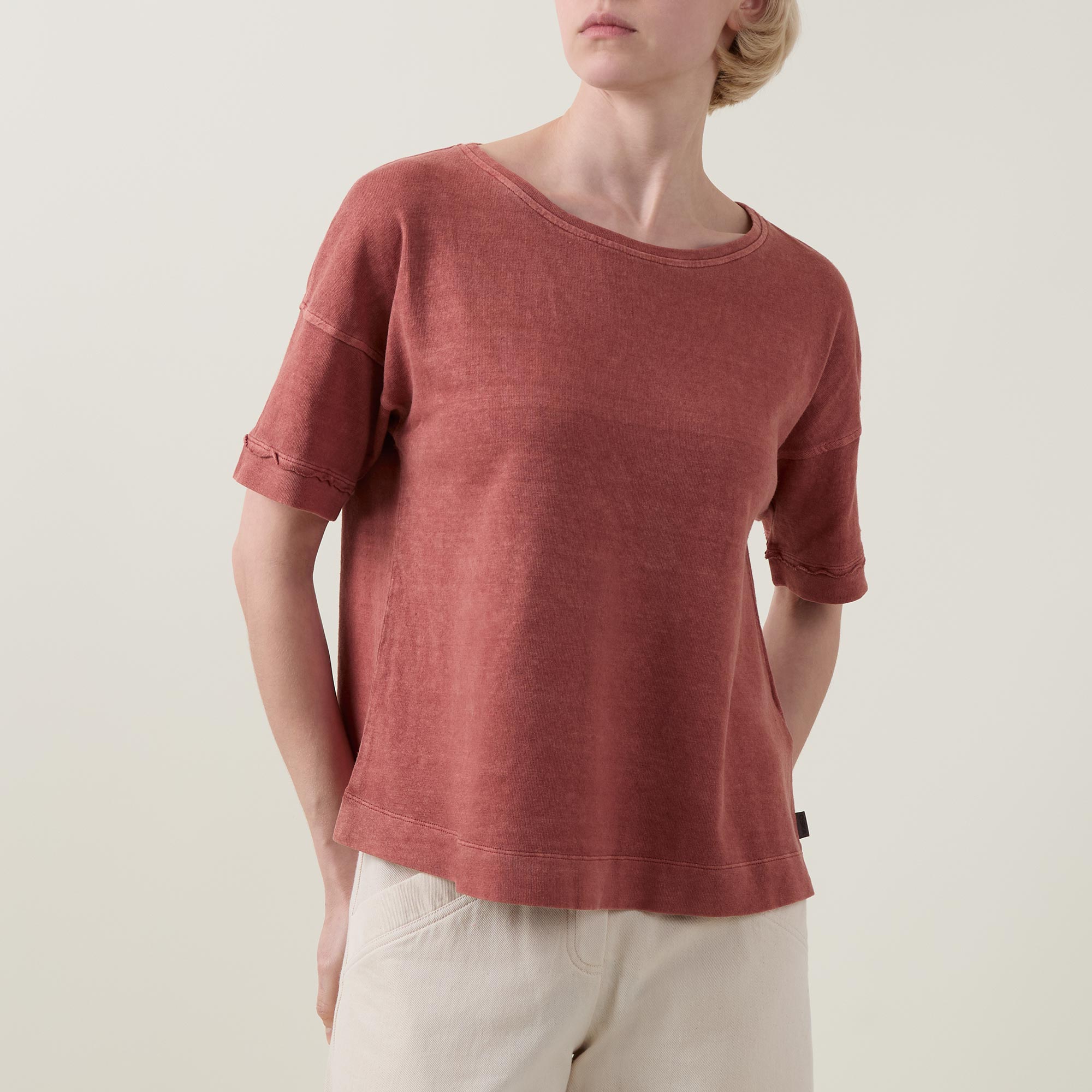 - Boat neckline, short sleeves, dropped shoulders, straight hemline, distressed details