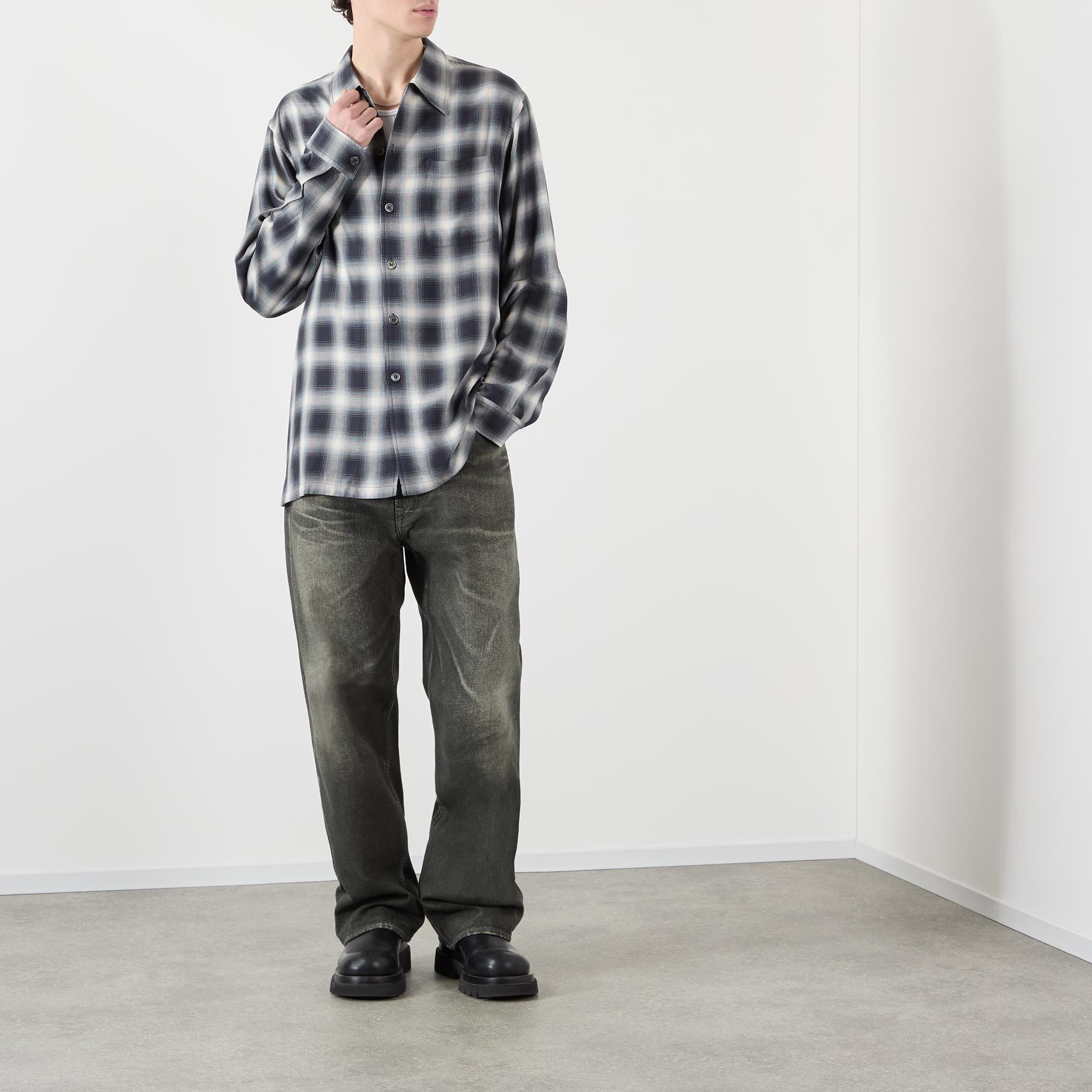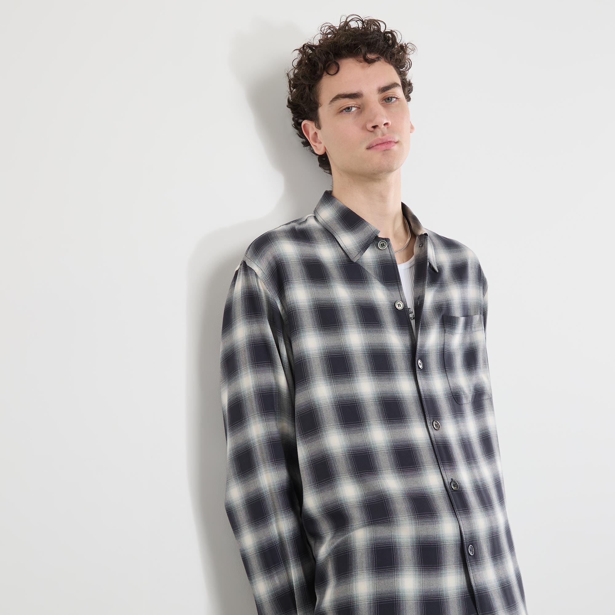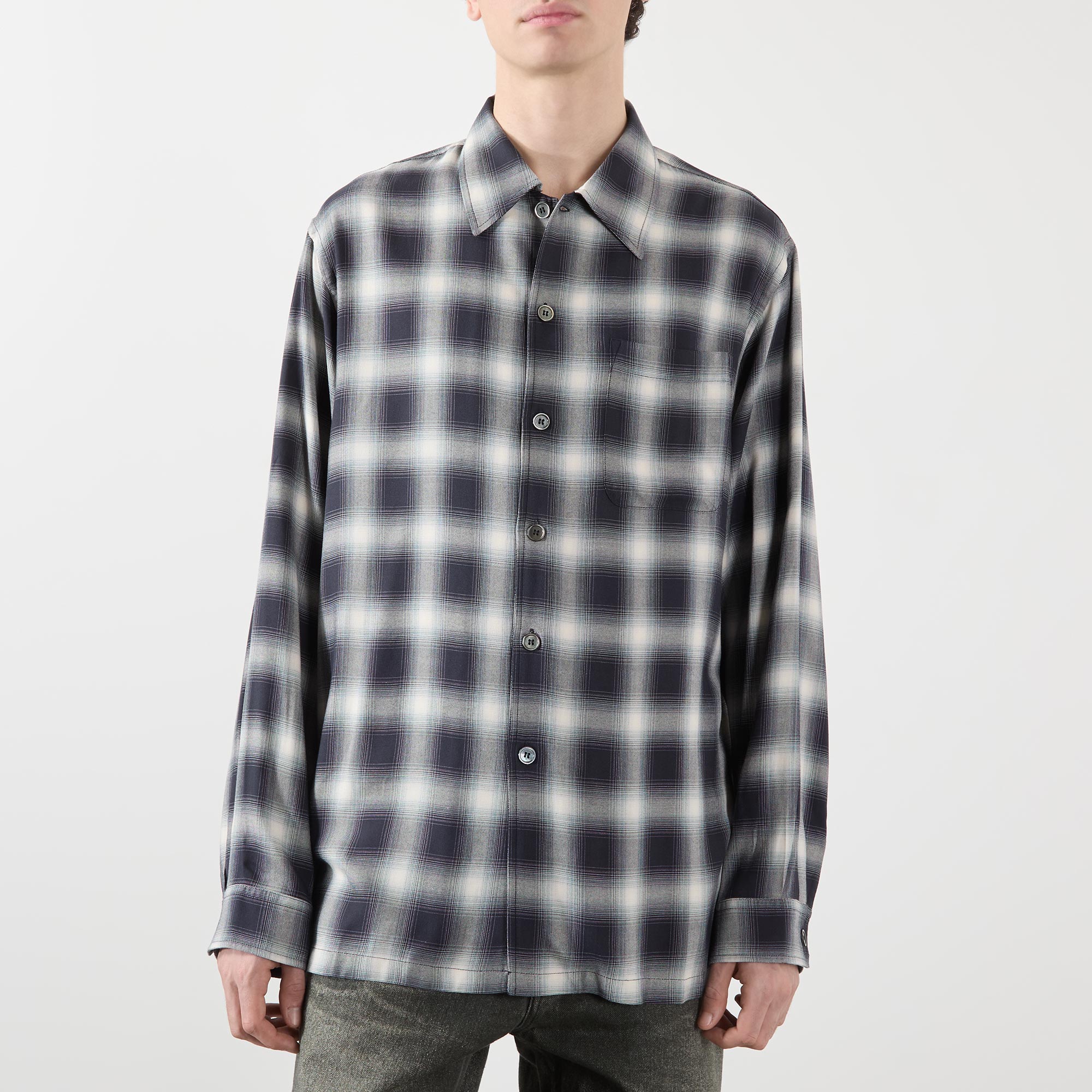 • Point collar, dropped shoulders, long sleeves, buttoned cuffs, front button fastening, one chest patch pocket, straight split hem, tonal stitching, check print