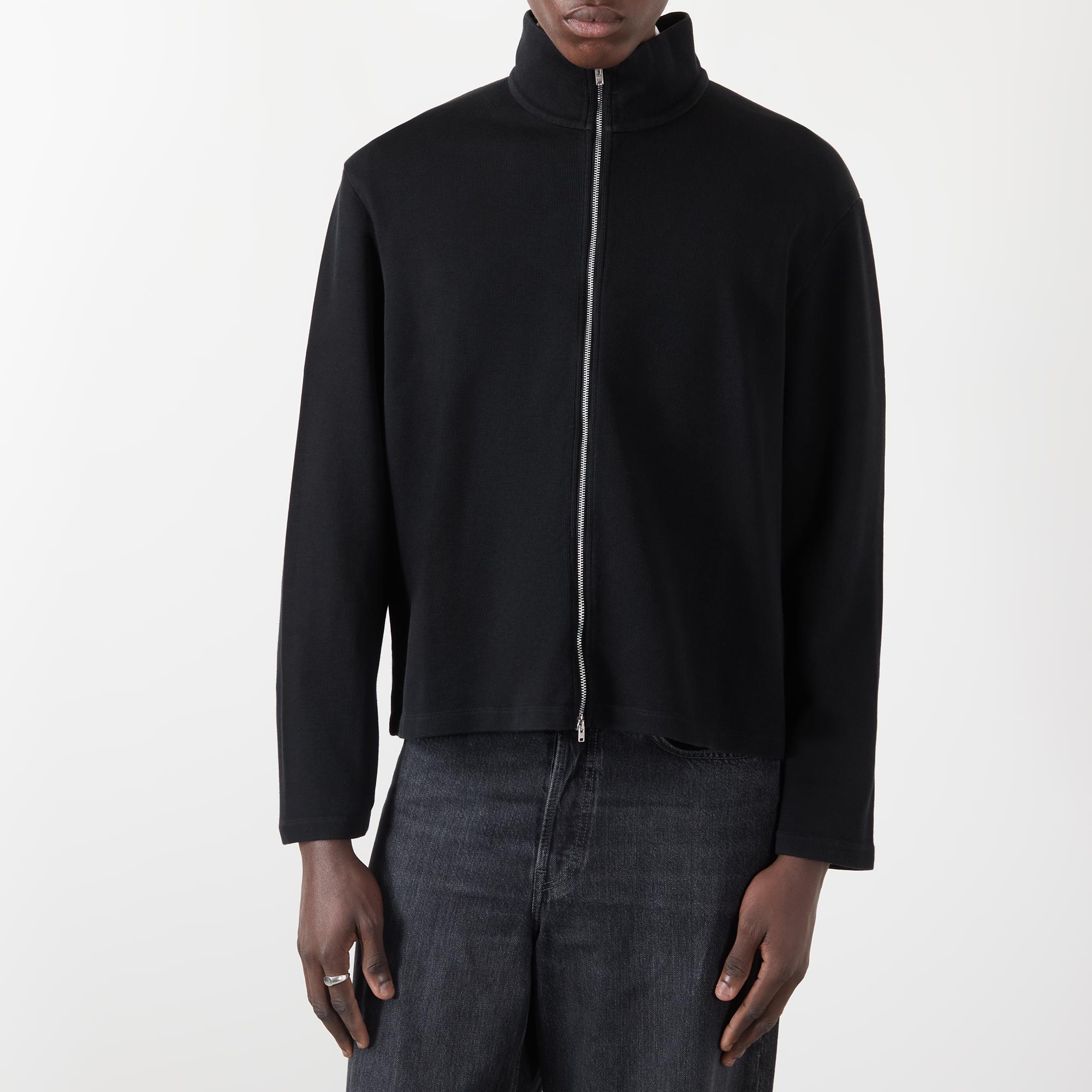 - Funnel neck collar, dropped shoulders, long sleeves, two-way front zip fastening, straight hem, flatlock seams, piece dyed design