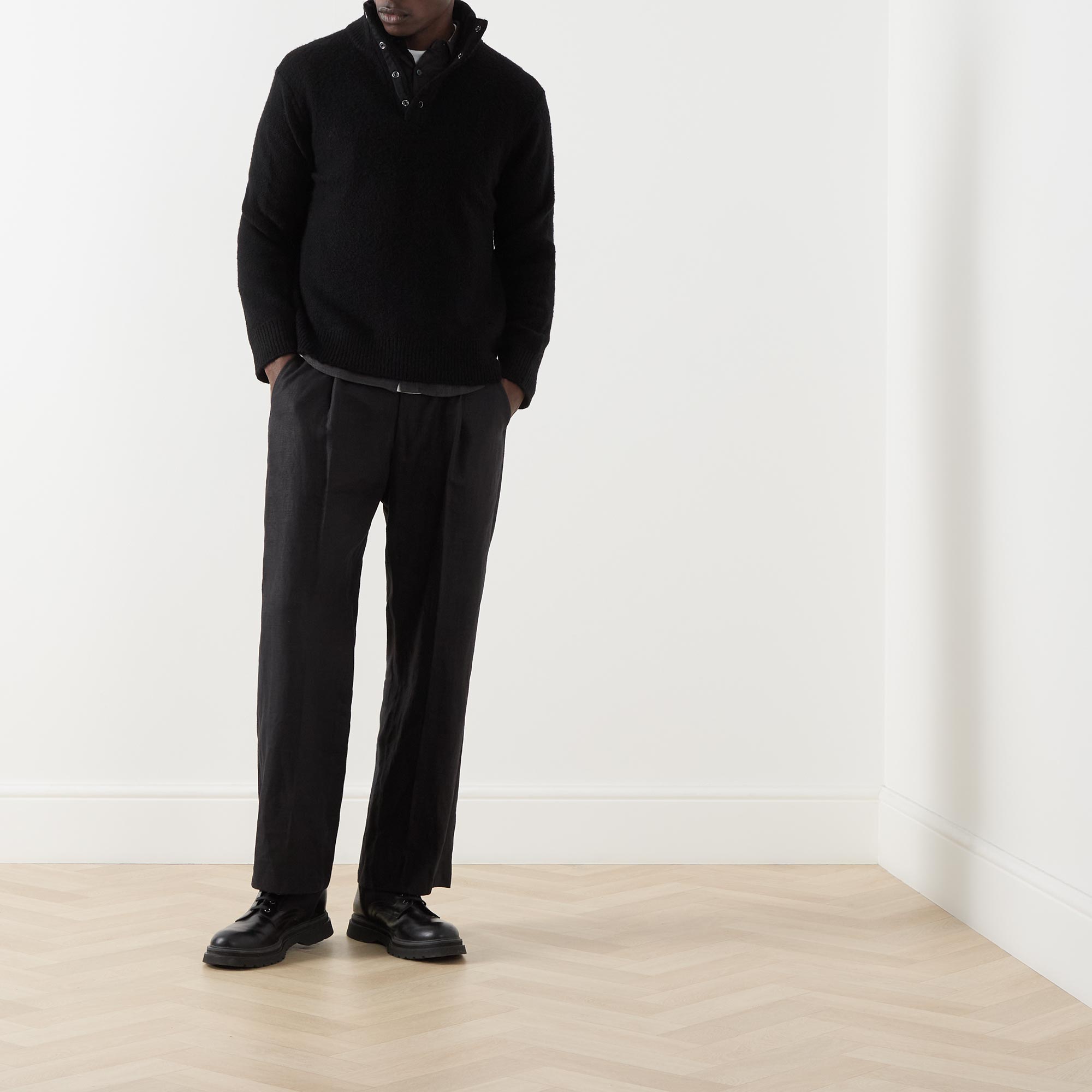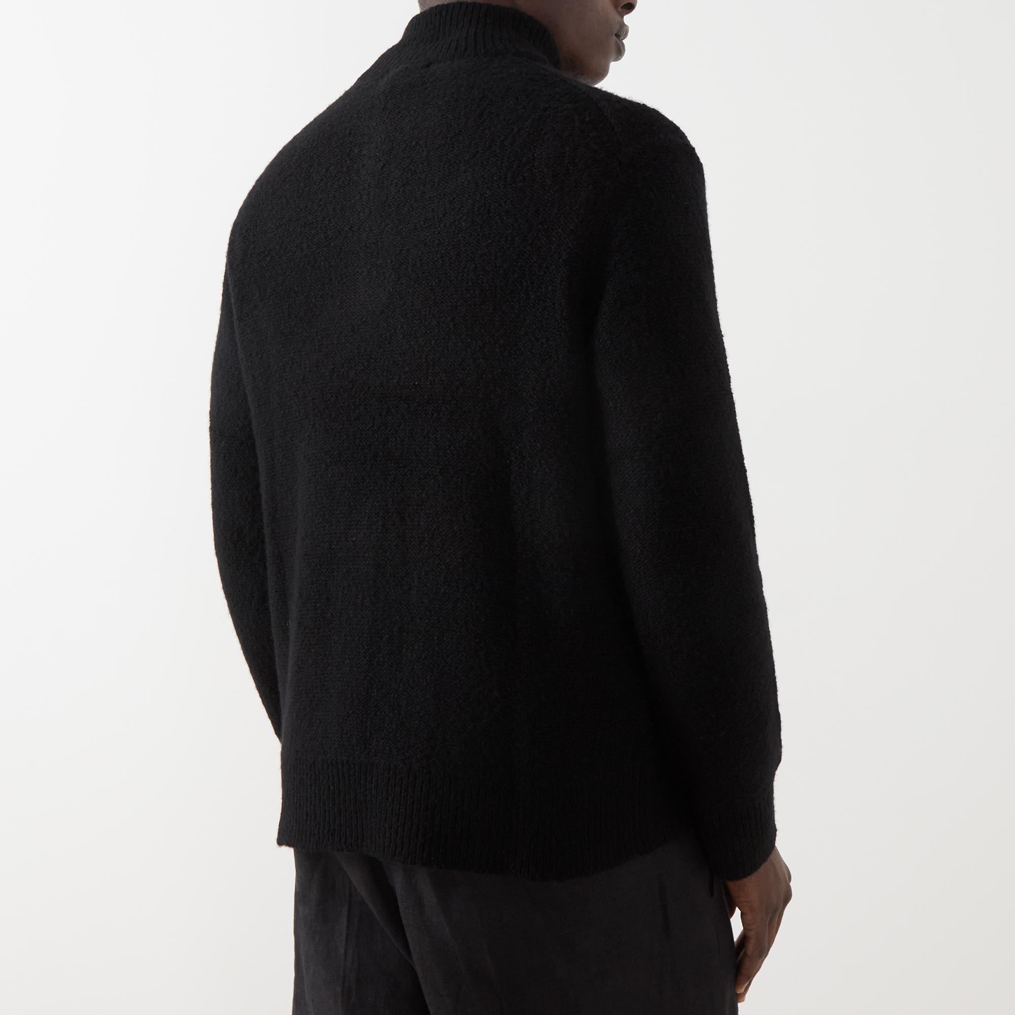 - Stand-up collar, snap-button collar, long sleeves, ribbed hemline and cuffs, knitted finish
