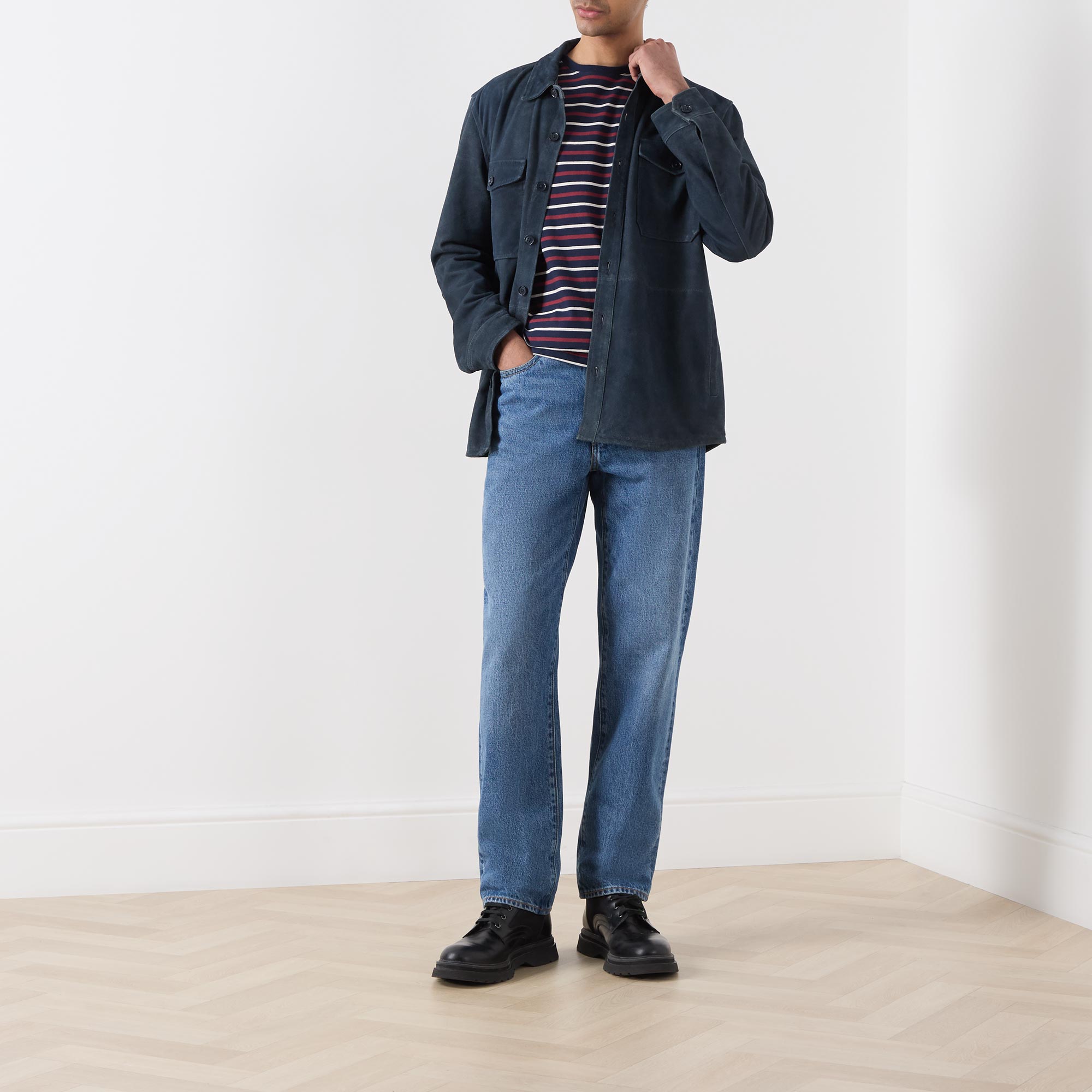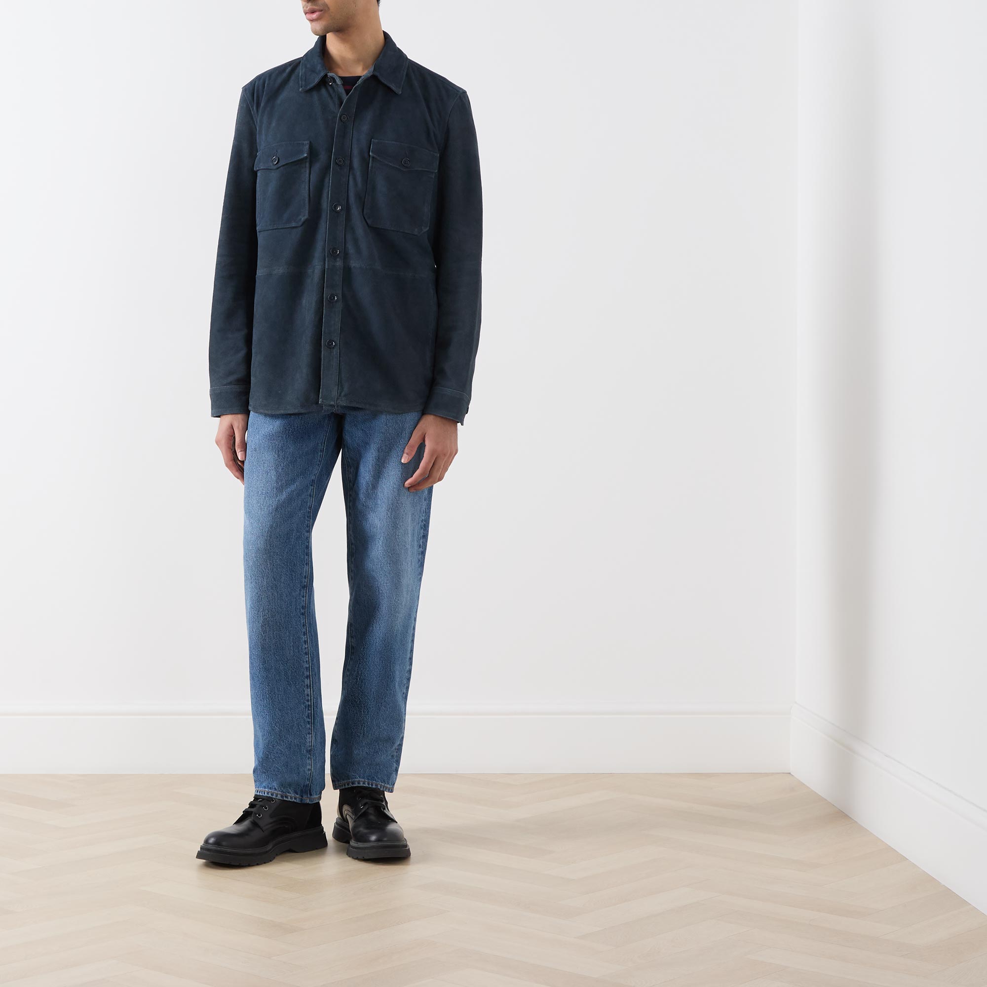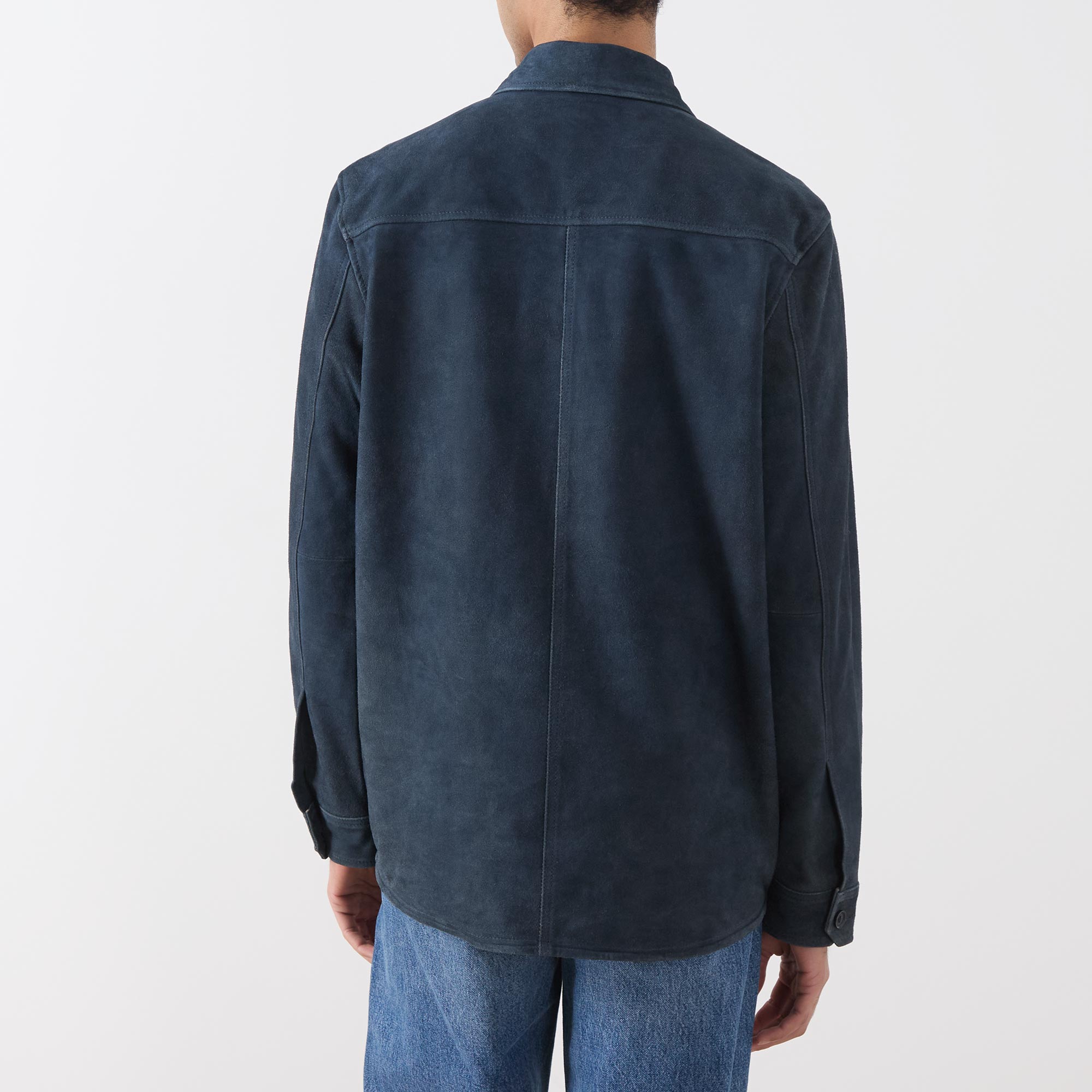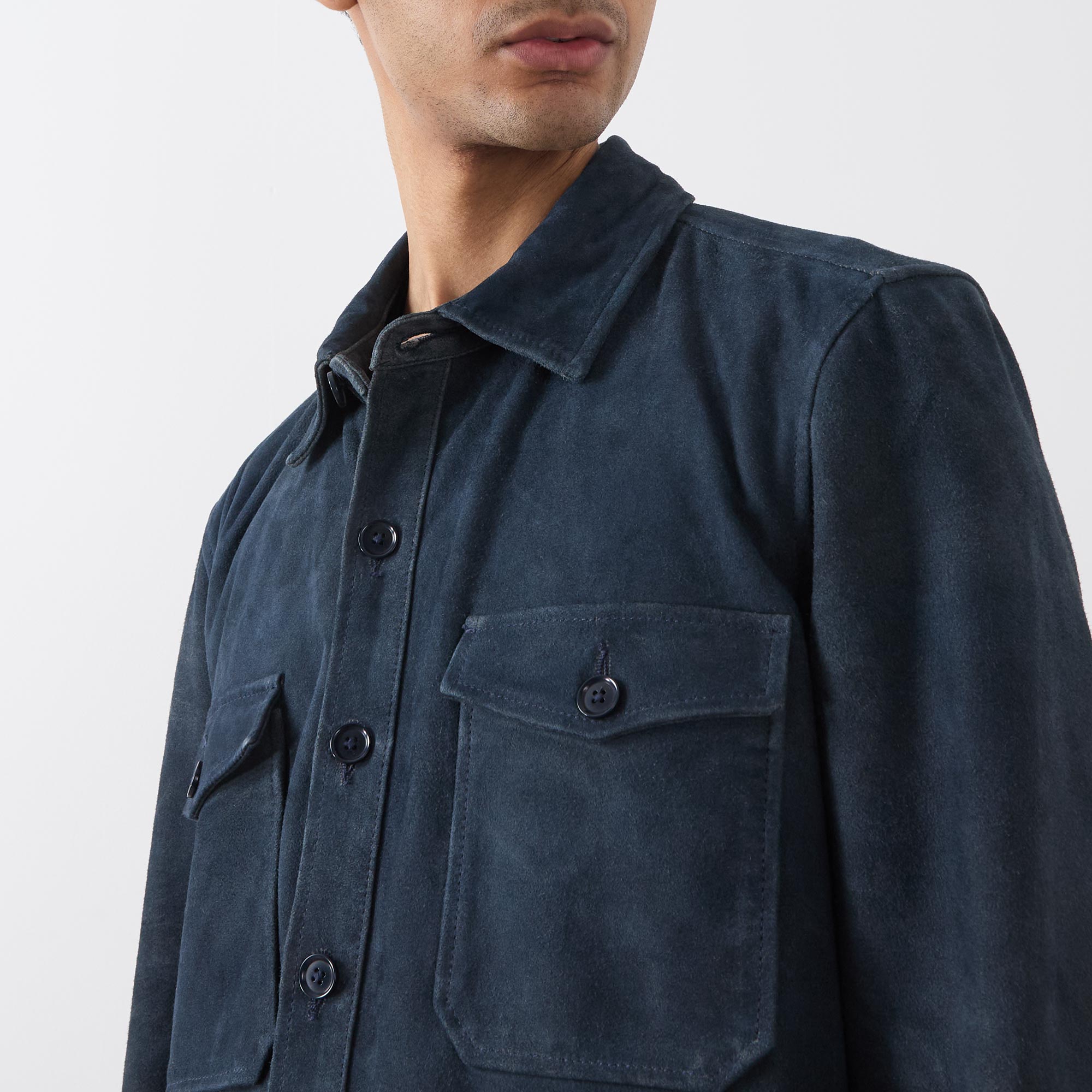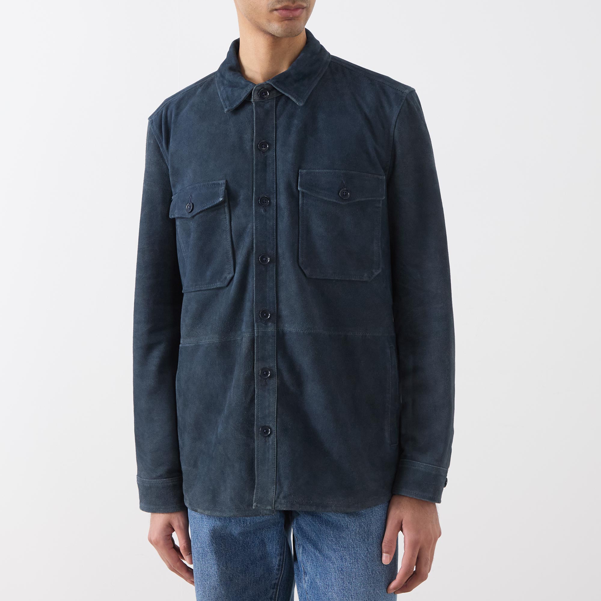 • Point collar, long sleeves, buttoned cuffs, front button placket, two chest flap pockets with button fastenings, curved hem, suede finish