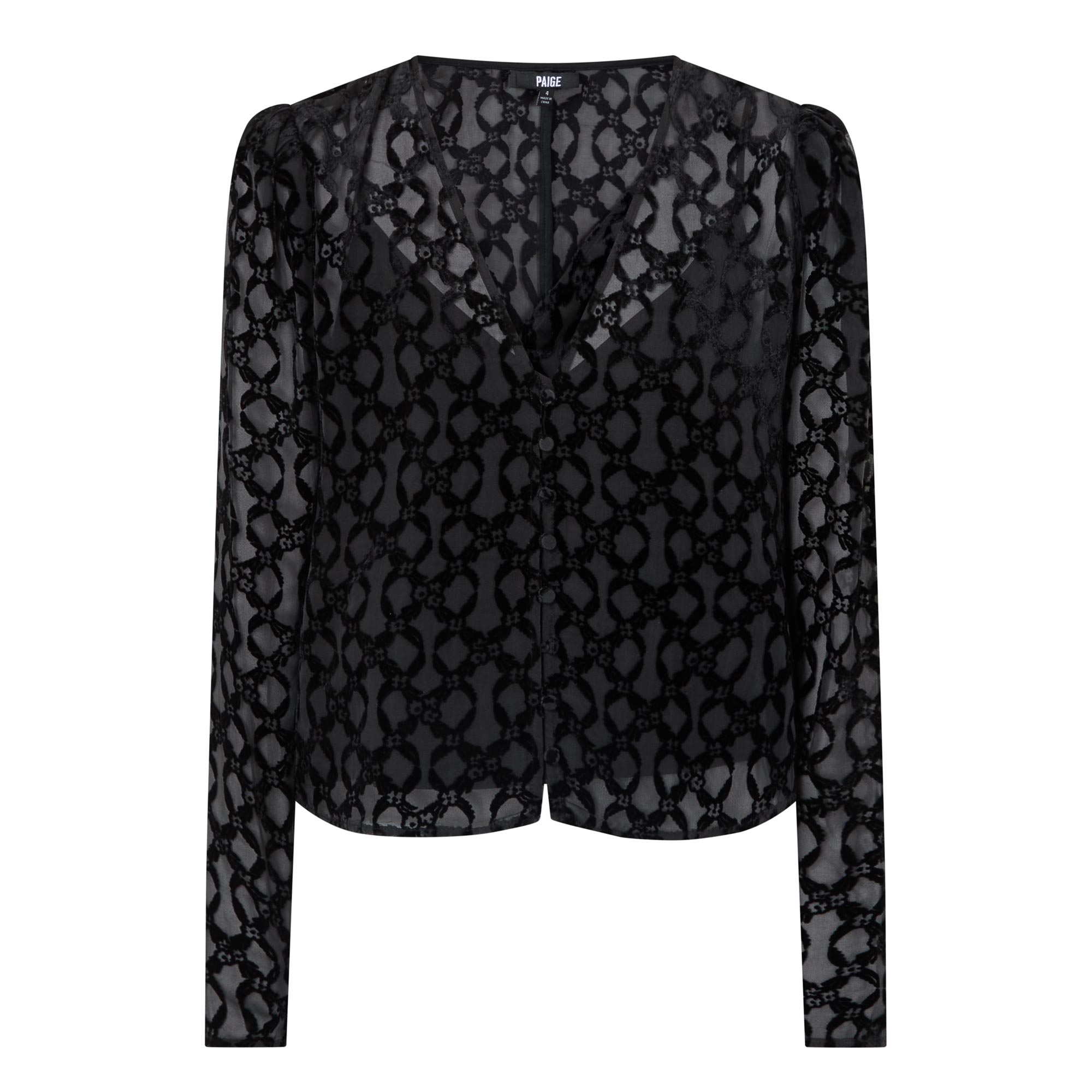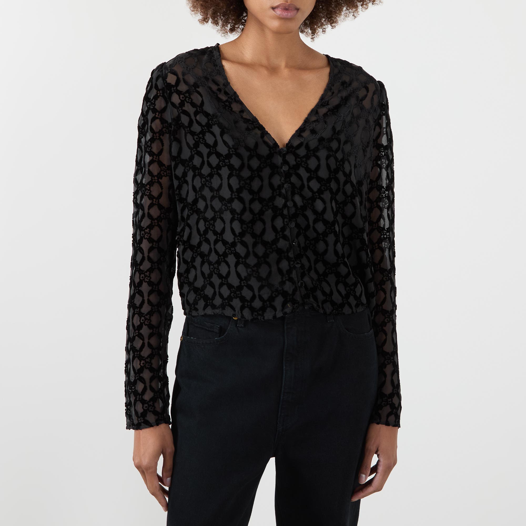 - Long blouson sleeves, V-neckline, front button fastenings, printed design, straight hemline, semi-sheer finish, smooth silk-blend fabrication