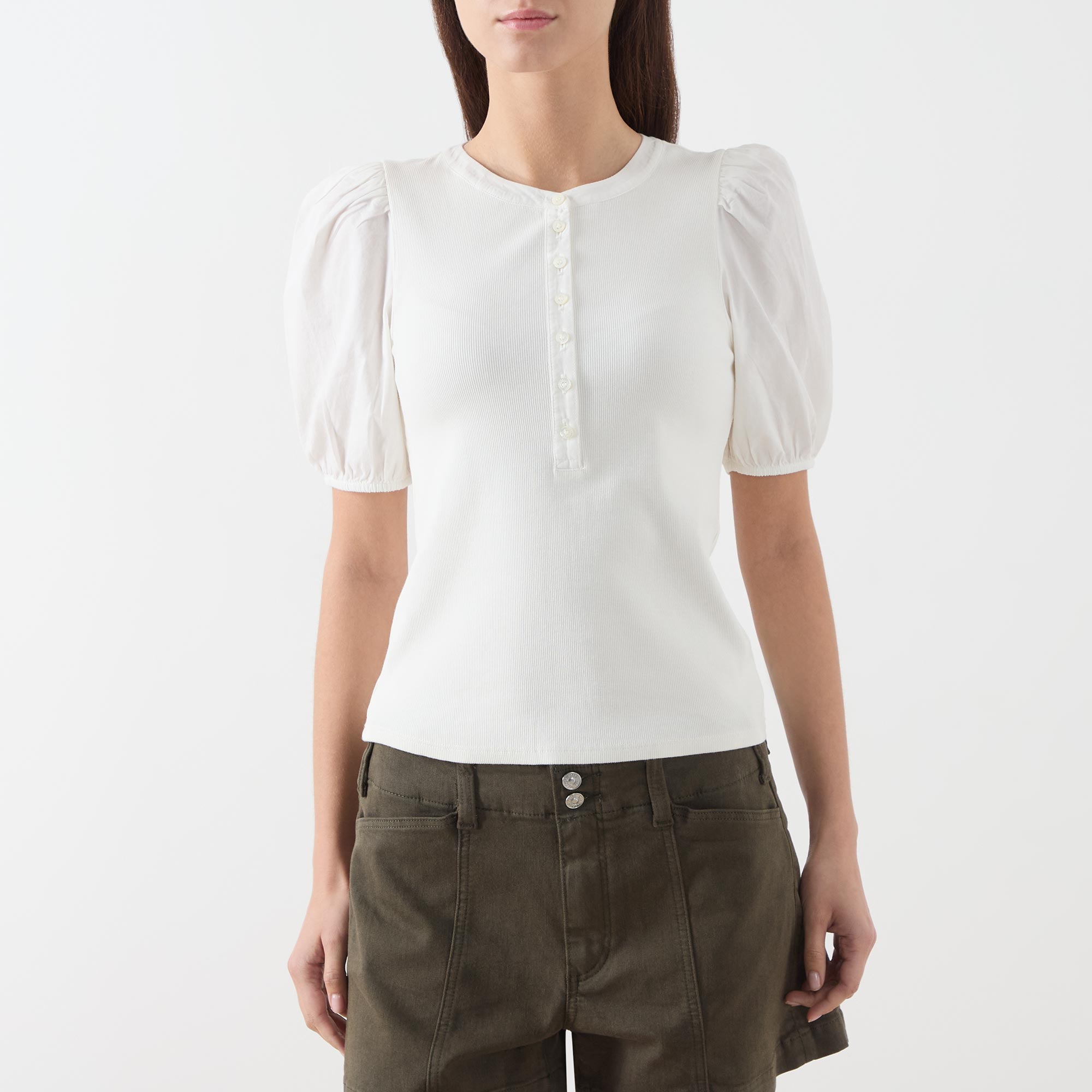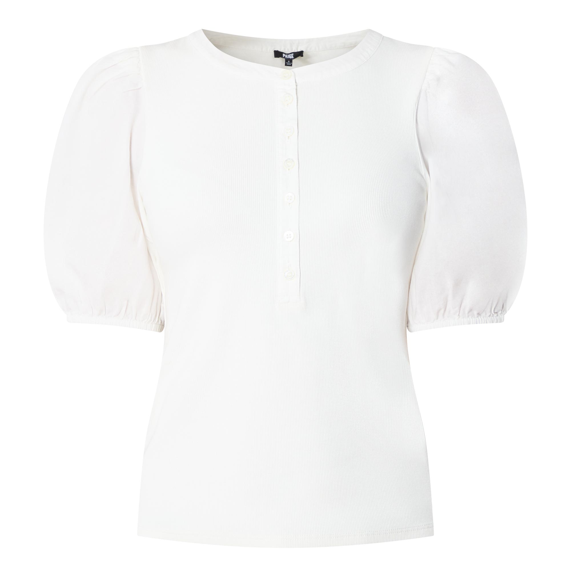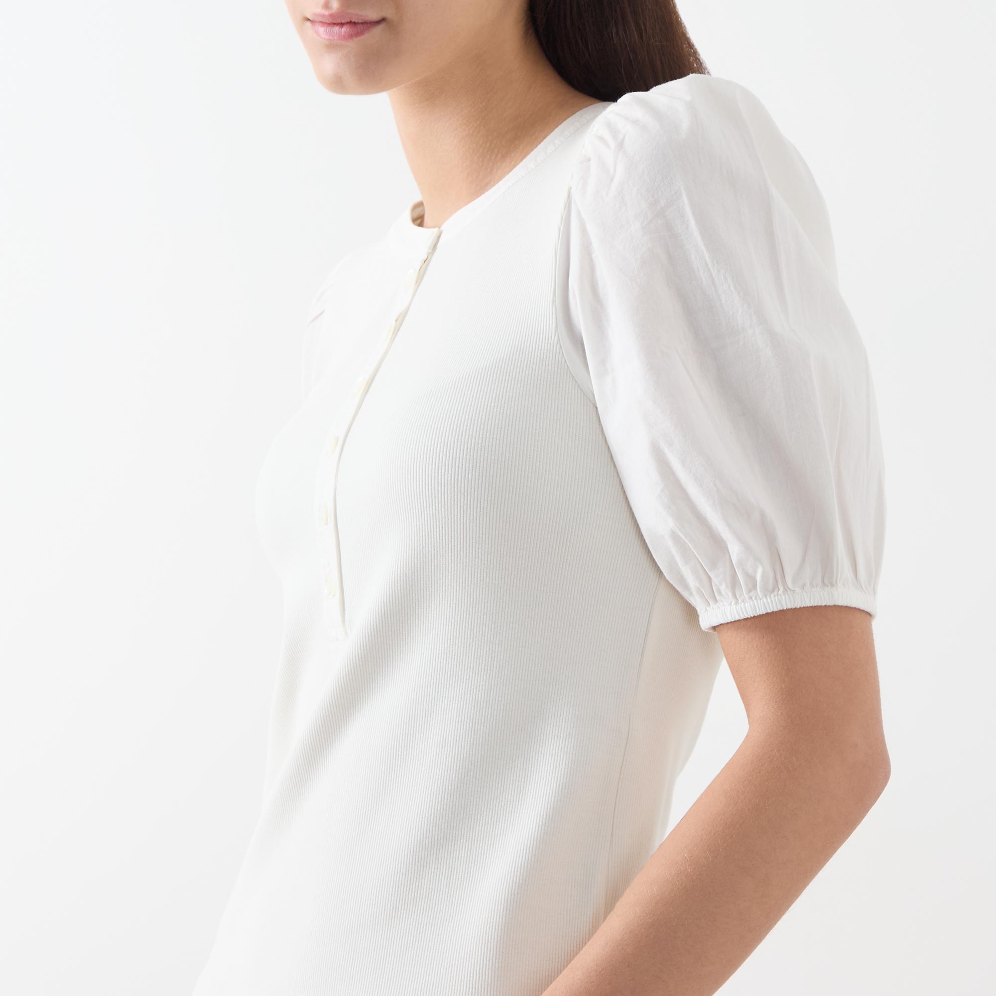 - Round neckline, half-button fastening, short puff sleeves, elasticated cuffs, straight hemline, soft ribbed finish