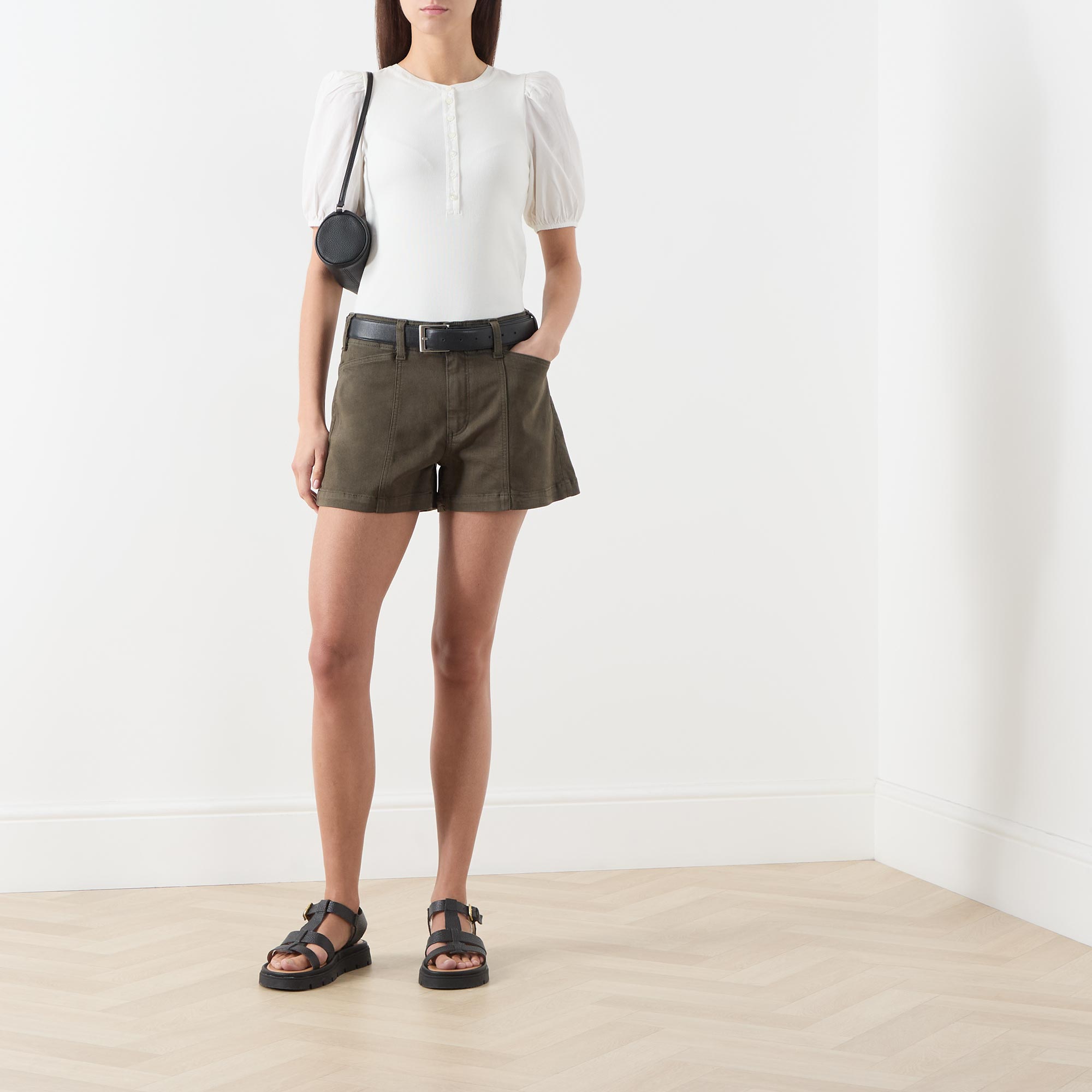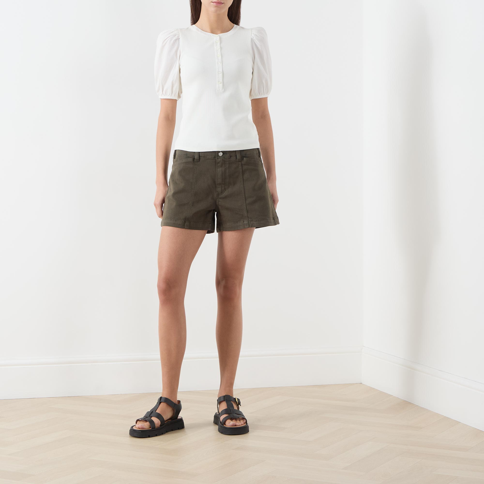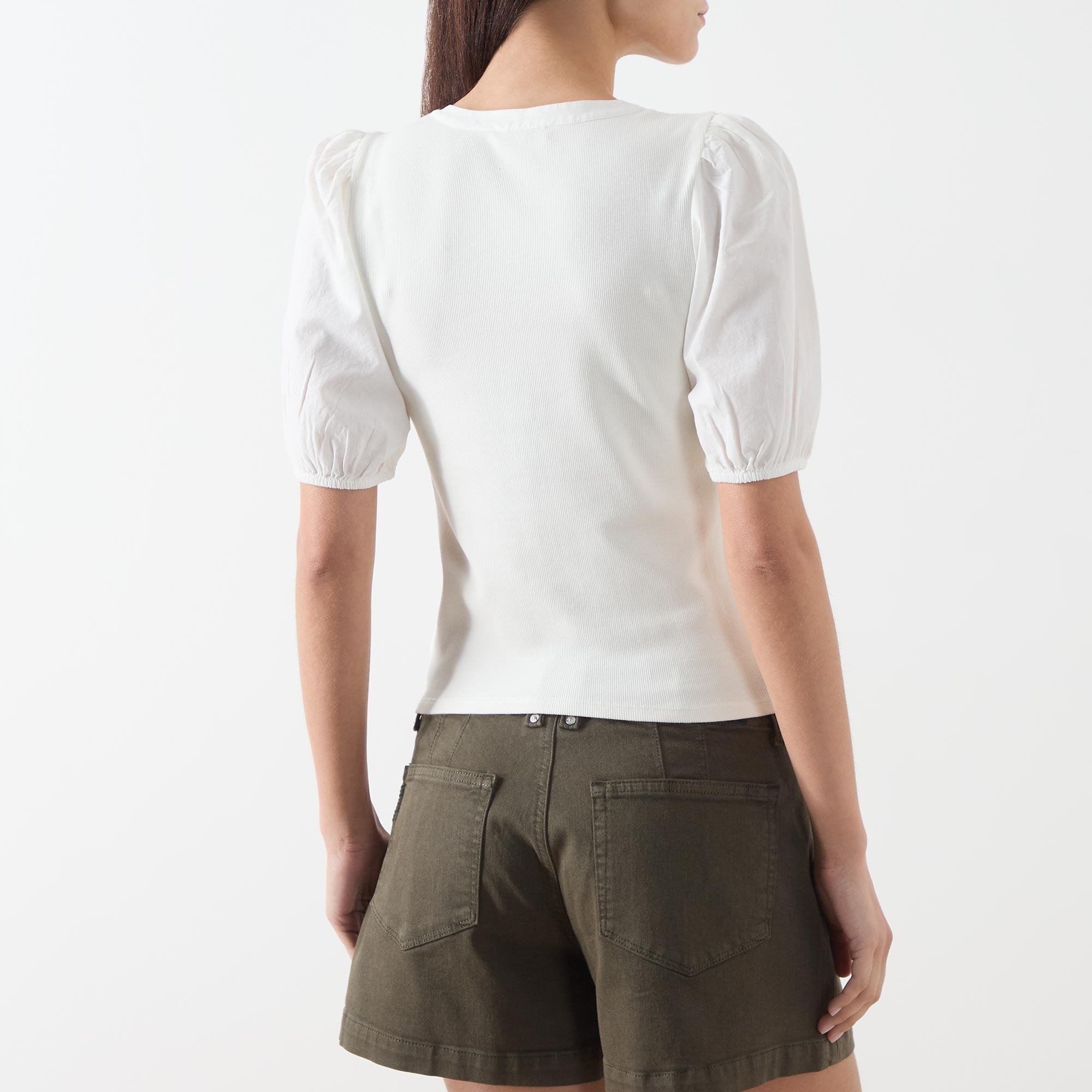 - Round neckline, half-button fastening, short puff sleeves, elasticated cuffs, straight hemline, soft ribbed finish
