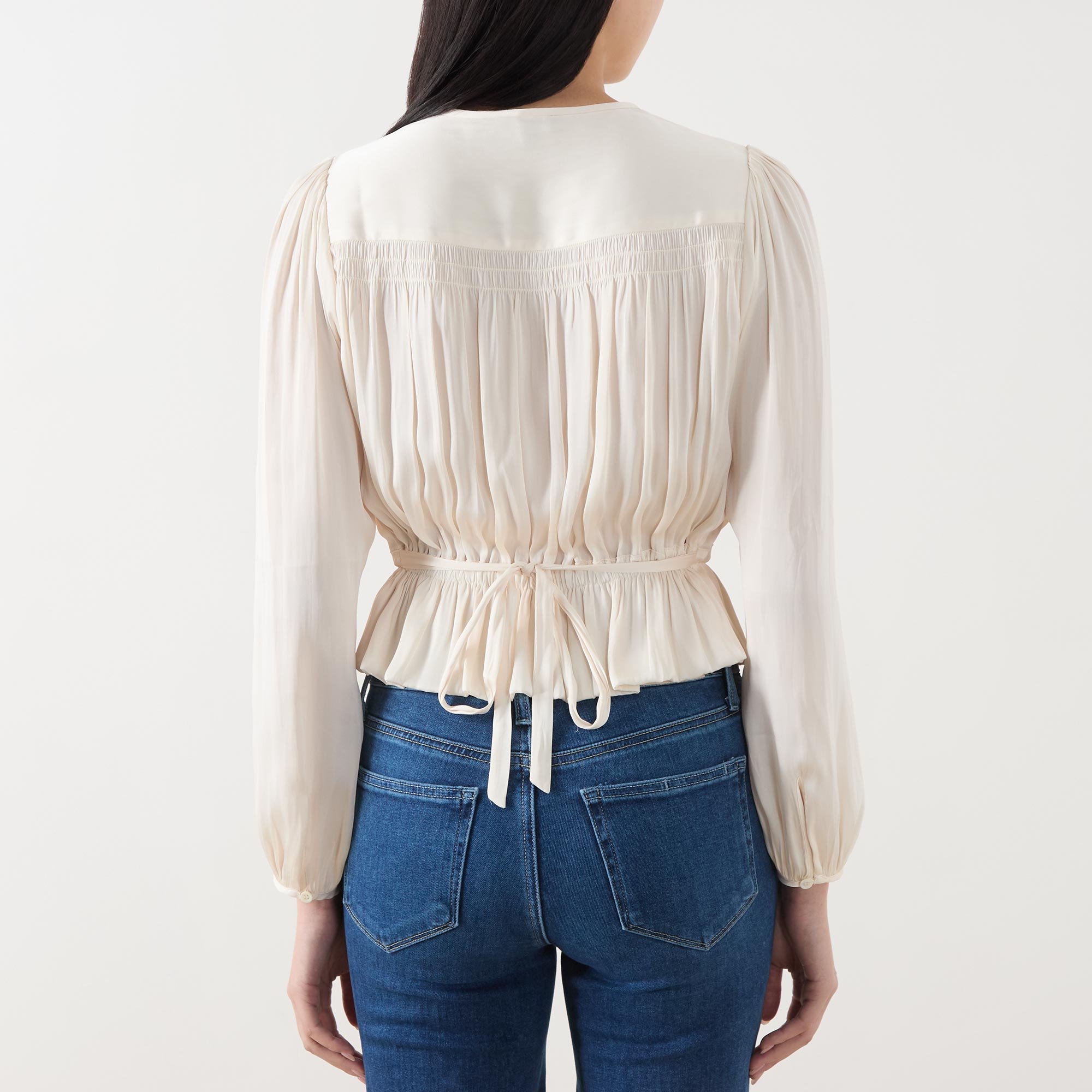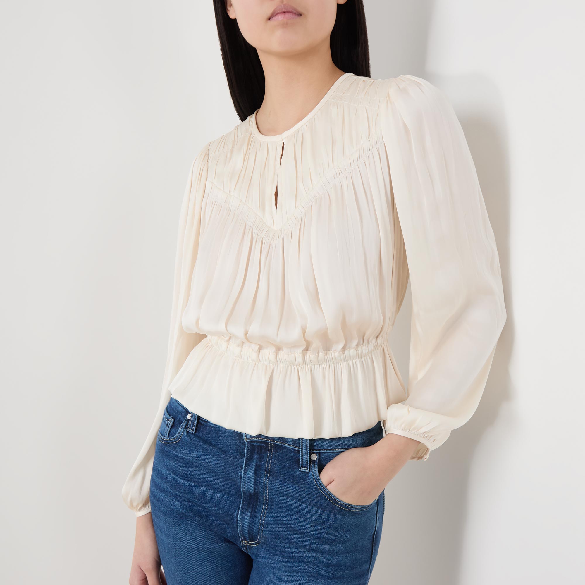 • Round neckline with keyhole details, long blouson-style sleeves, elasticated cuffs, peplum silhouette, pleated details, elasticated waist with self-tie belt detail and adjustable fit