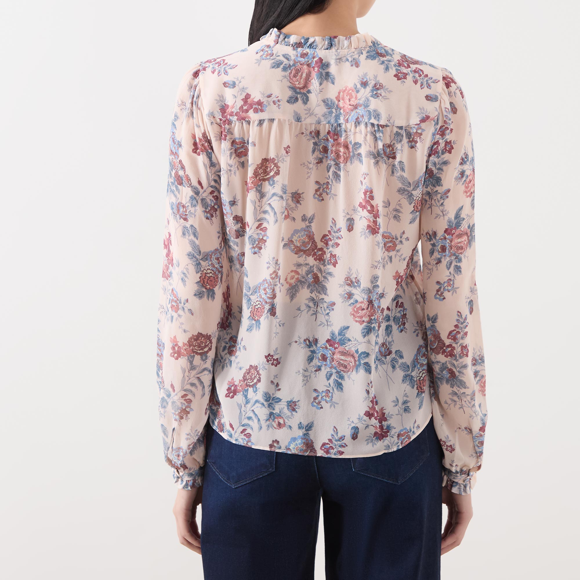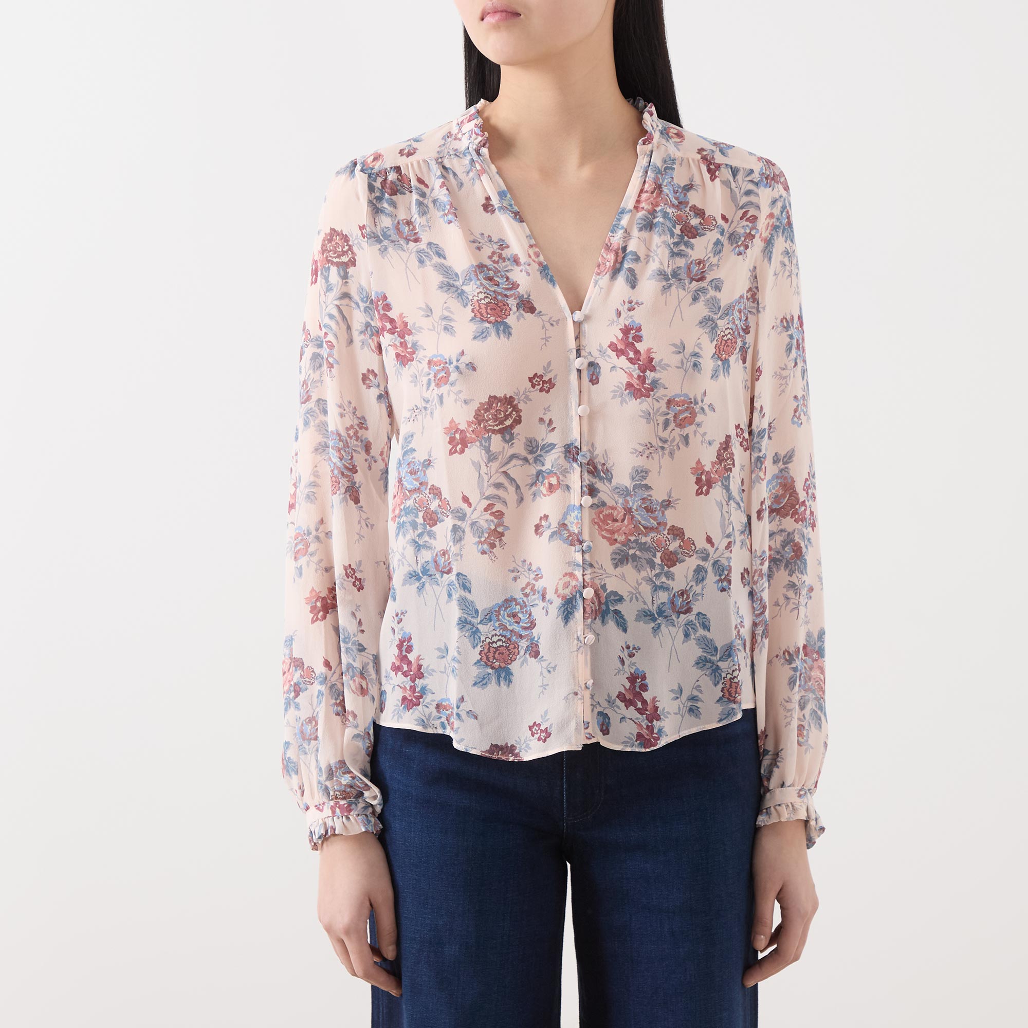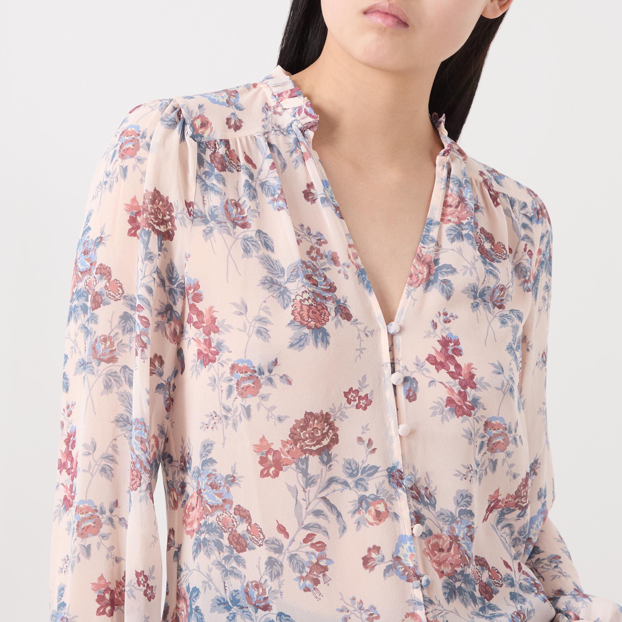 - Standing collar, V-neckline, button fastening, long sleeves, ruffle detailing, cherry blossom floral rose print