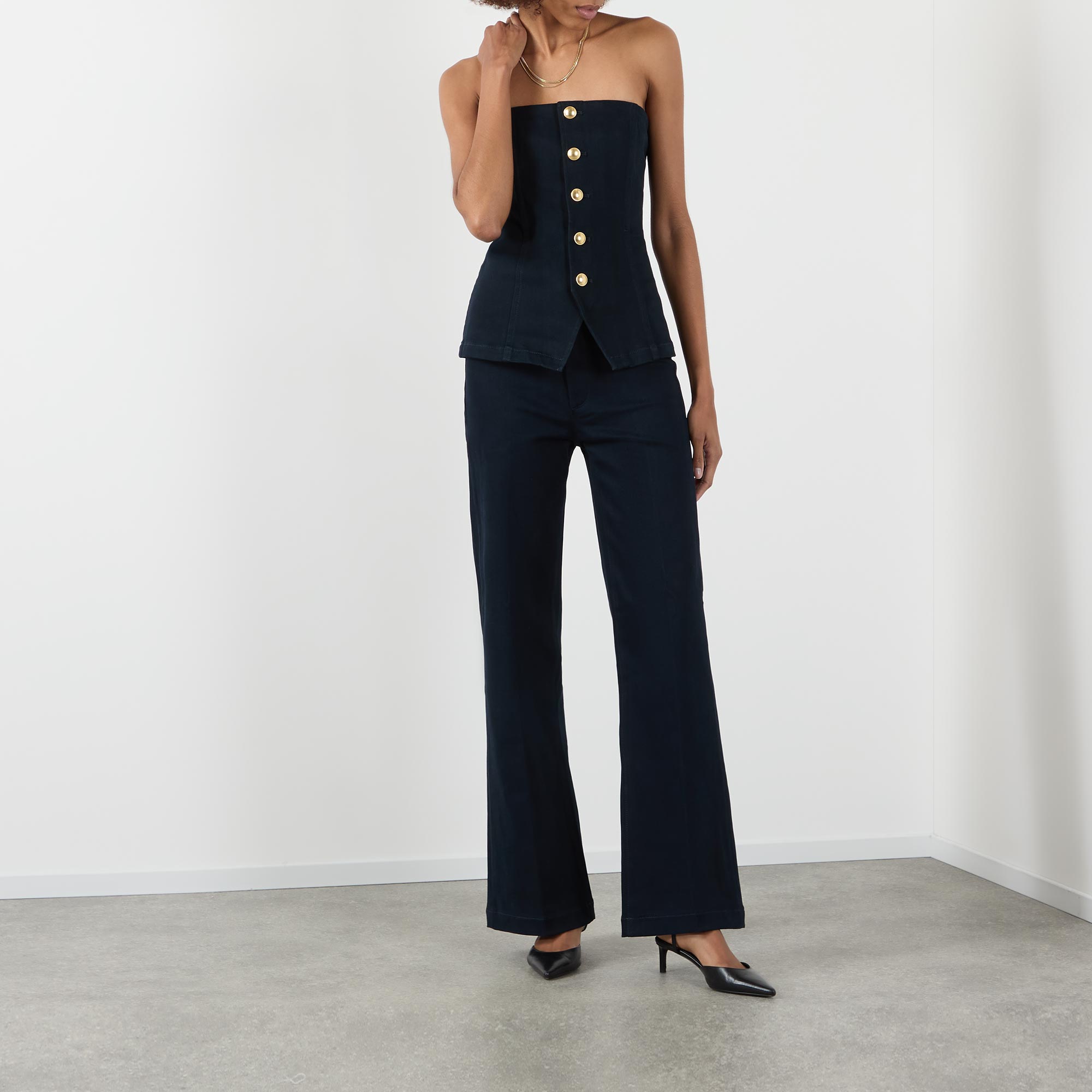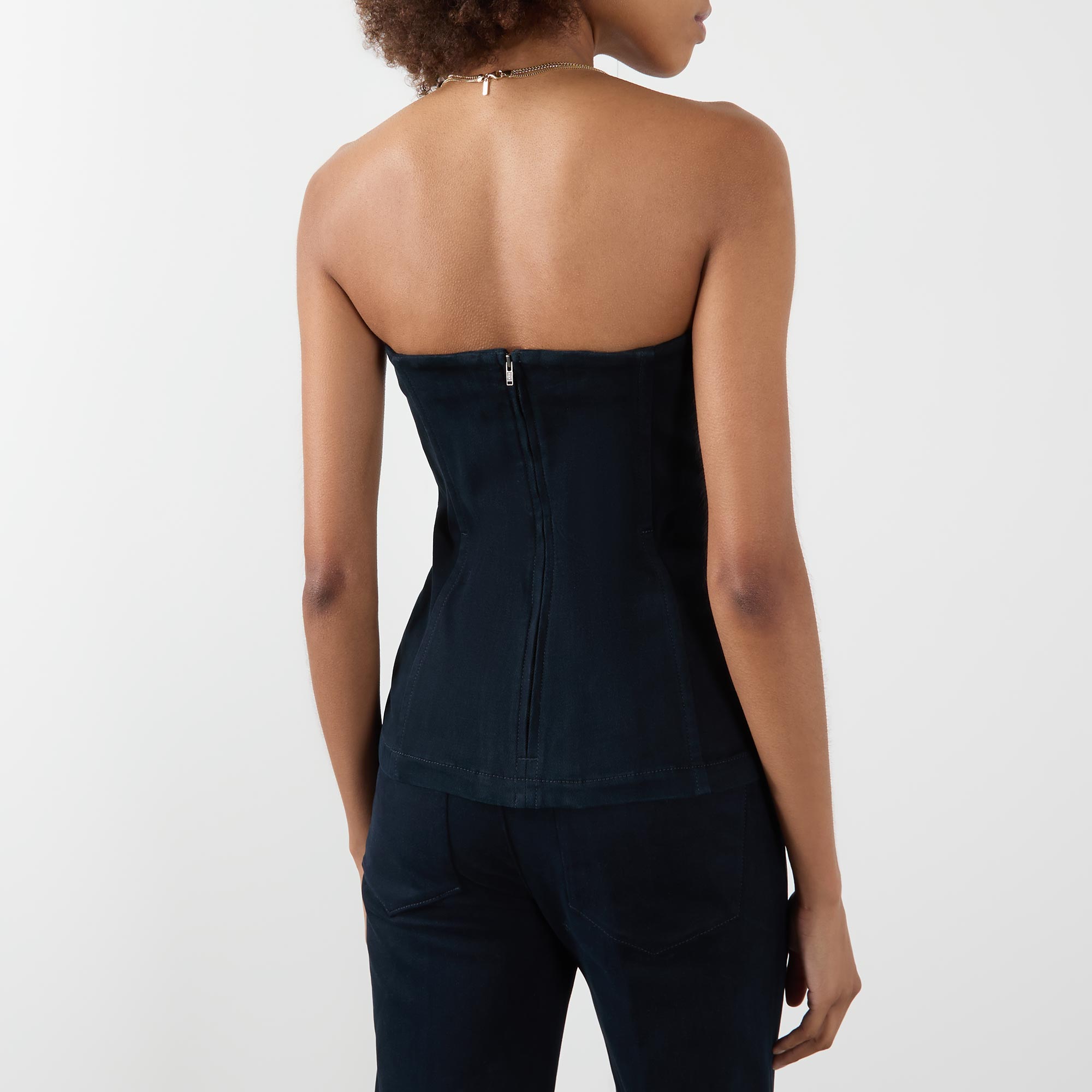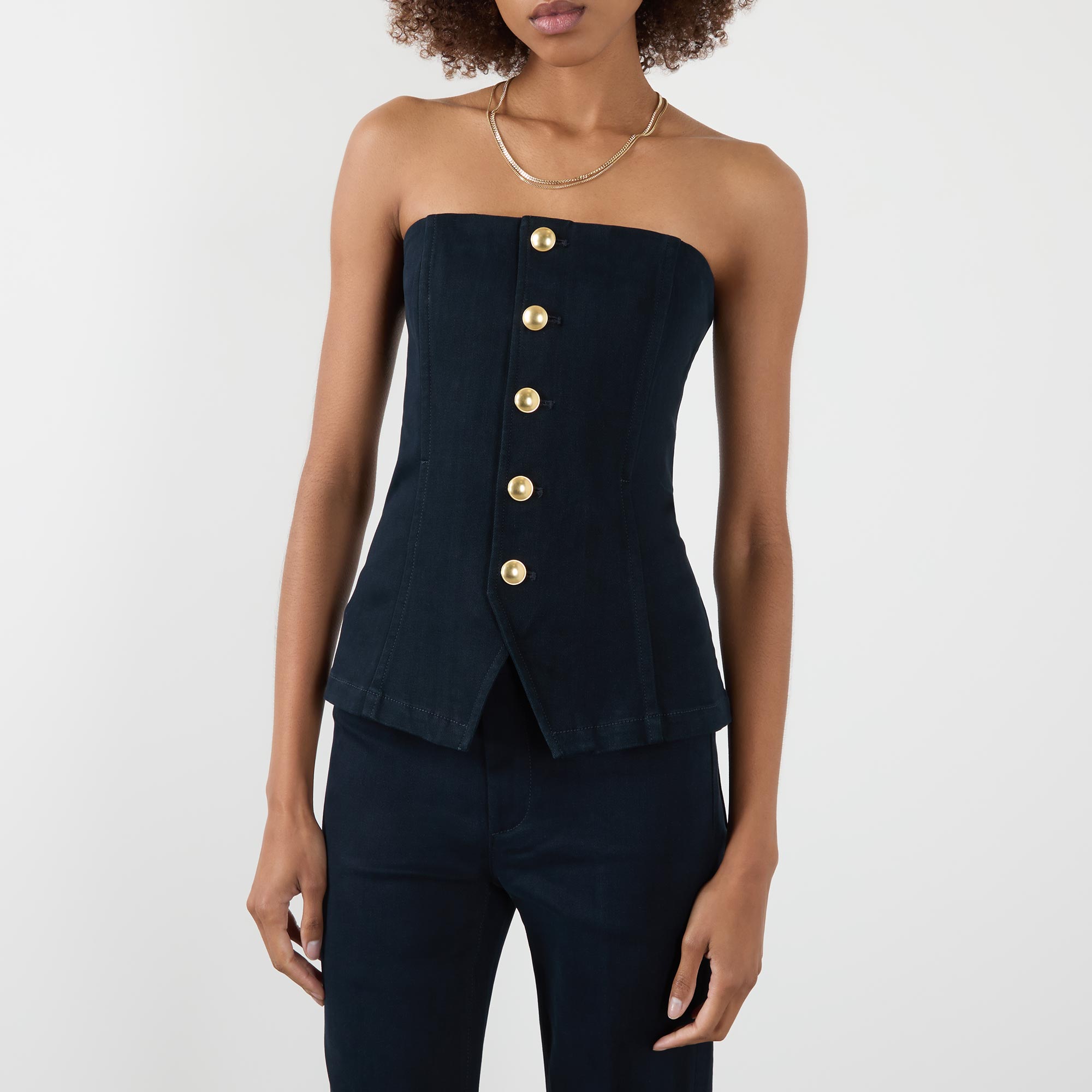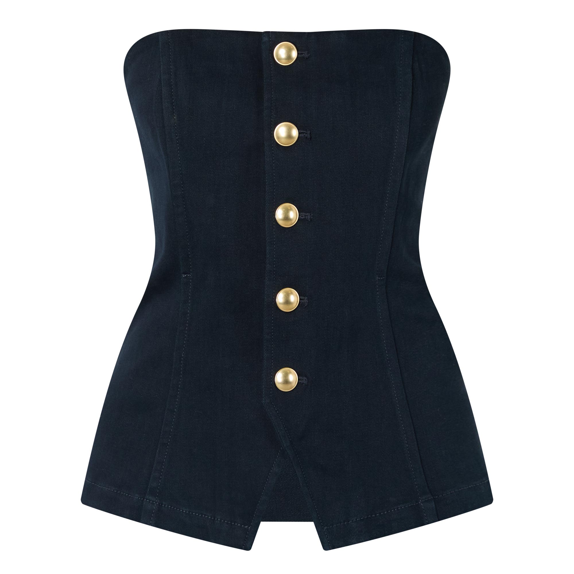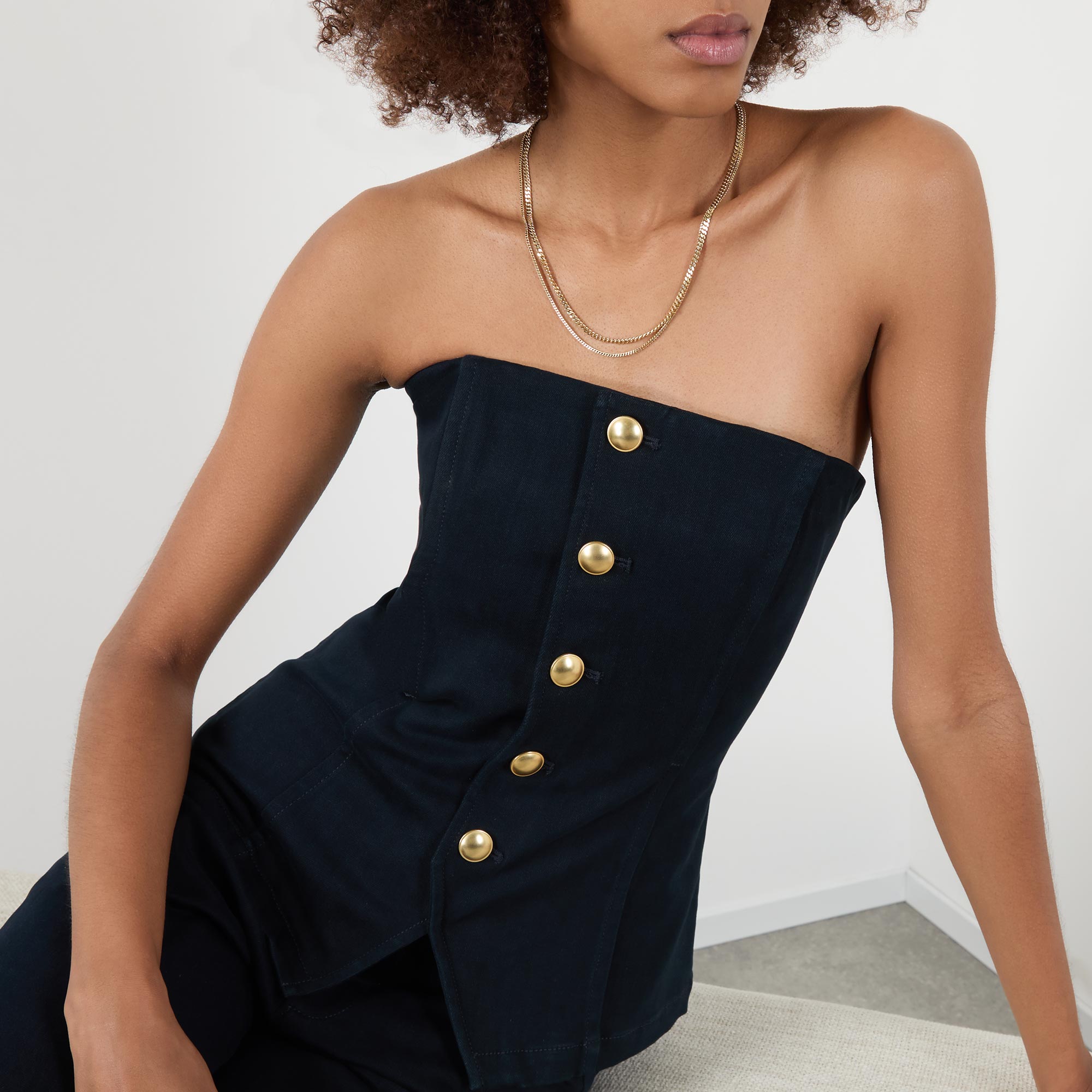 - Strapless design, front gold-tone button fastenings, boned fitted bodice, back zip-fastening closure, tonal stitching, smooth denim finish