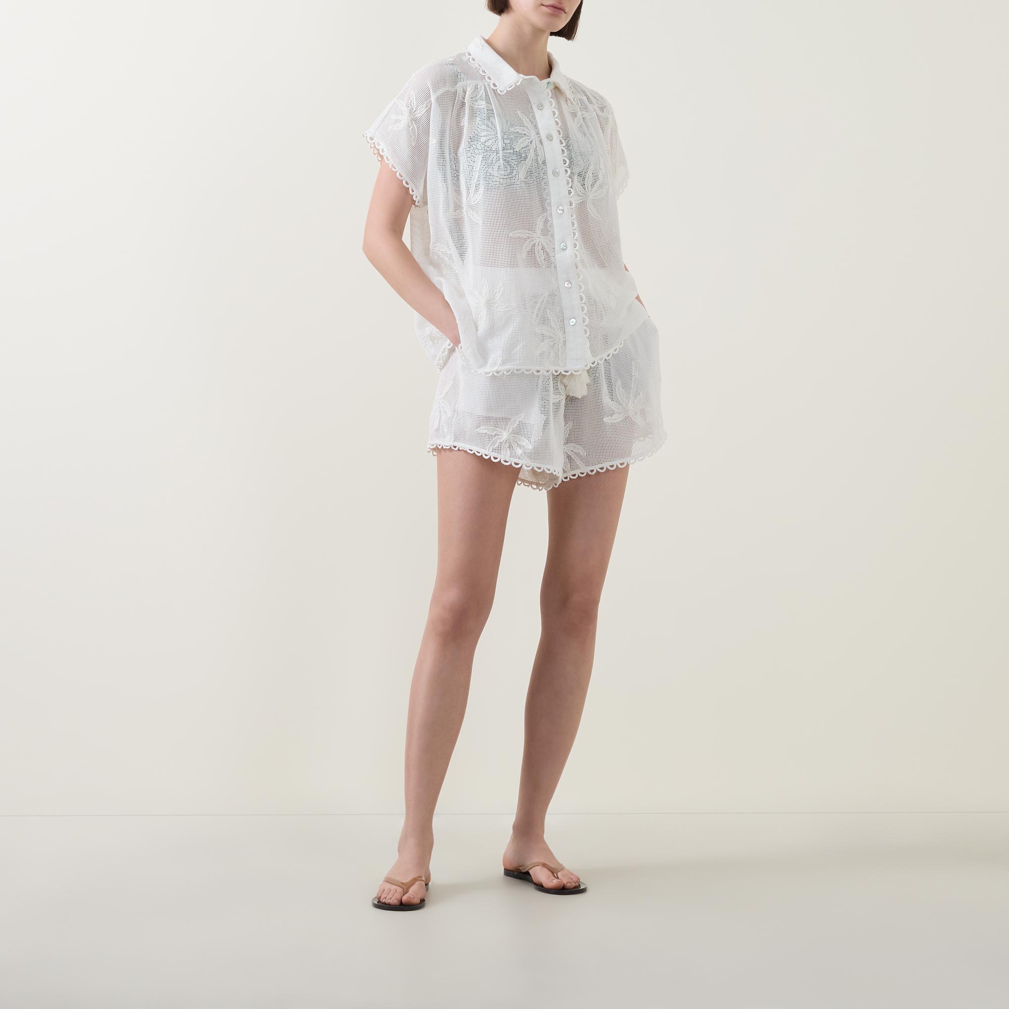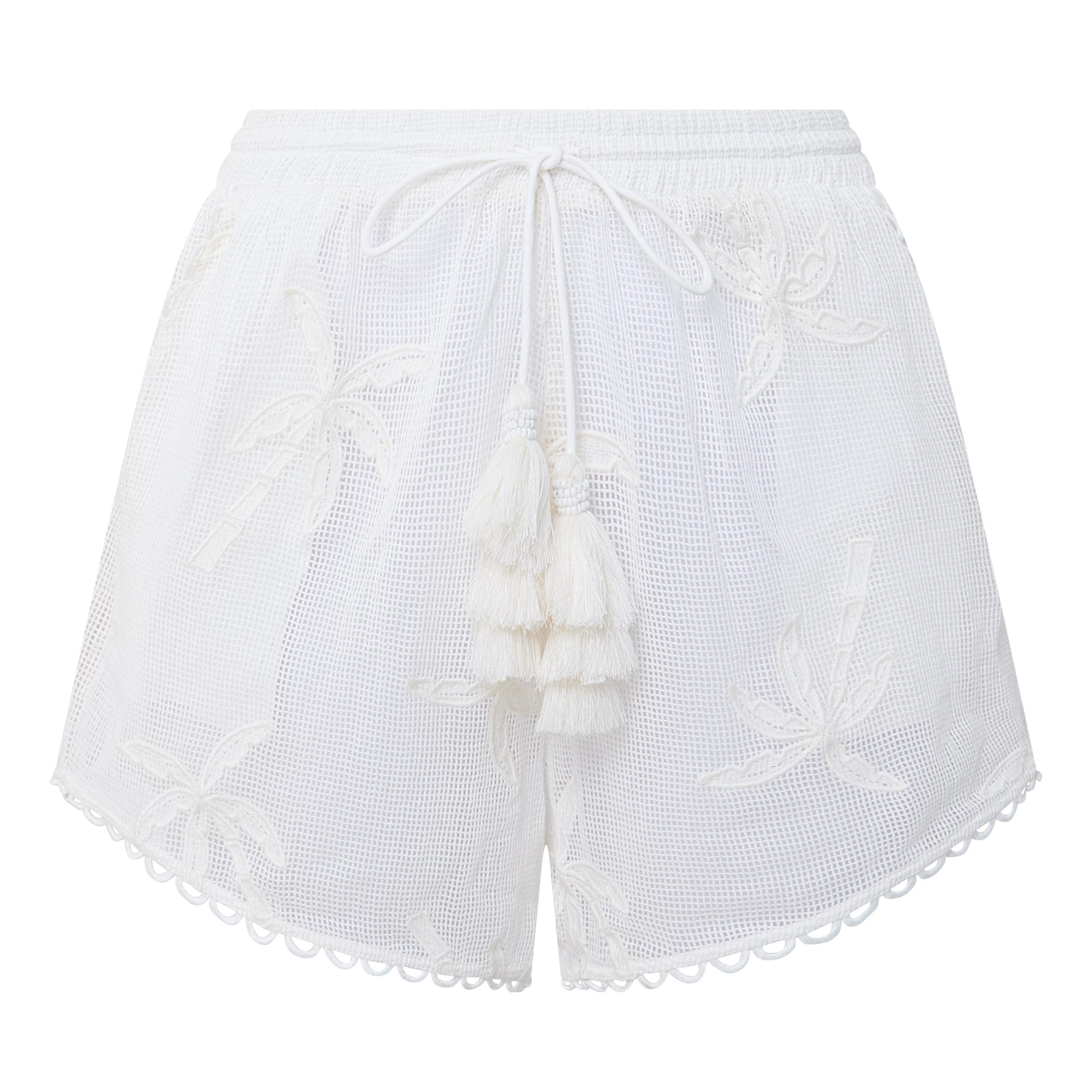 • Mid rise, straight leg, elasticated waistband, adjustable drawstring fastening with tassel detailing, two side pockets, curved hems, scallop trim detailing, embroidered palm tree detailing, semi-sheer finish