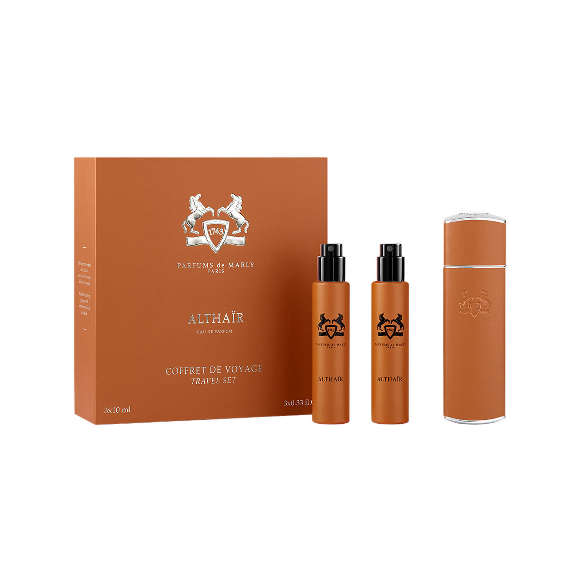 Description: Designed for fragrance lovers always on the move, the Althaïr Travel Set includes a refined and refillable Travel Case, accompanied by three 10 ml refills. Easy to refill, it allows for maintaining a unique scent trail at every moment. Althaïr combines the smoothness of vanilla, the indulgence of praline, and the brightness of orange blossom. A warm, elegant, and charismatic signature scent.