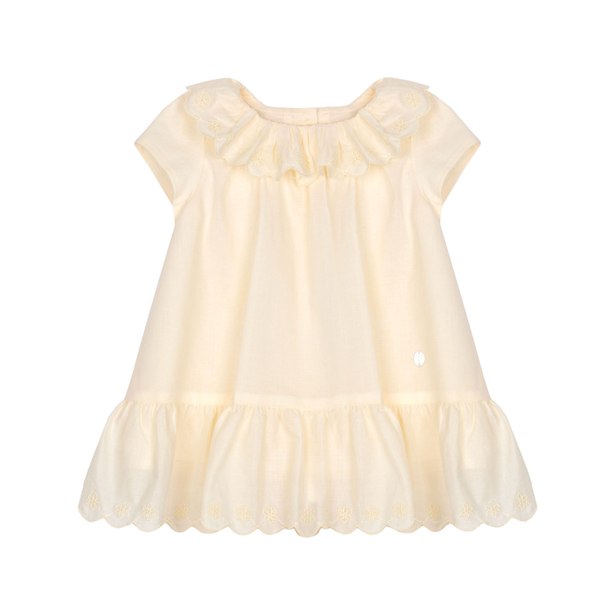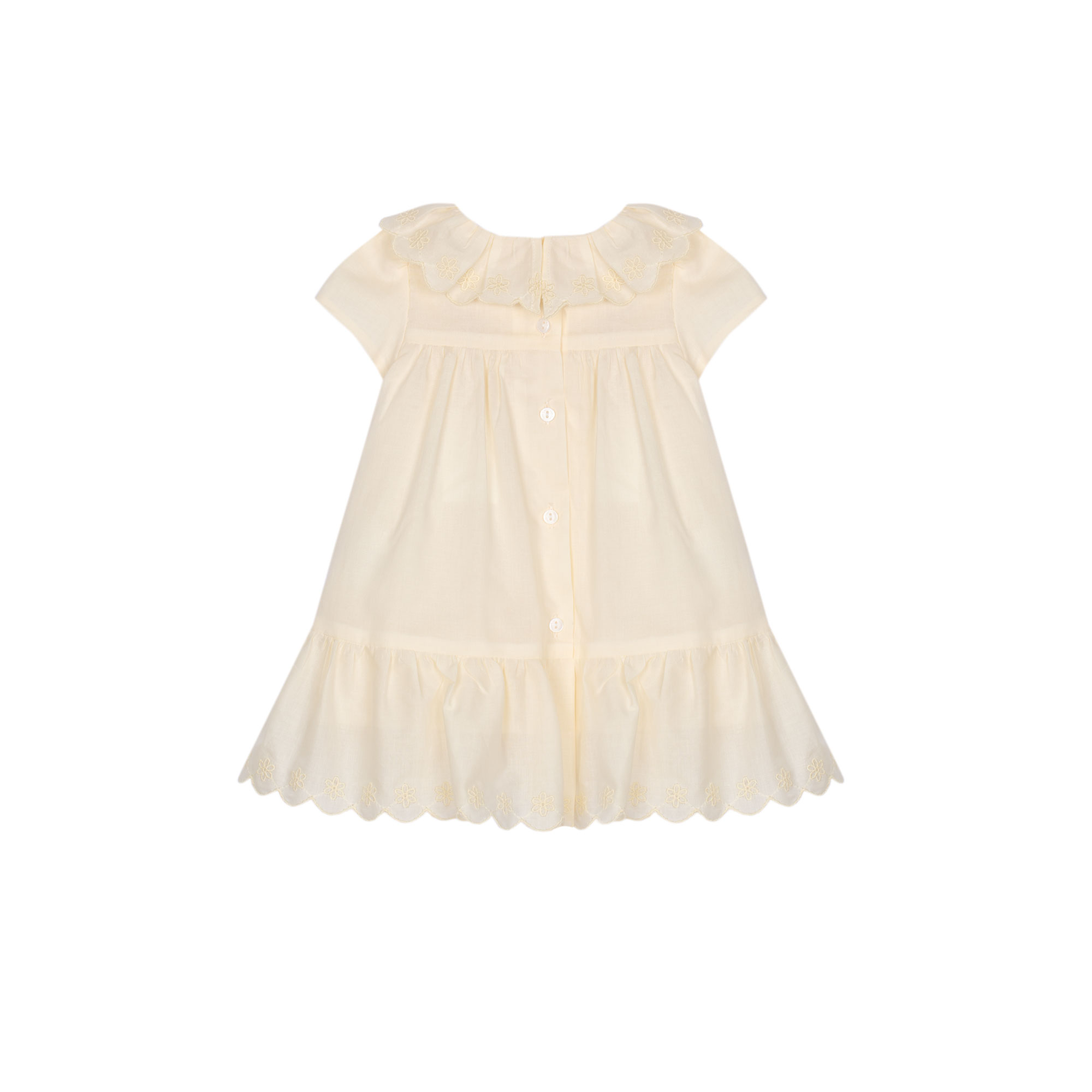 - Scalloped trim, ruffle neckline, floral embroidery, logo detail, short sleeves, flared silhouette, button fastenings