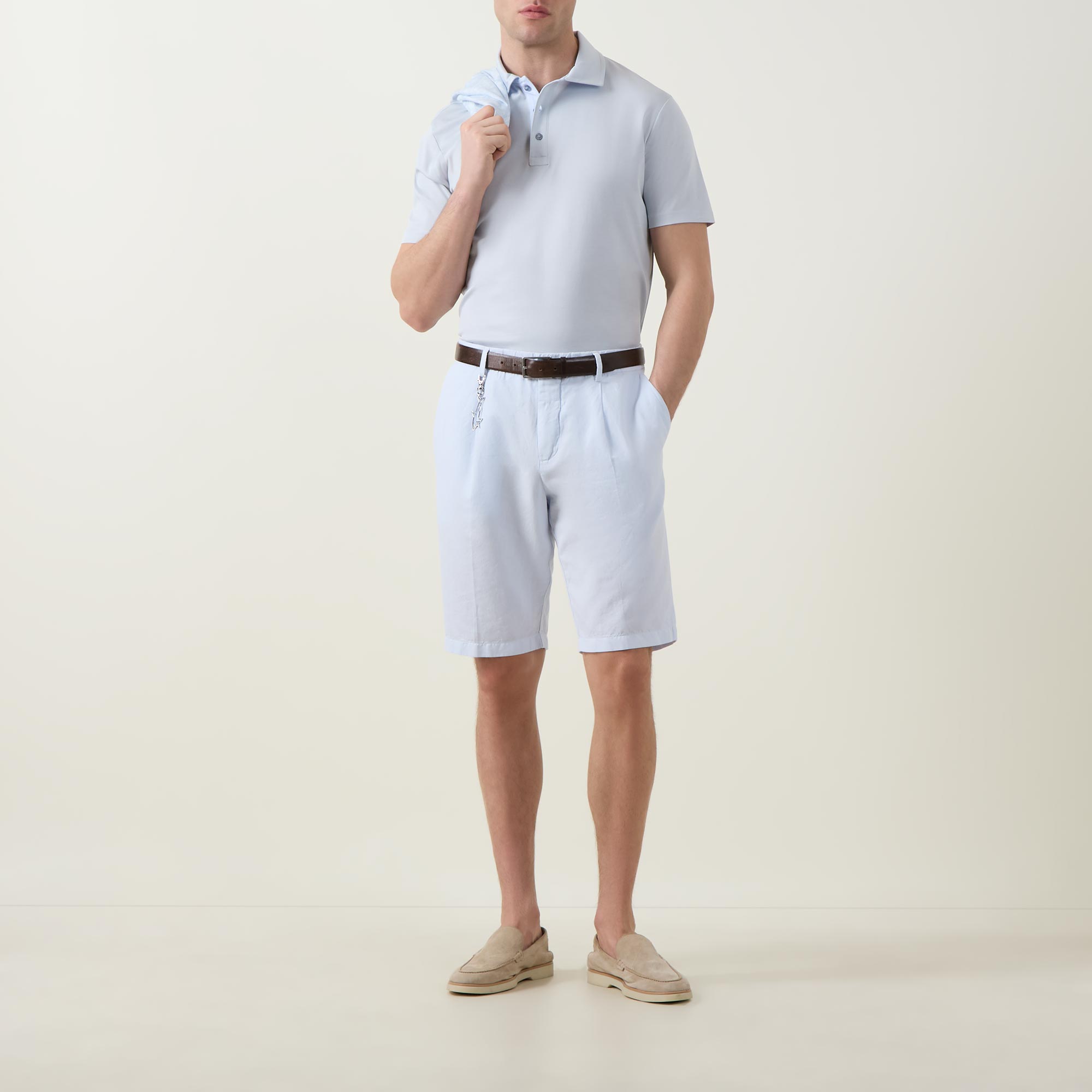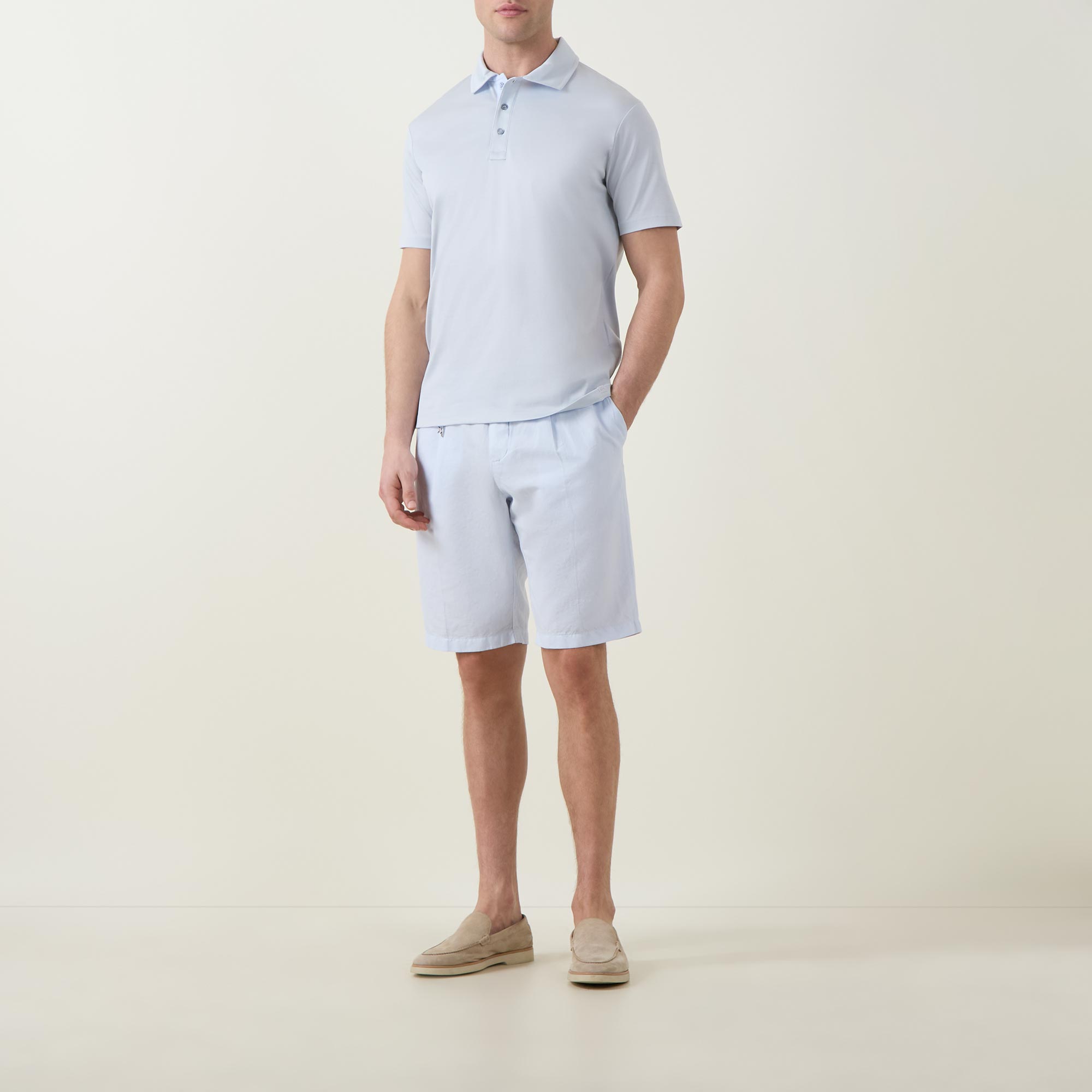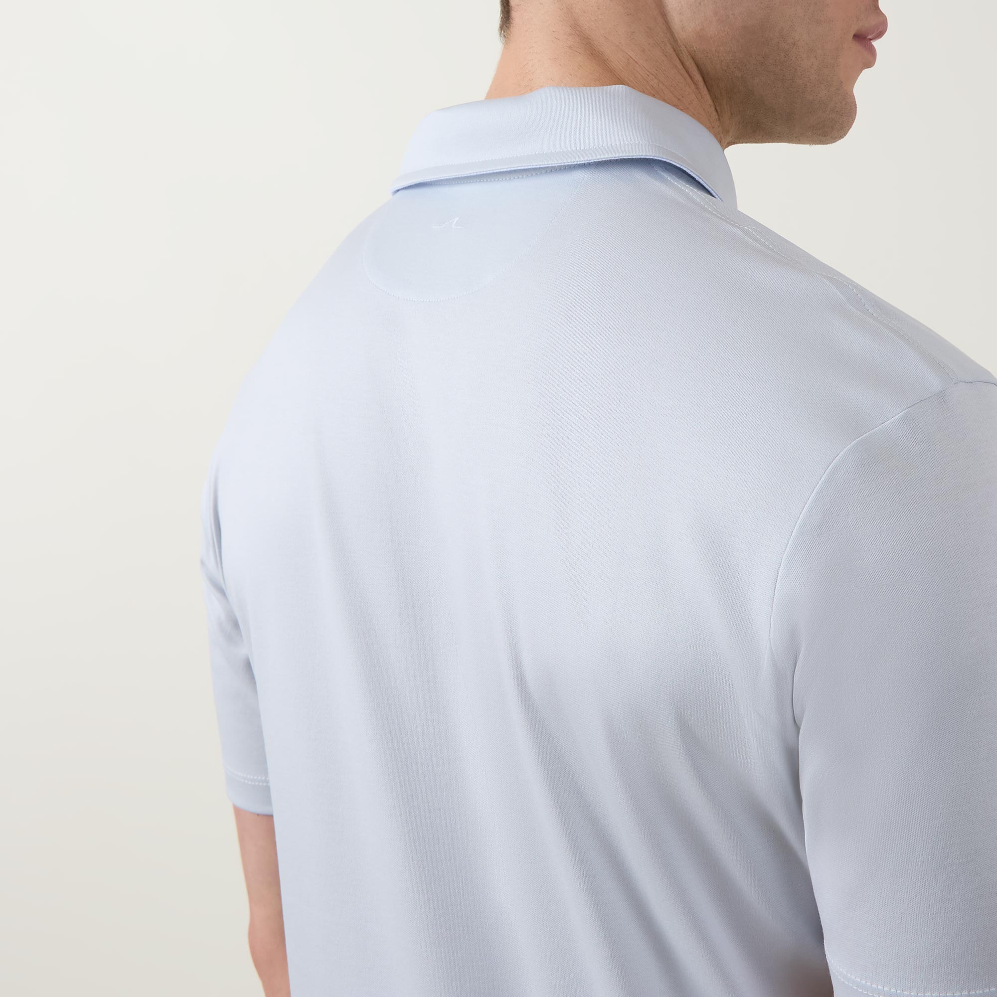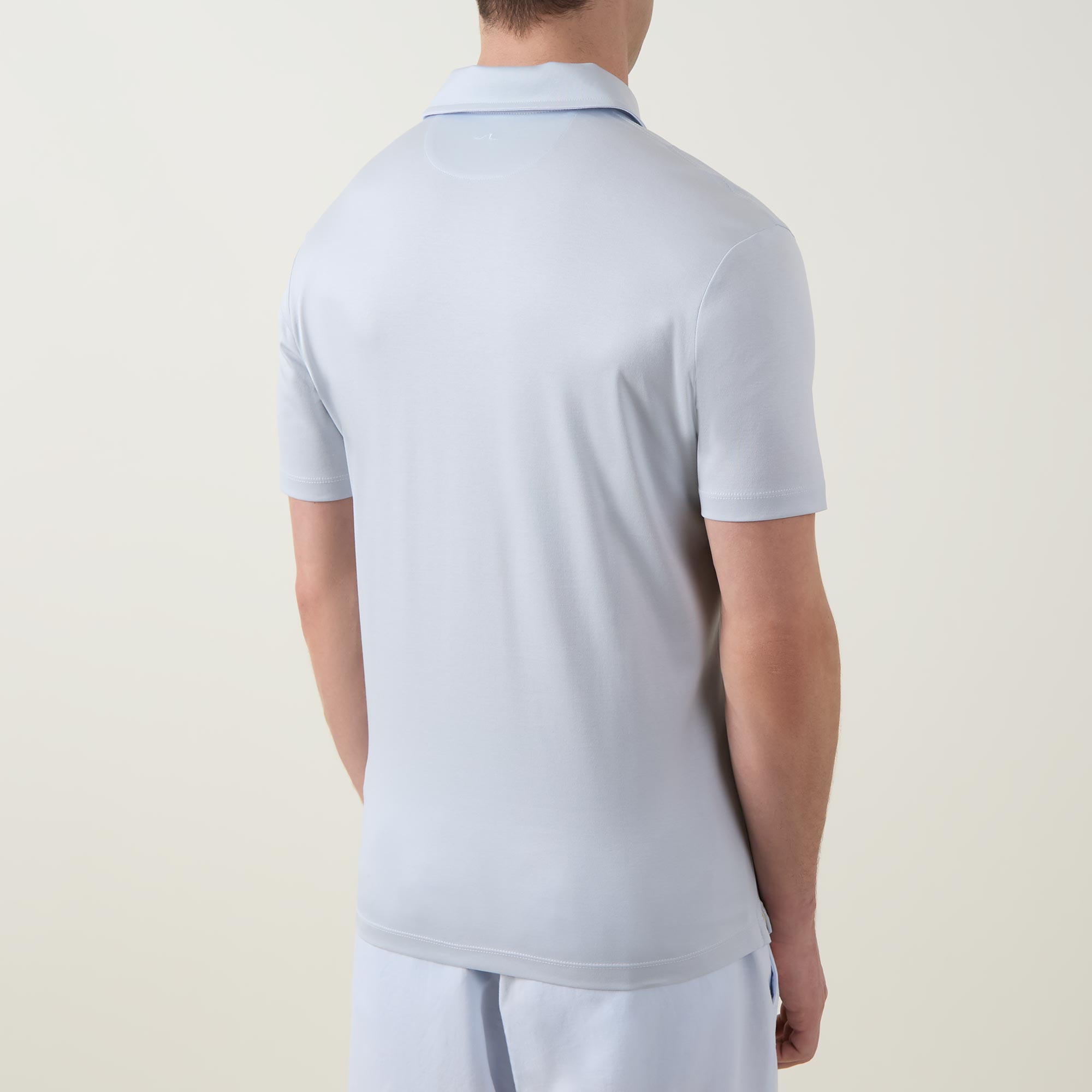 - Polo collar, short sleeves, three-button placket, tonal stitching, straight hemline, smooth fabric
