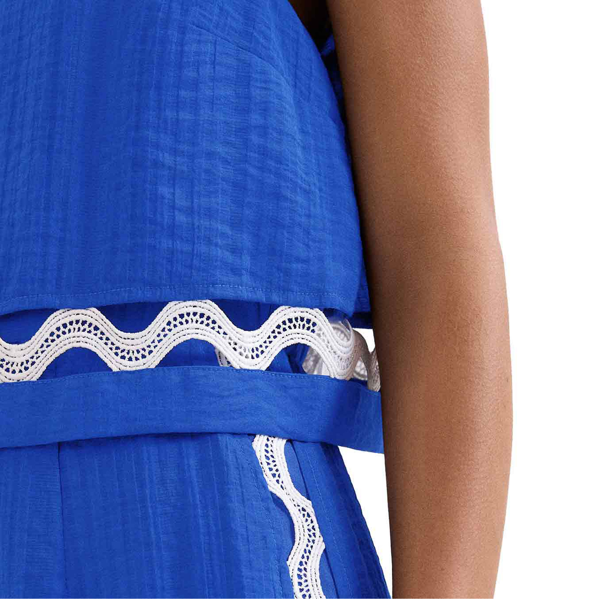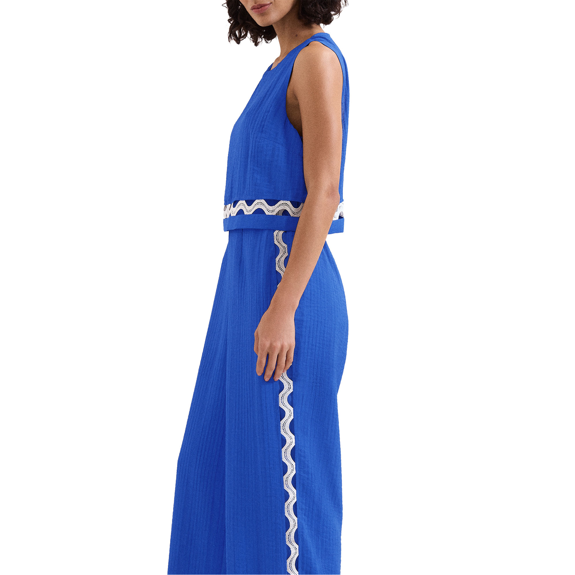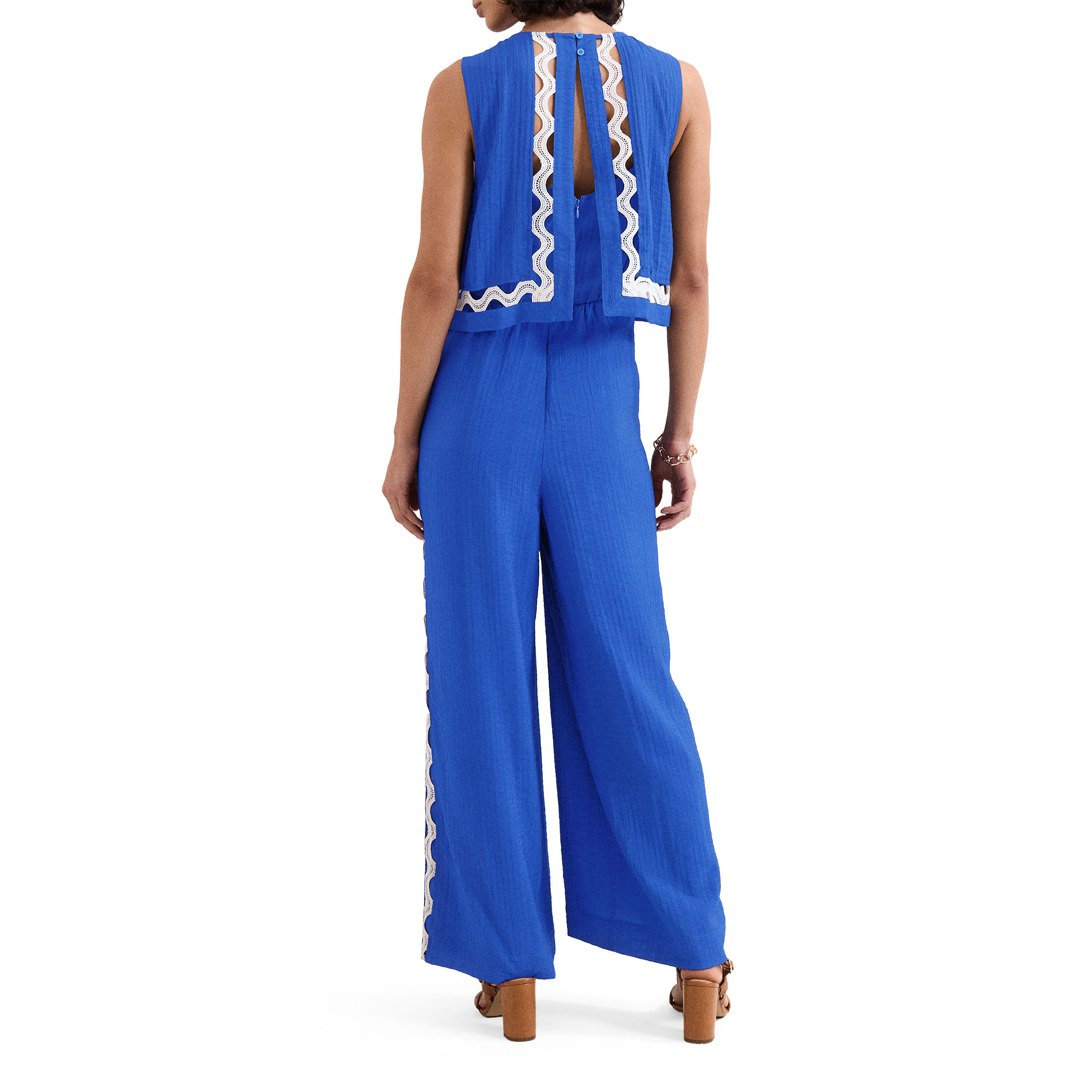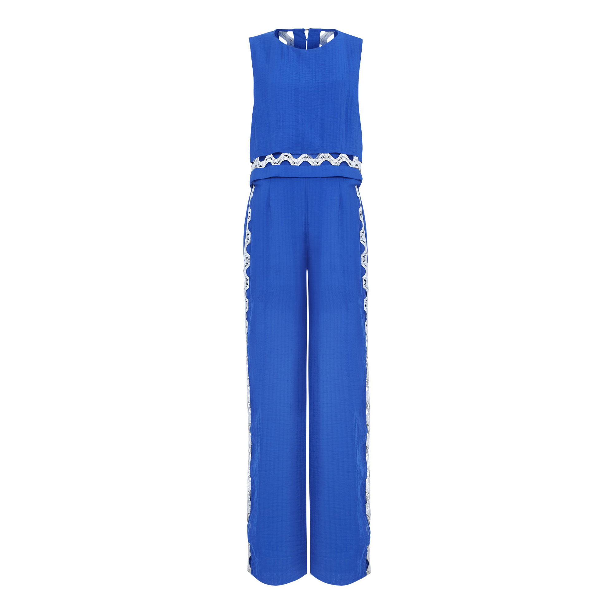- Contrast cutwork detailing, pleating throughout, wide-leg silhouette, concealed zip fastening, sleeveless