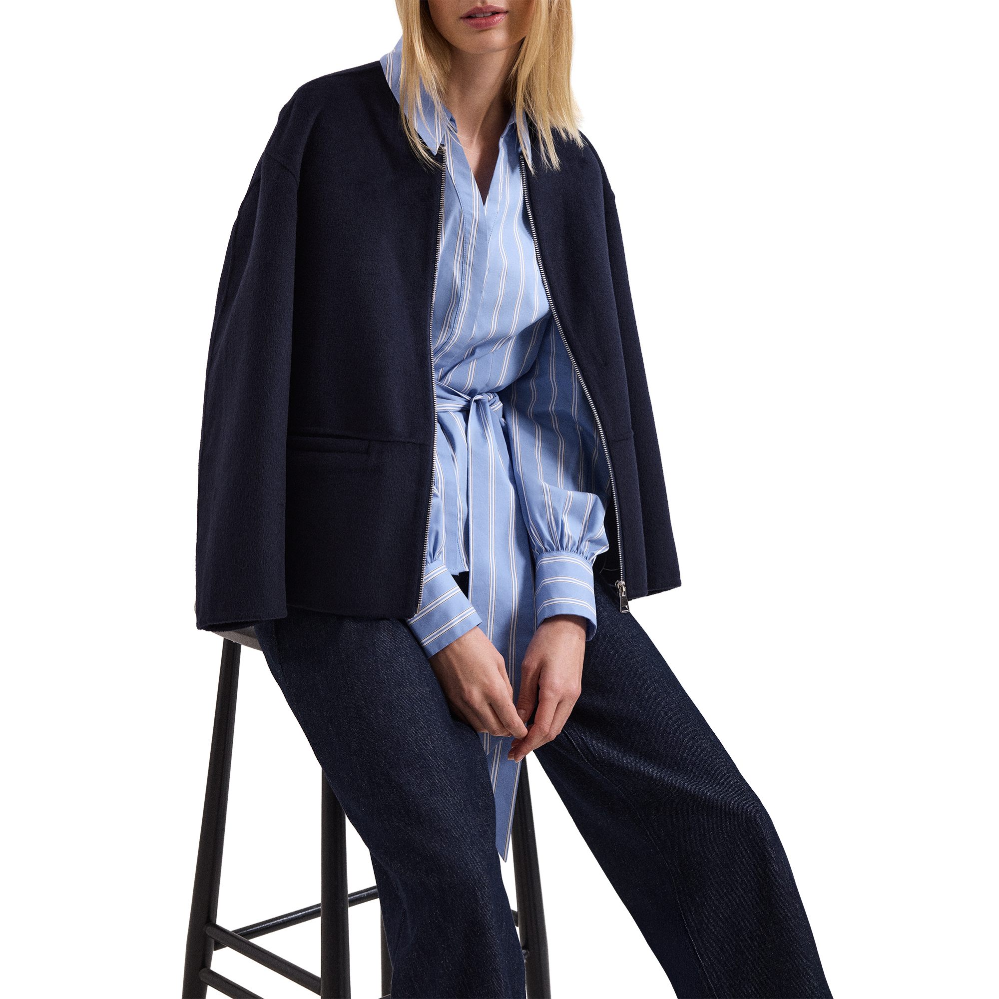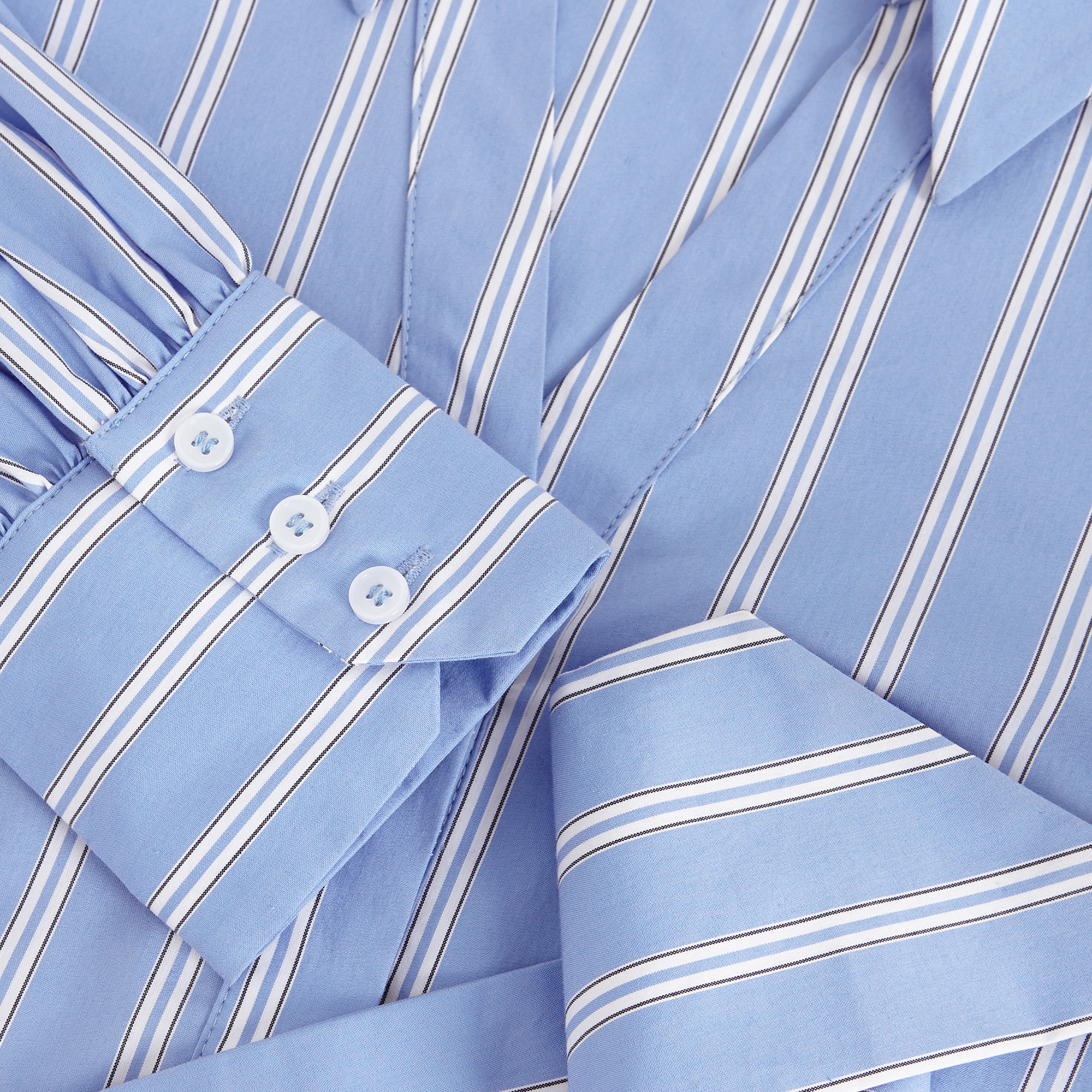- Striped, structured darting, hidden button fastenings, matching tie belt, long sleeves
