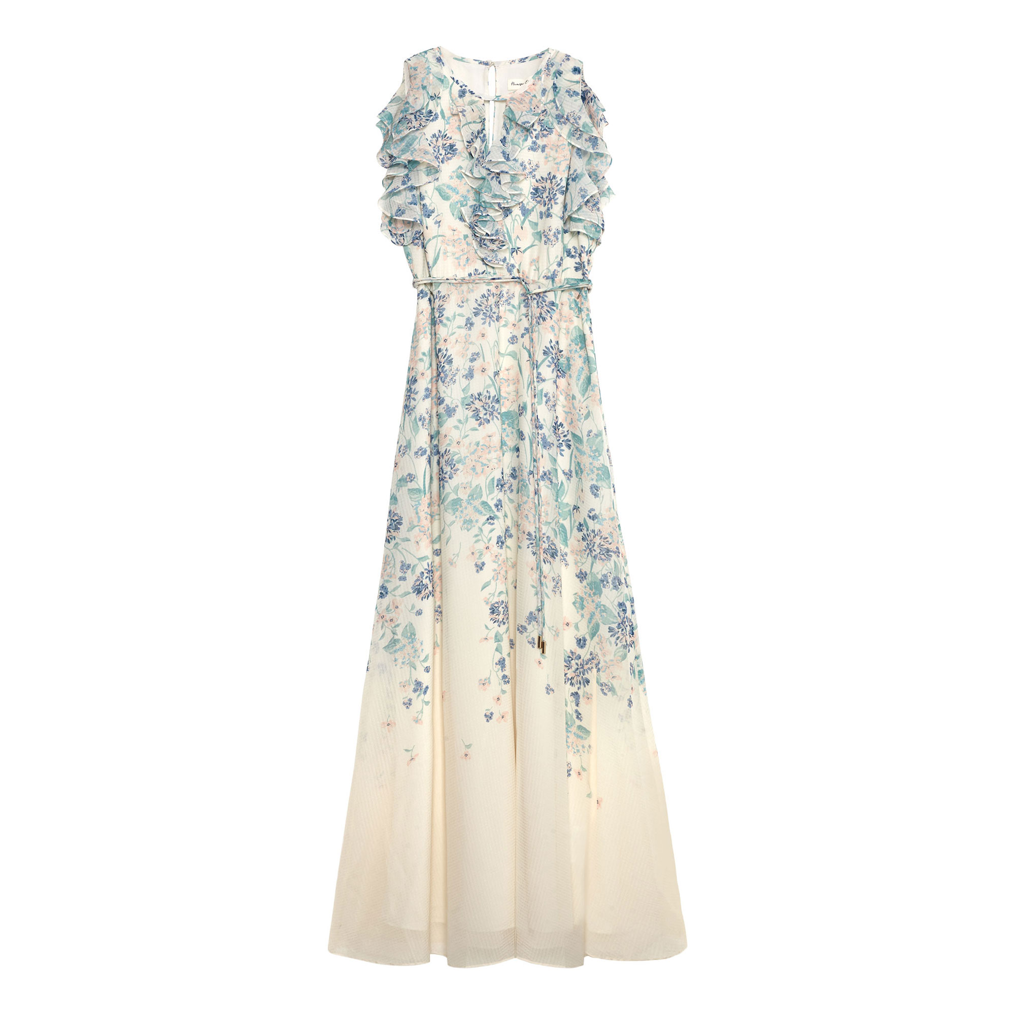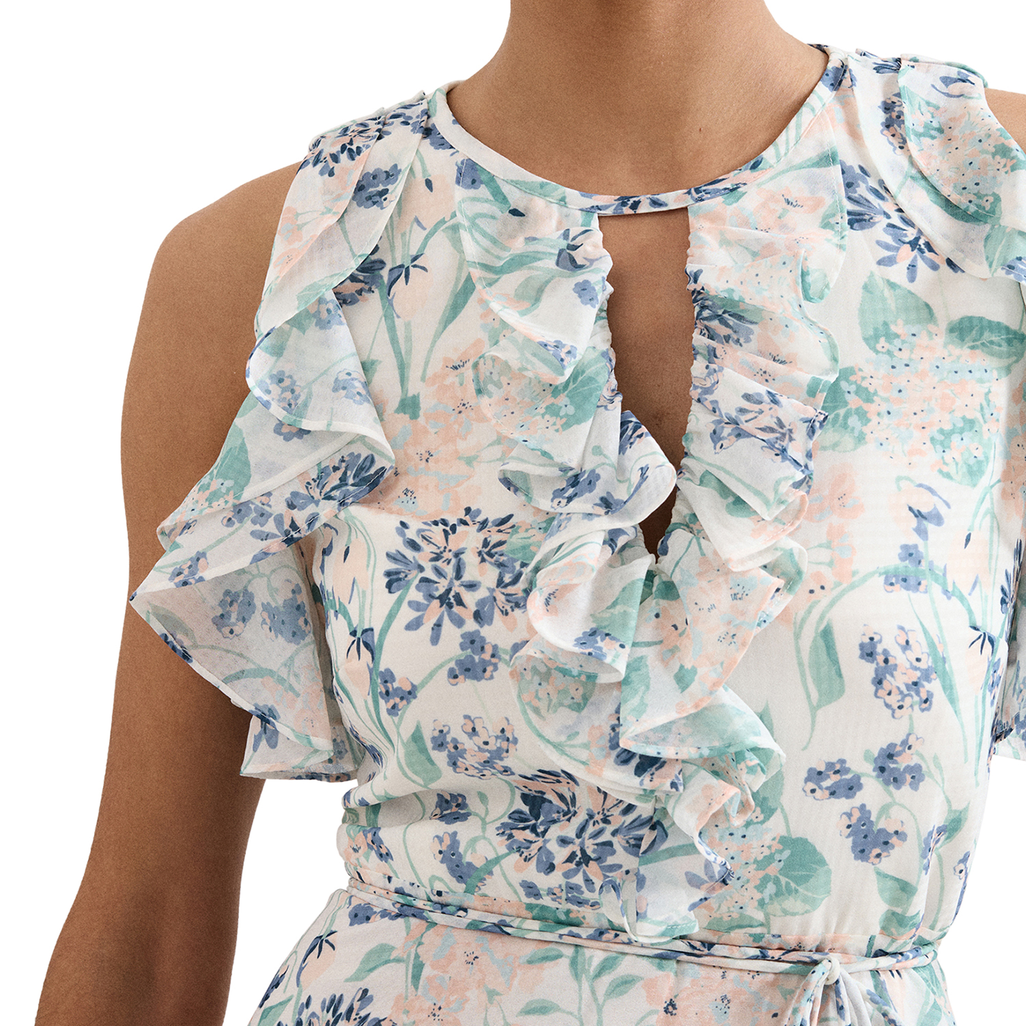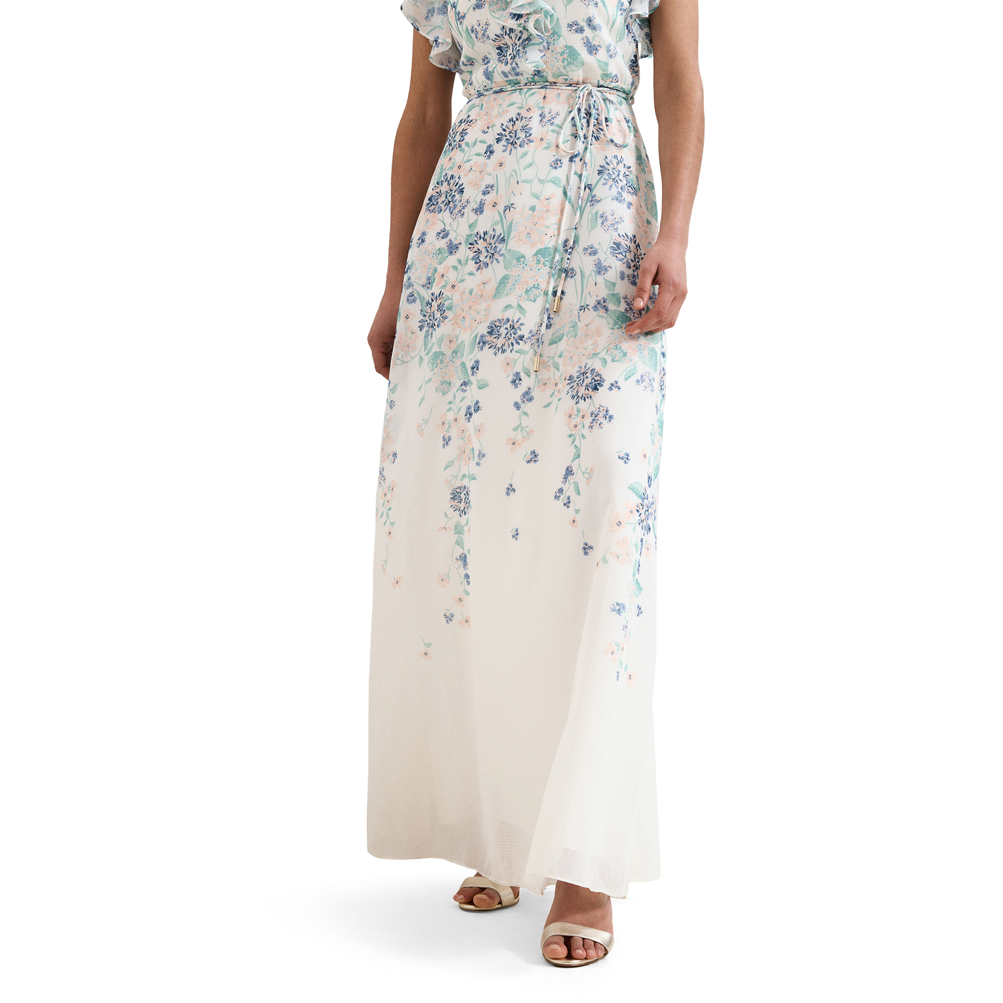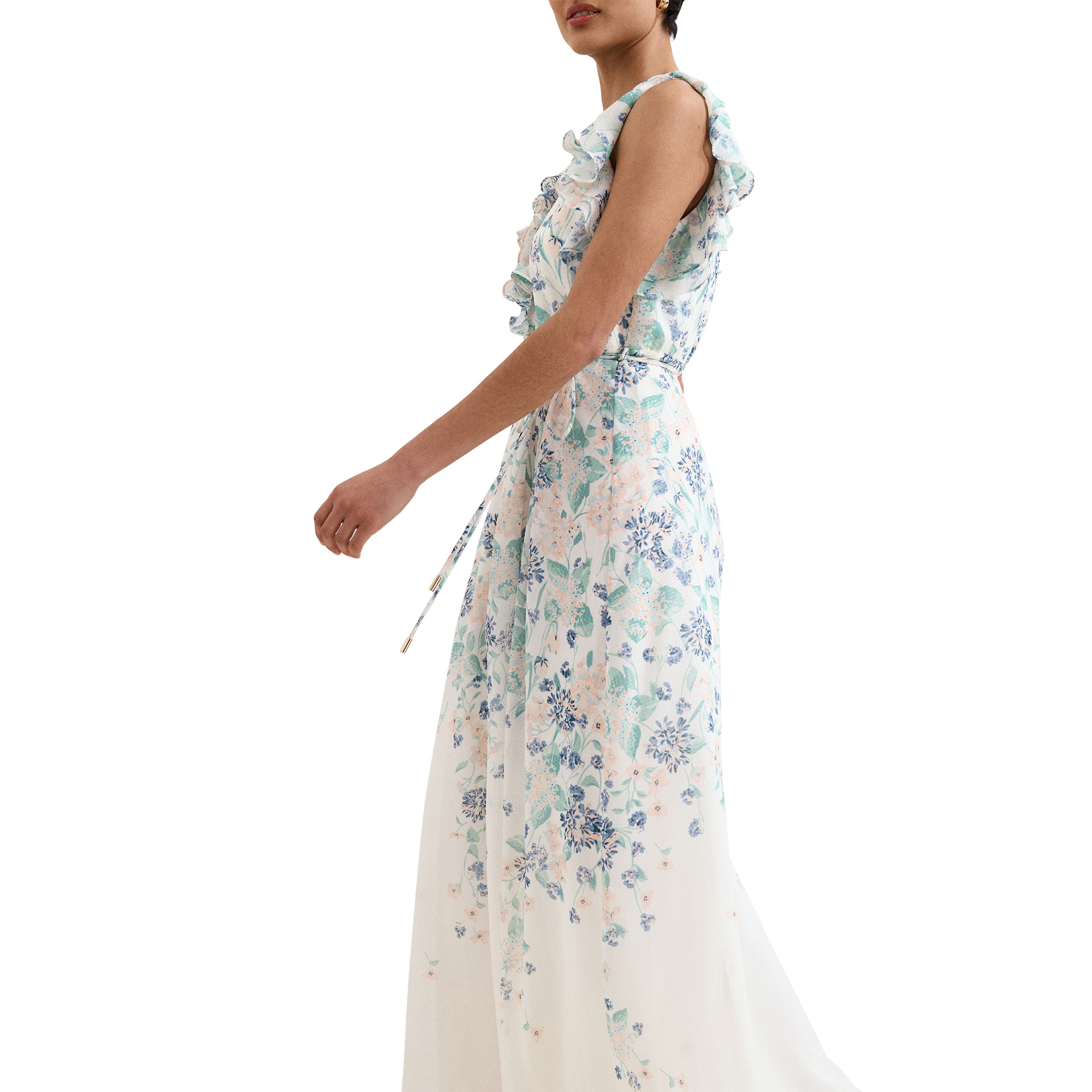 • Sleeveless, maxi silhouette, ruffle detailing, floral print, tie belt, concealed zip fastening