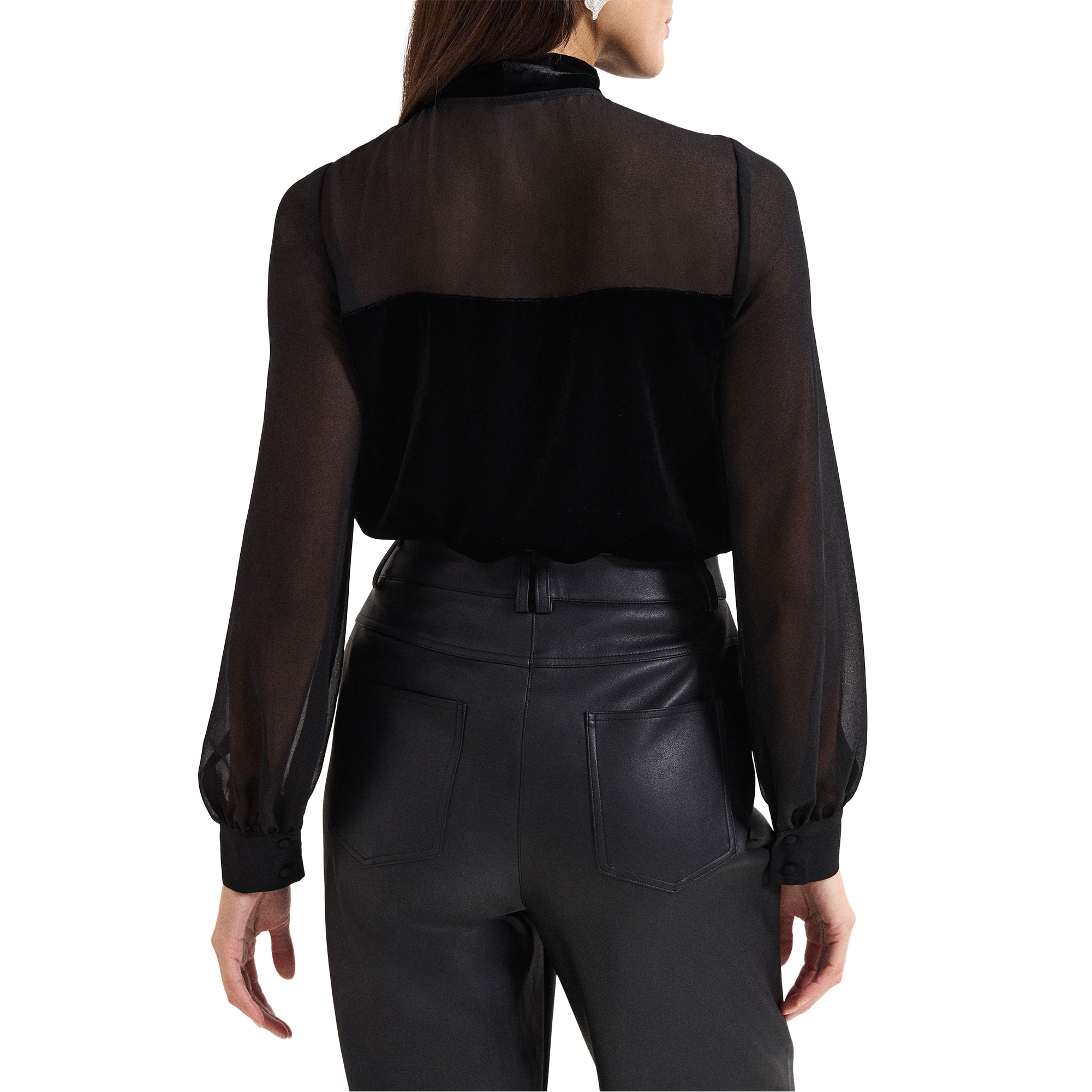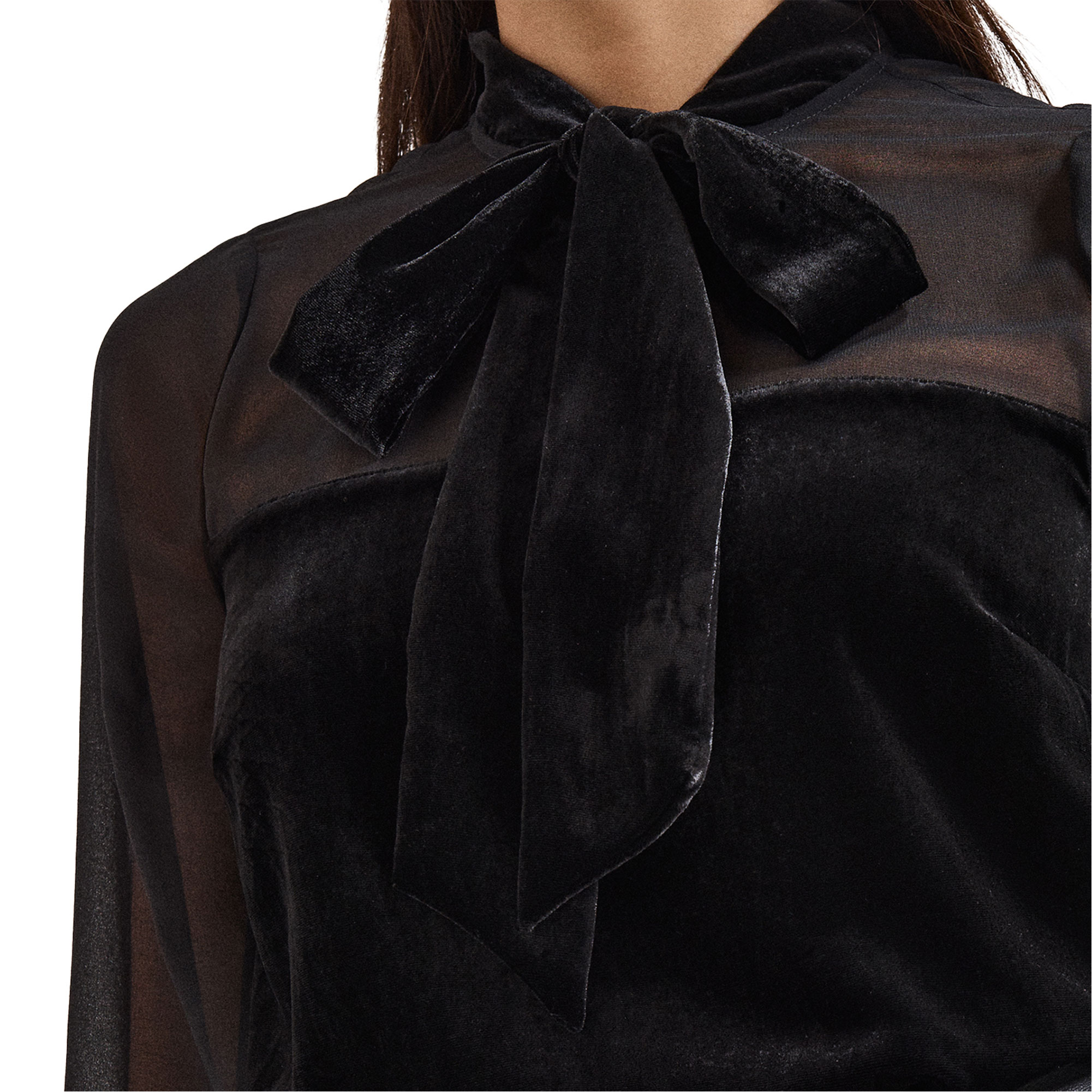 - Velvet fabric, long sleeves, semi-sheer yoke and sleeves, pussybow detail tie