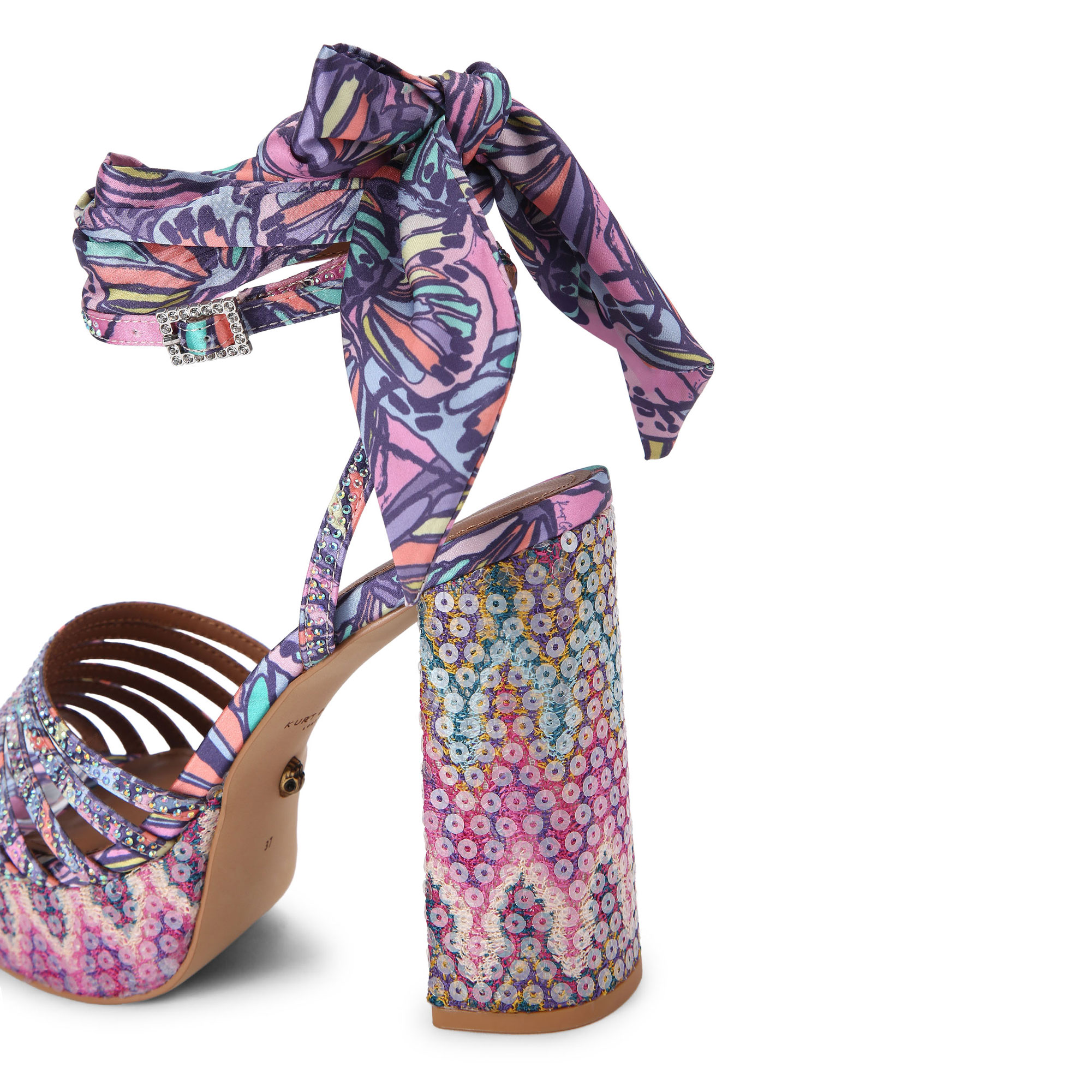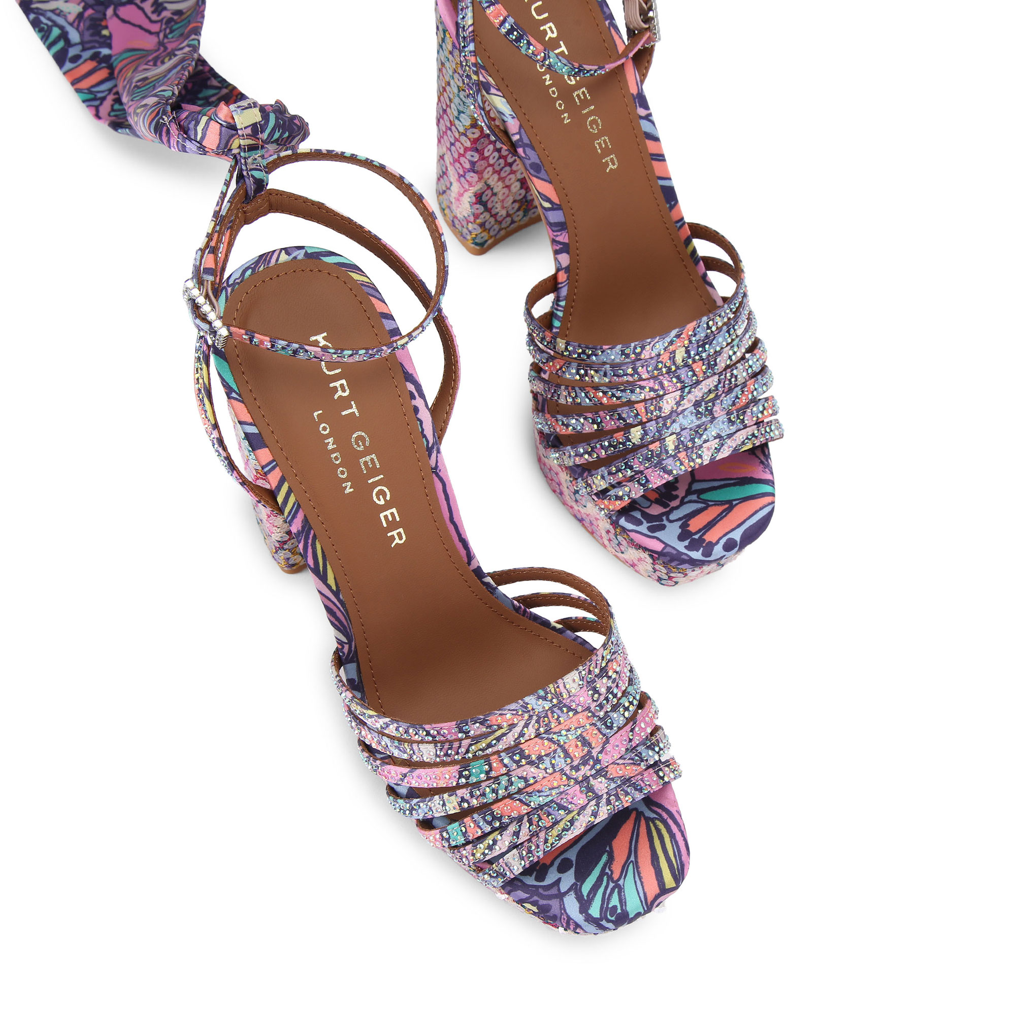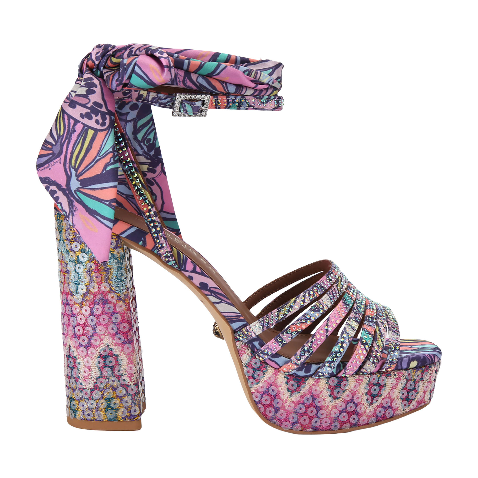 • Butterfly and Ikat print, sequin embellishment, platform sole and block heel, ankle strap also features a matching butterfly printed scarf