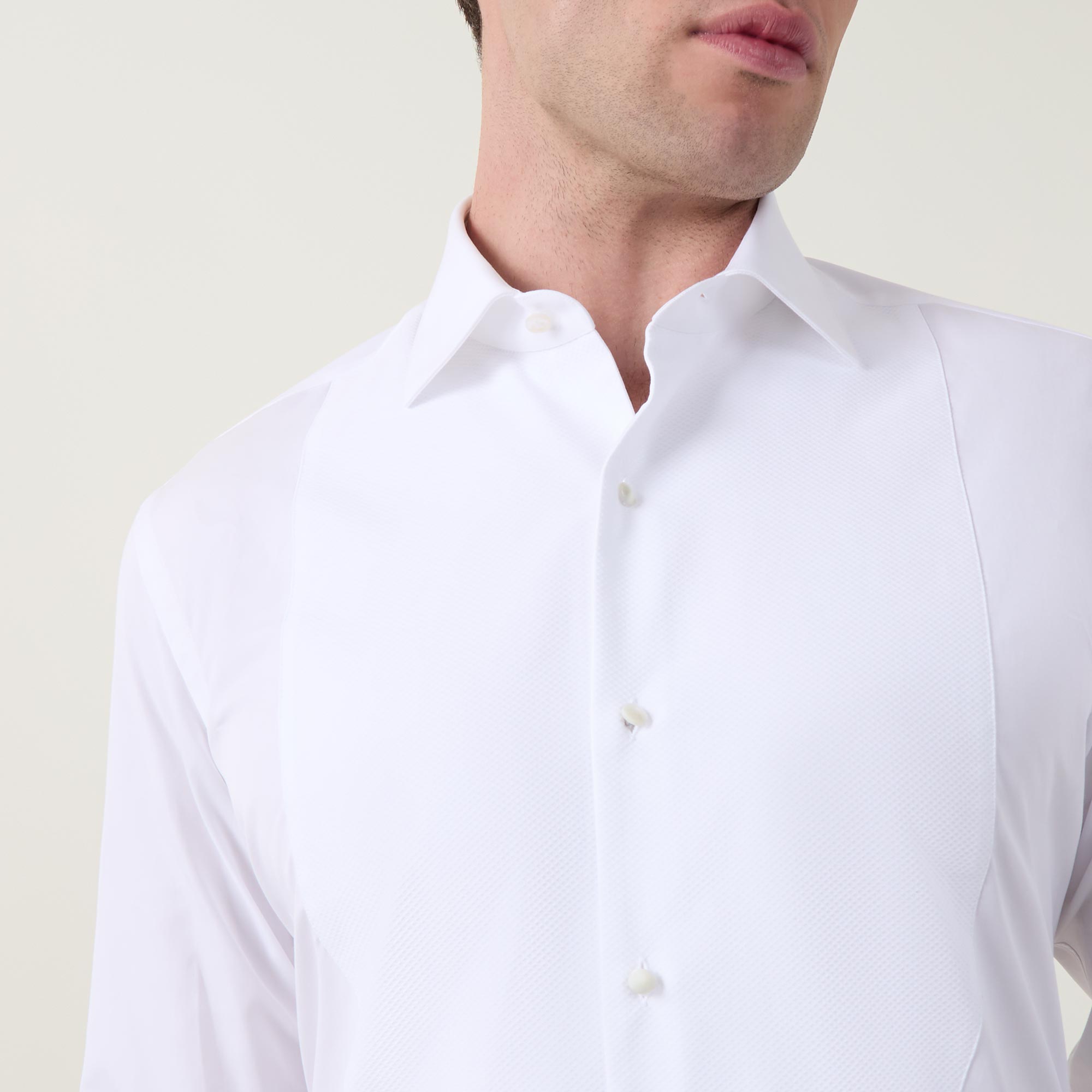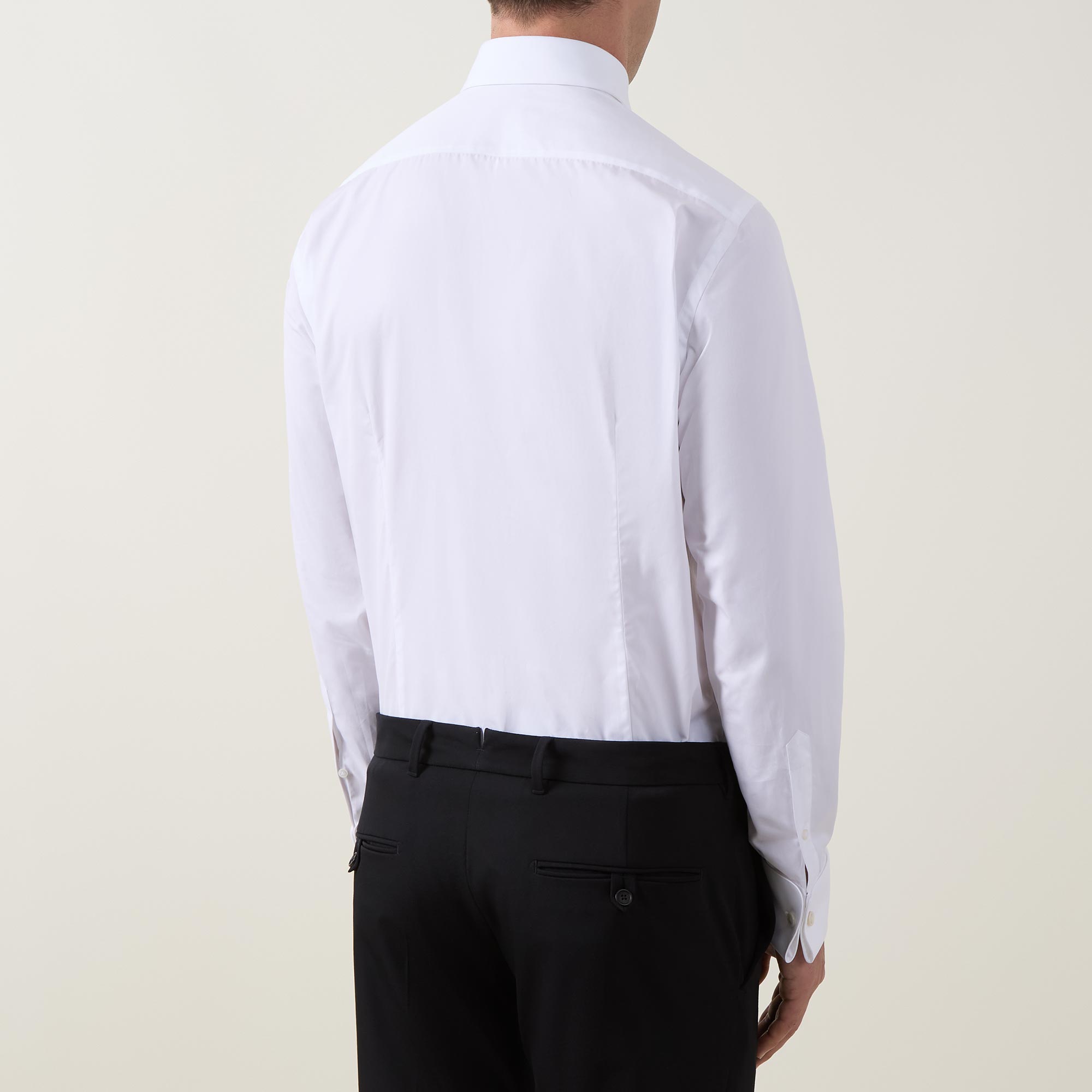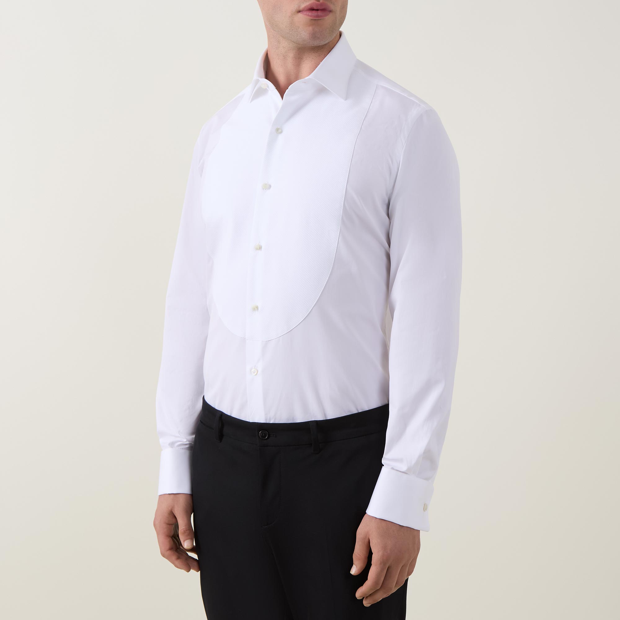 - Point collar, long sleeves, double cuffs, front button fastening, curved hem, bib detail, crisp finish