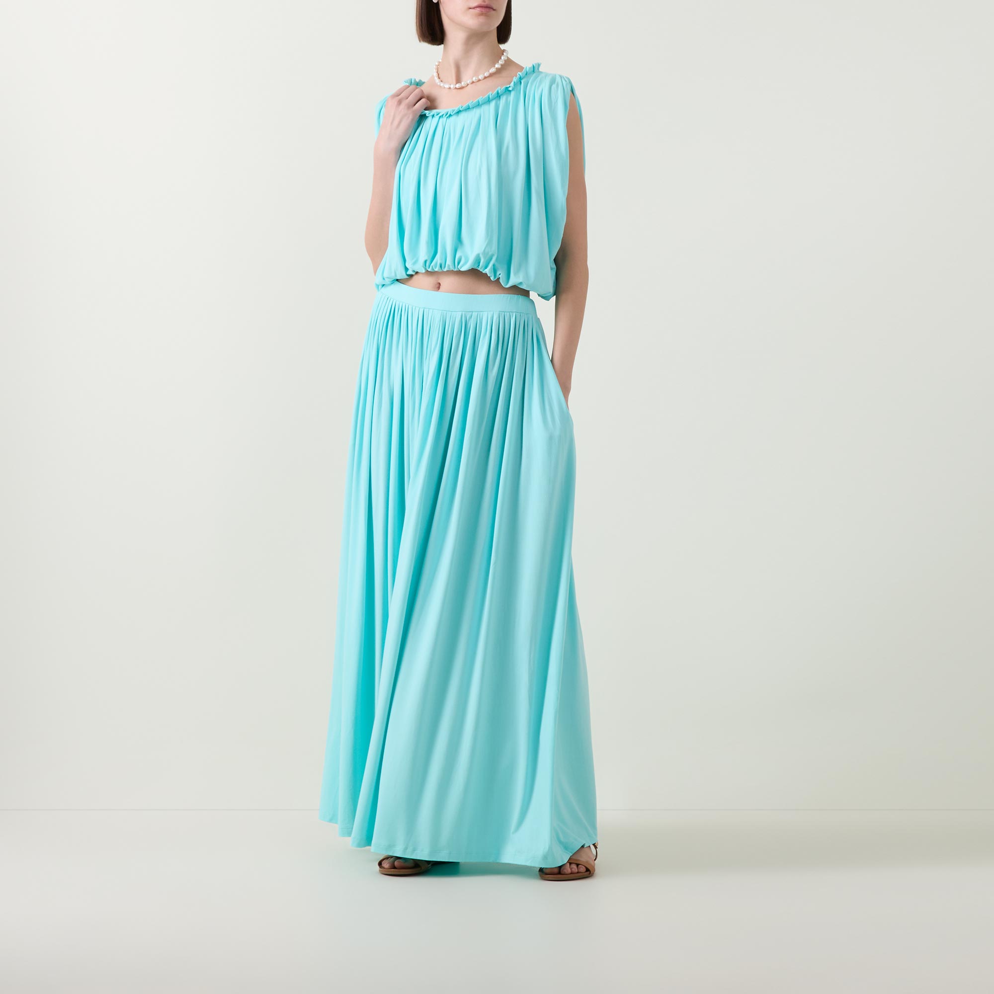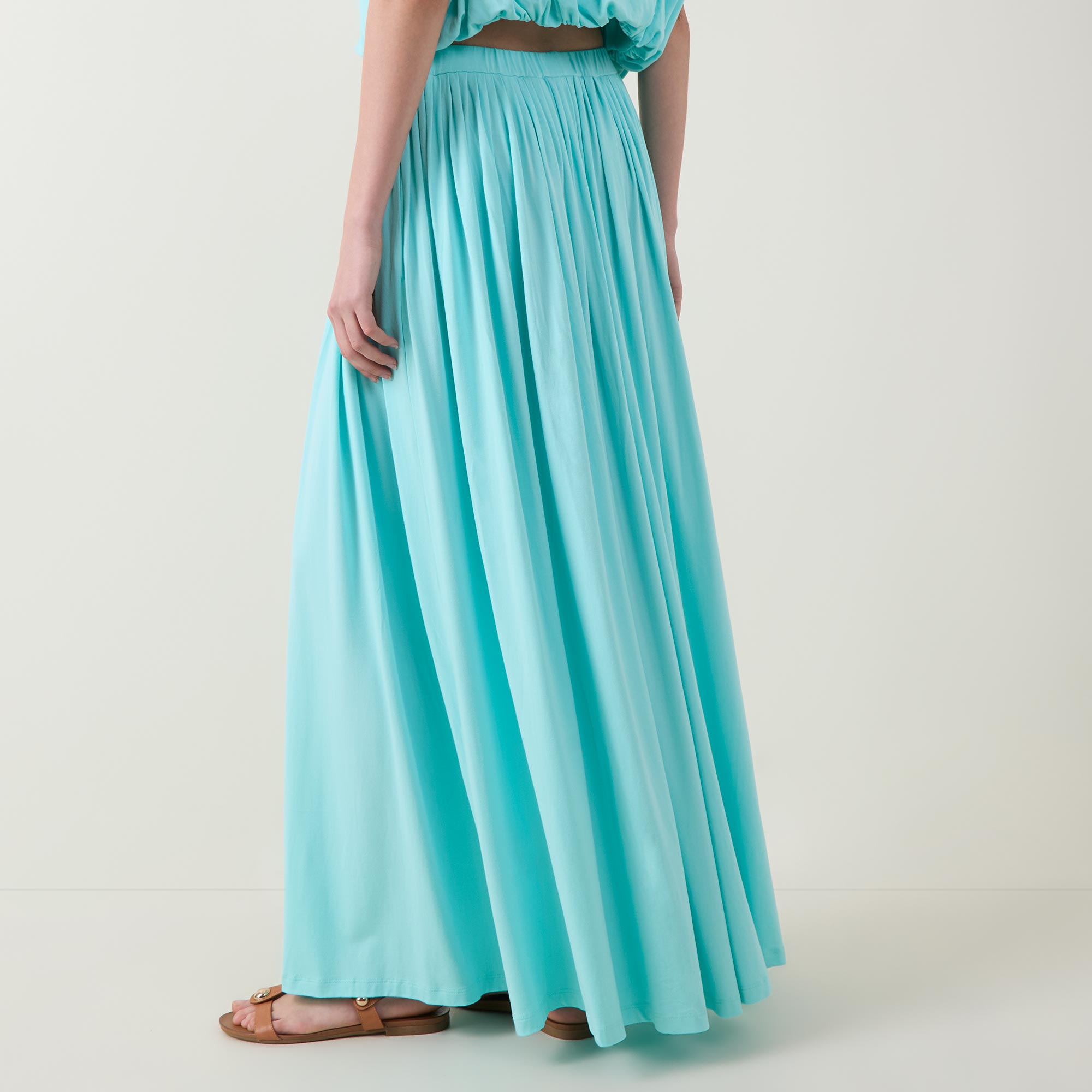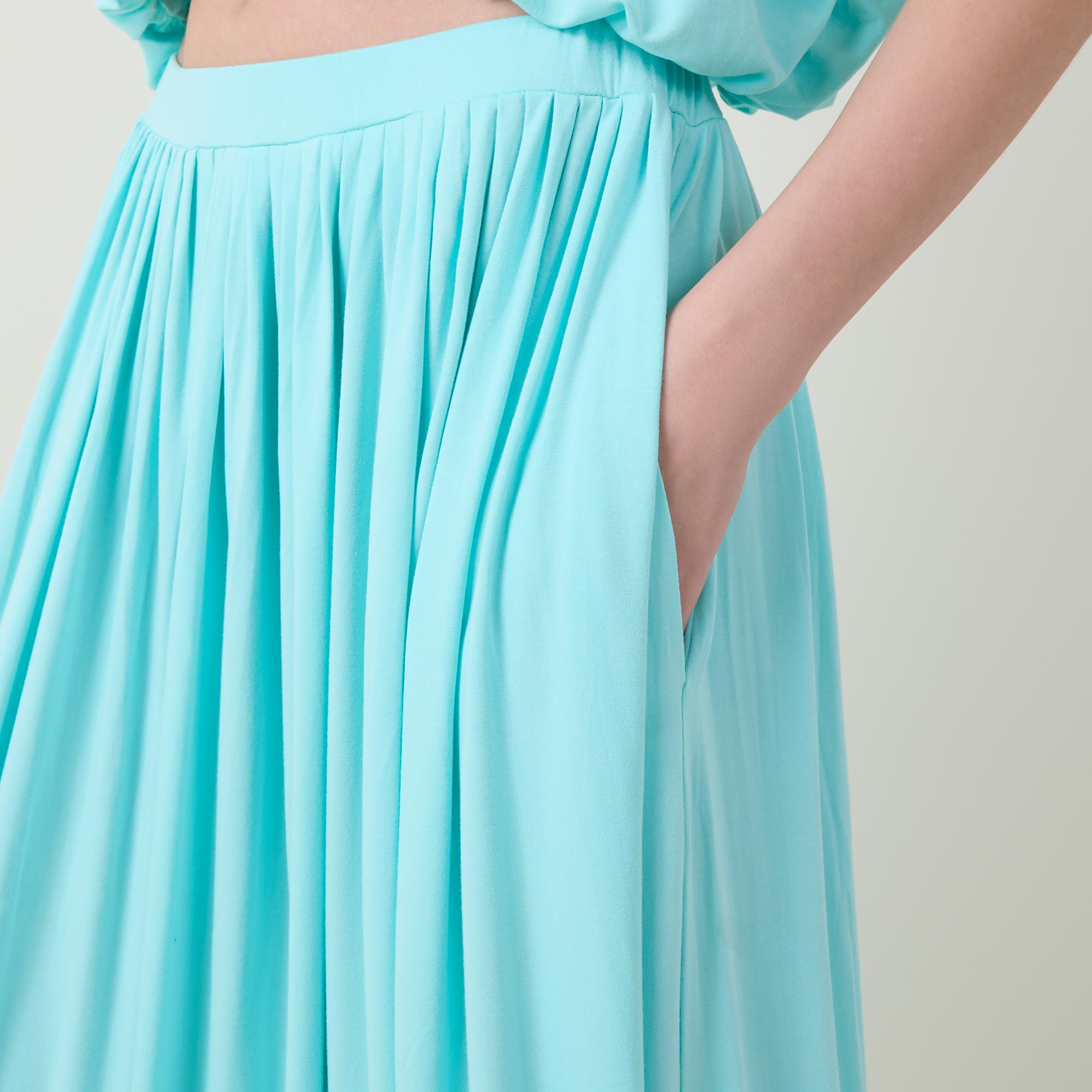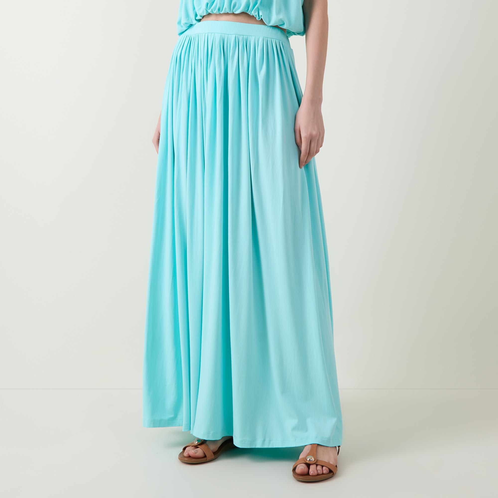 - Maxi length, elasticated waistband, pleated details