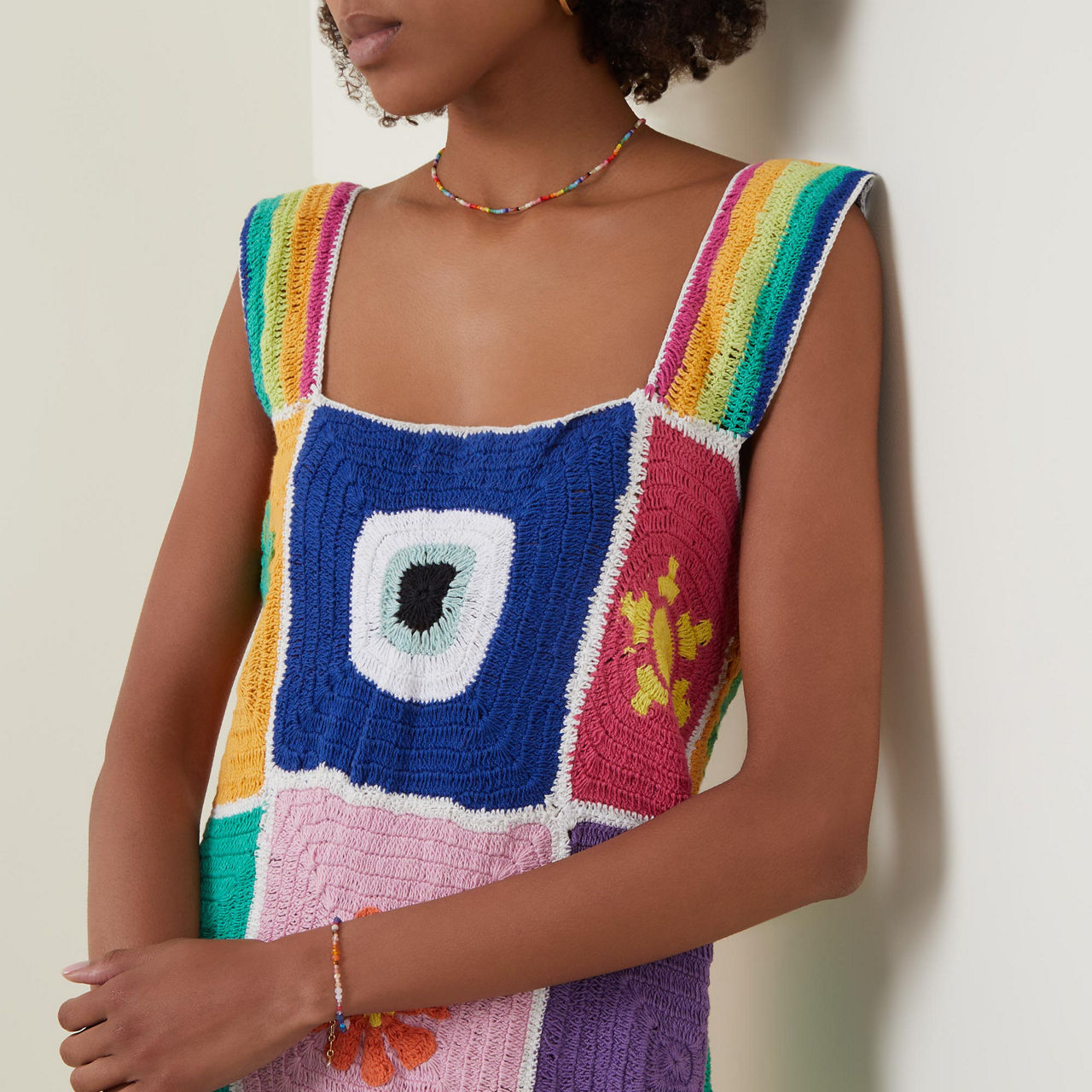 - Sleeveless, wide straps, square neckline, woven crochet design, contrasting colours, textured finish